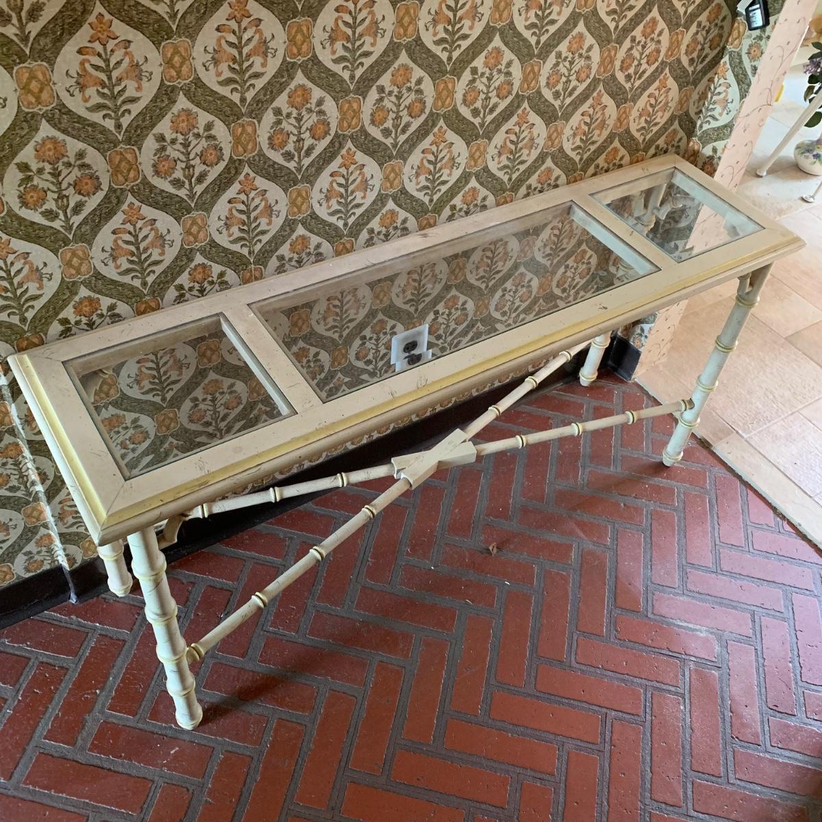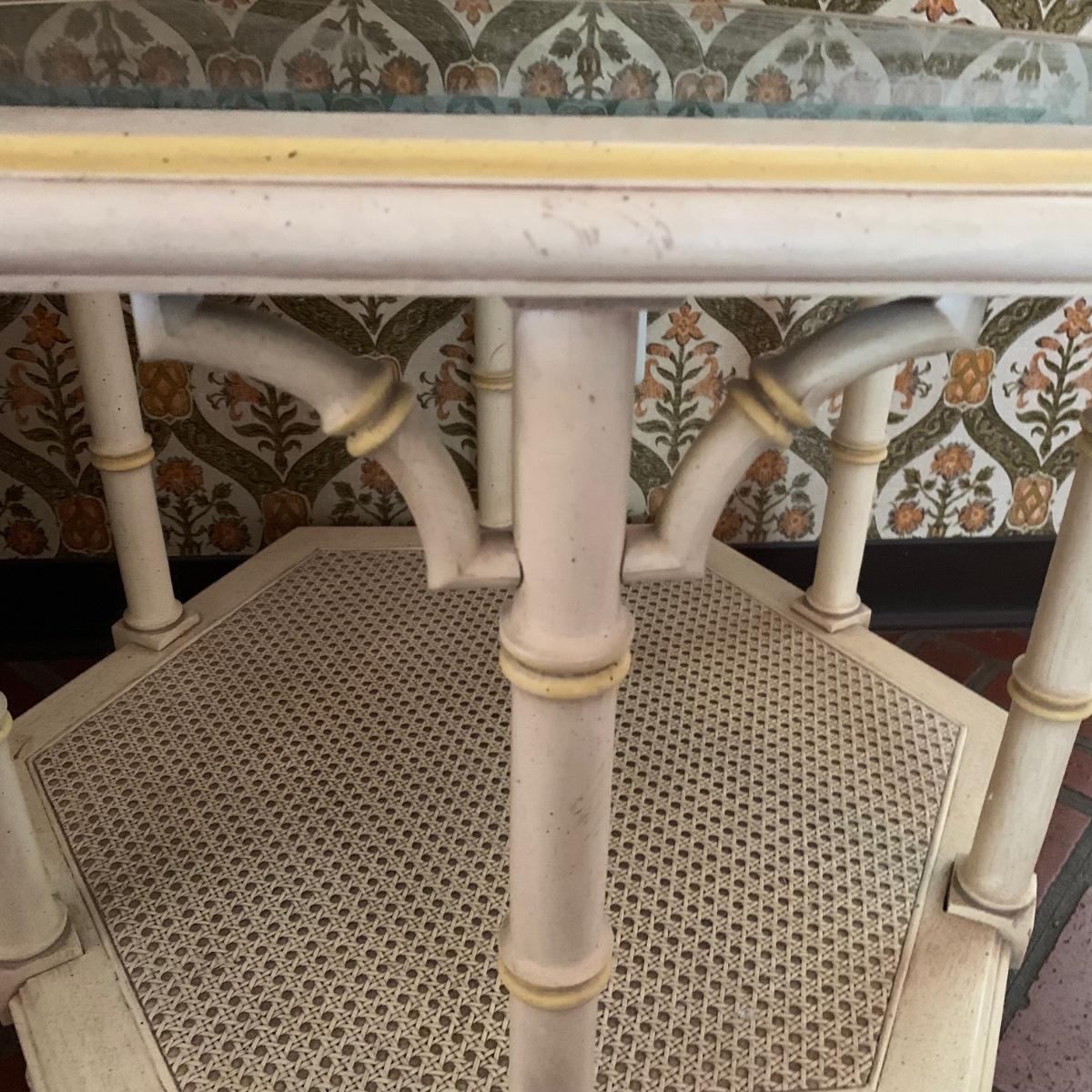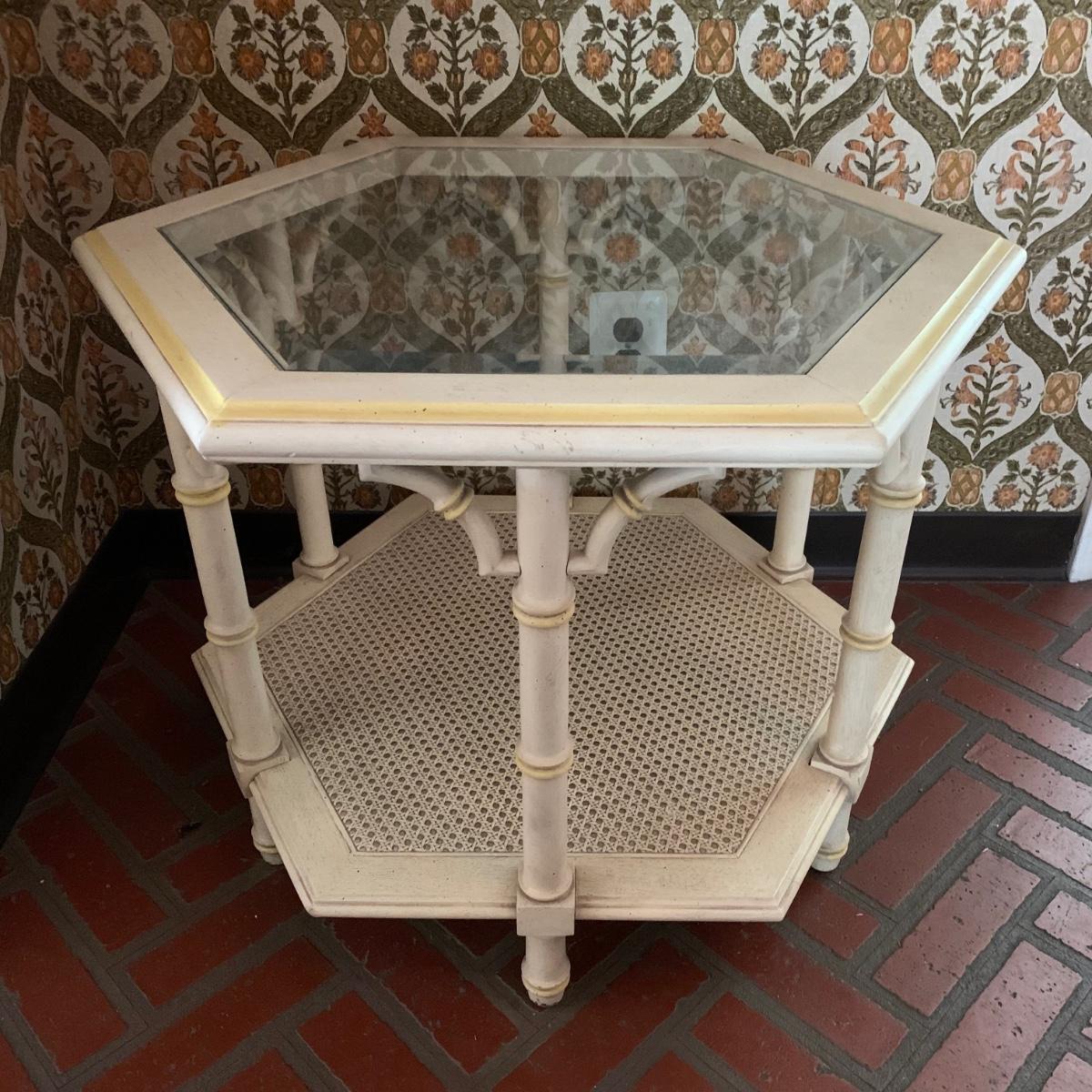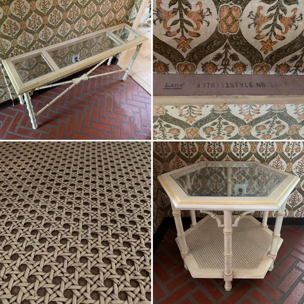 LOT 98 L: Vintage 1960's Lane Faux Bamboo Console Table & Hexagonal Cane & Faux Bamboo Side Table