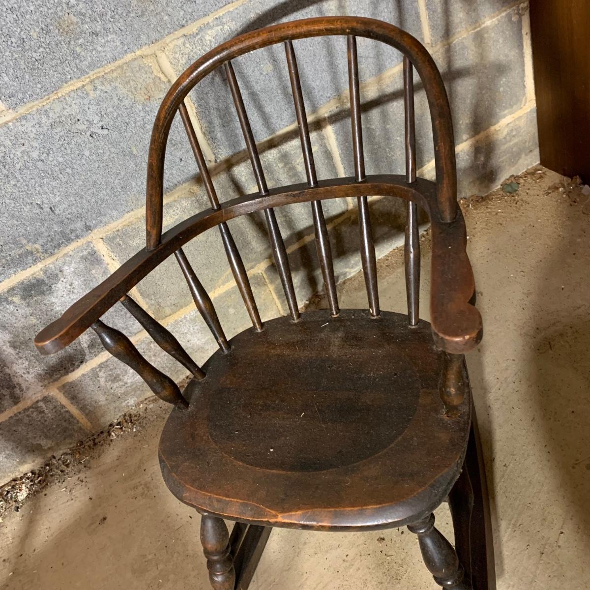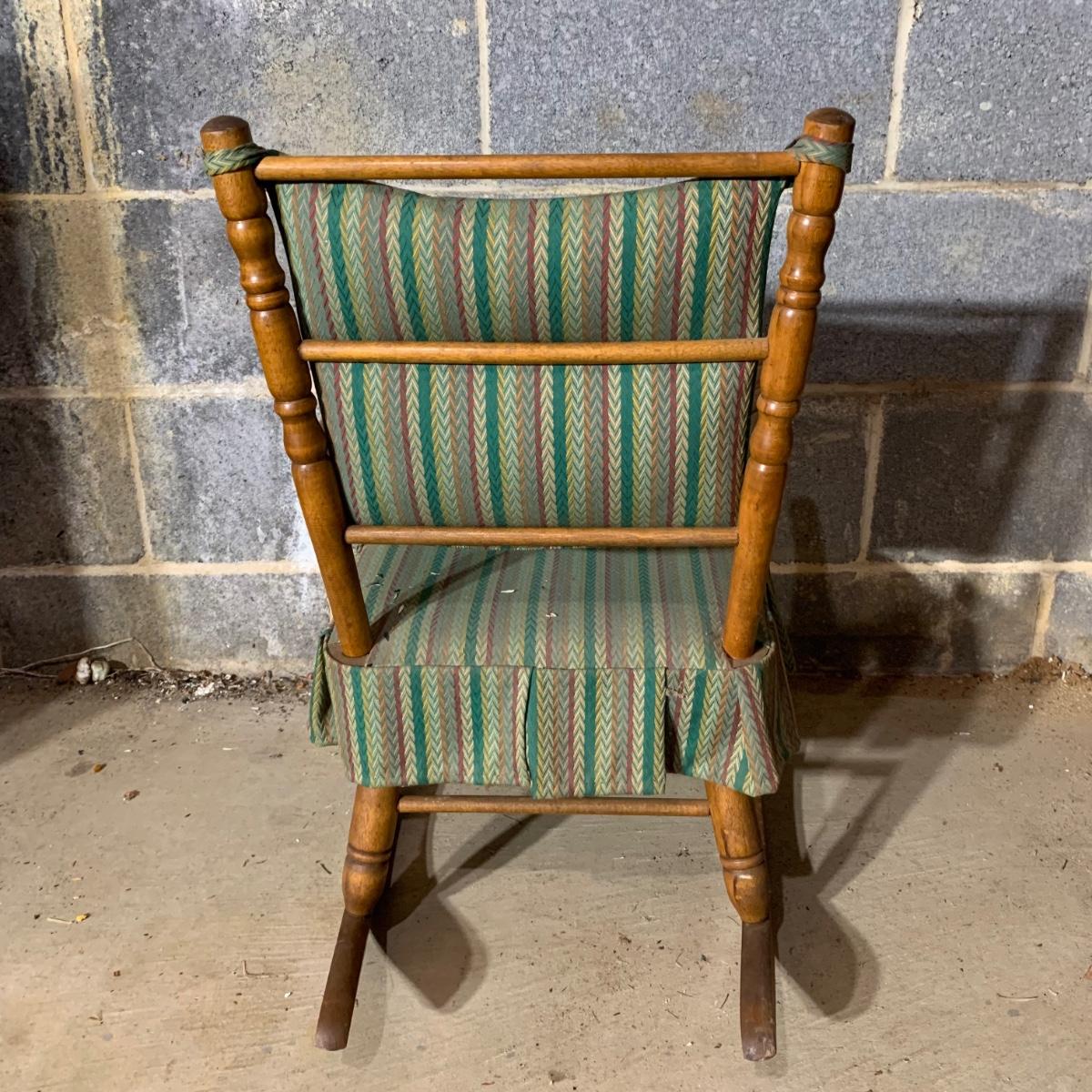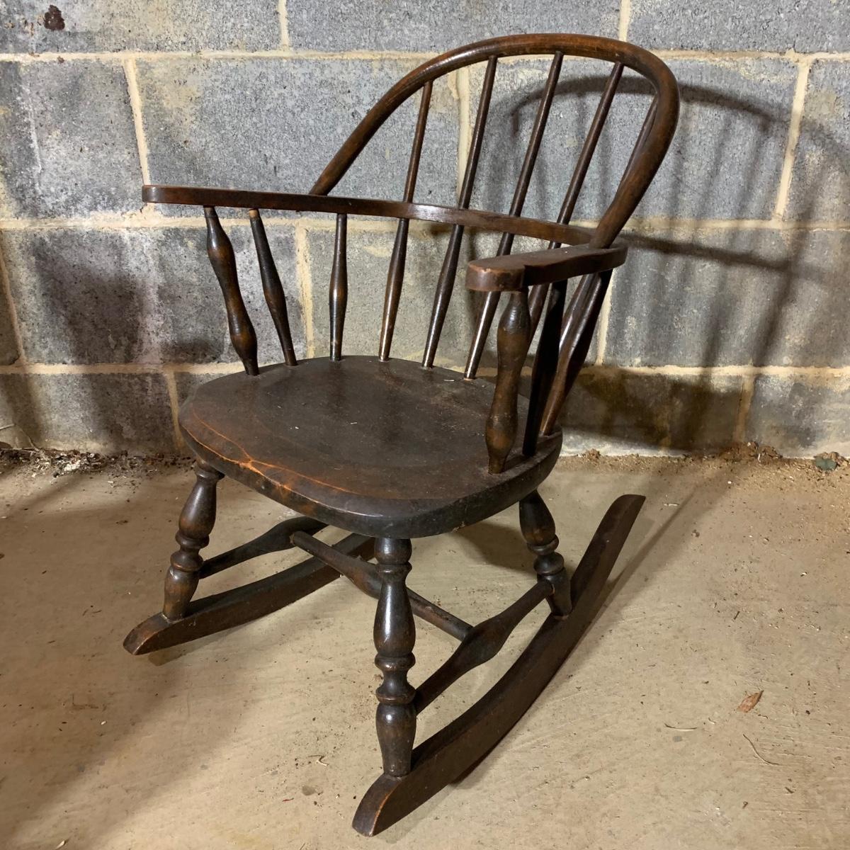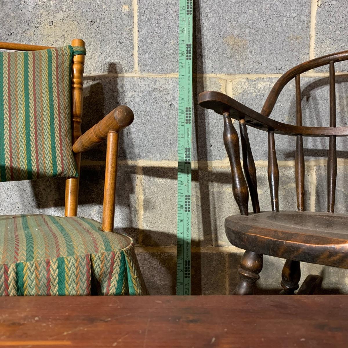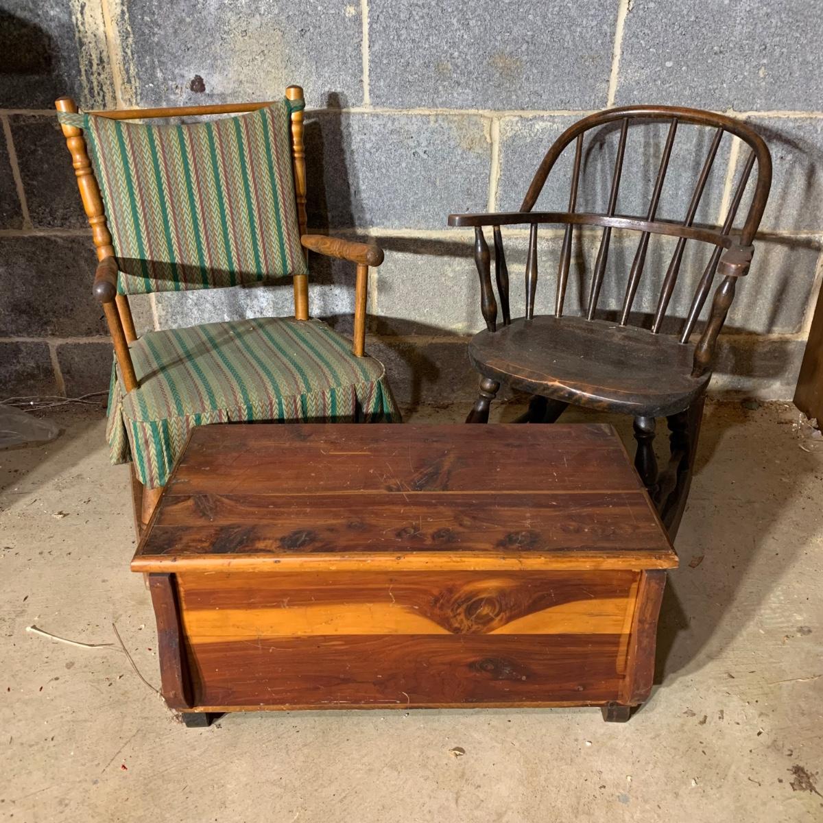 LOT 112 B: Vintage Frank Wisig Chest, Matilda Round Back Spindle Children's Rocking Chair, & Cricket Style Ladder Back Children's Rocking Chair