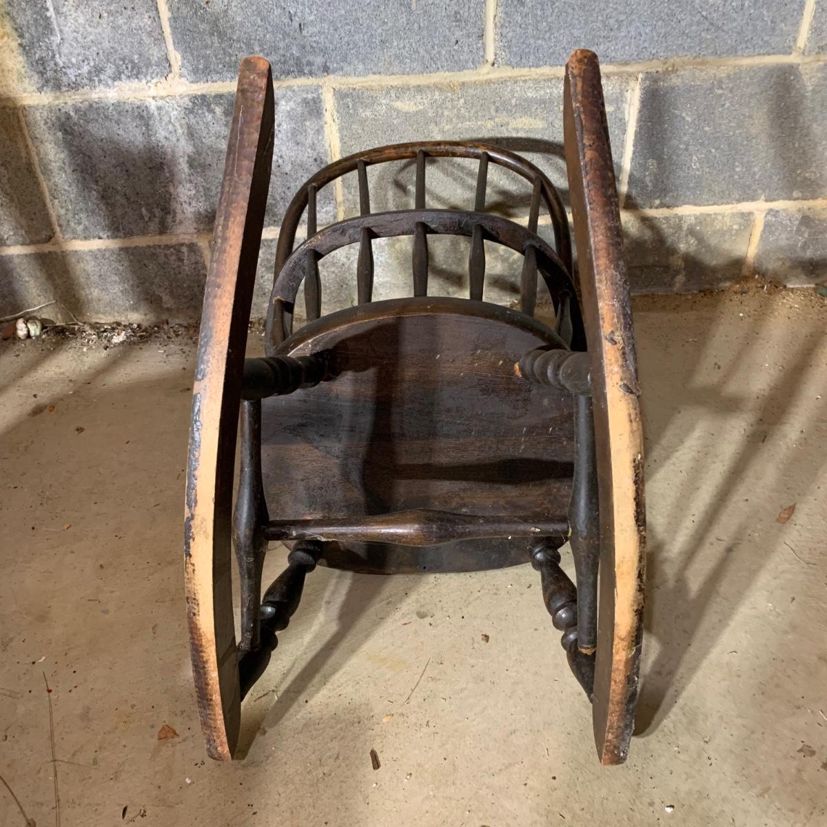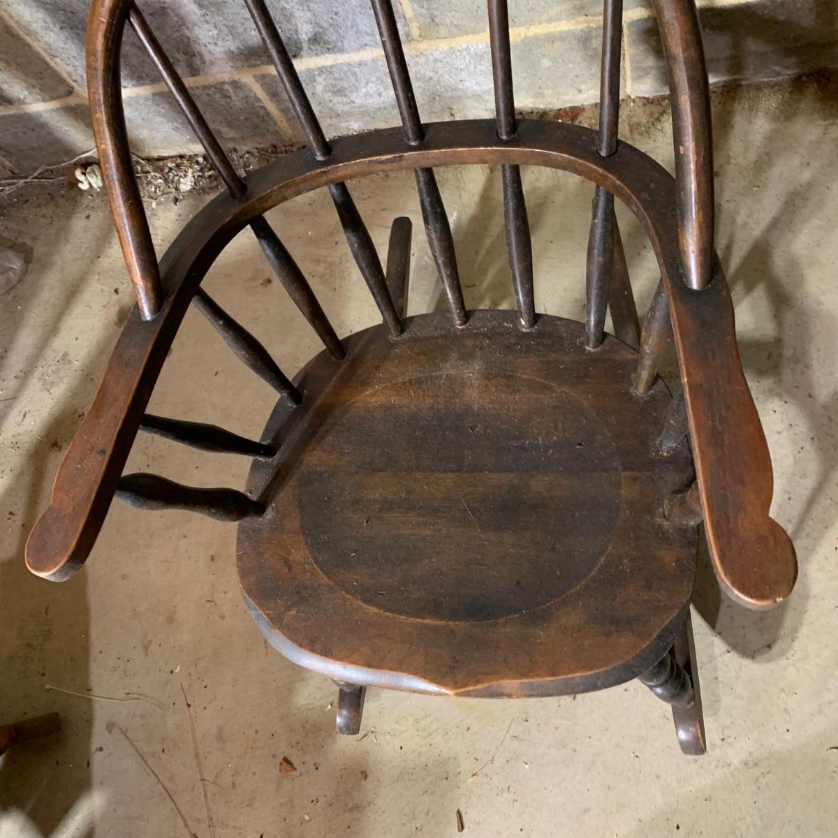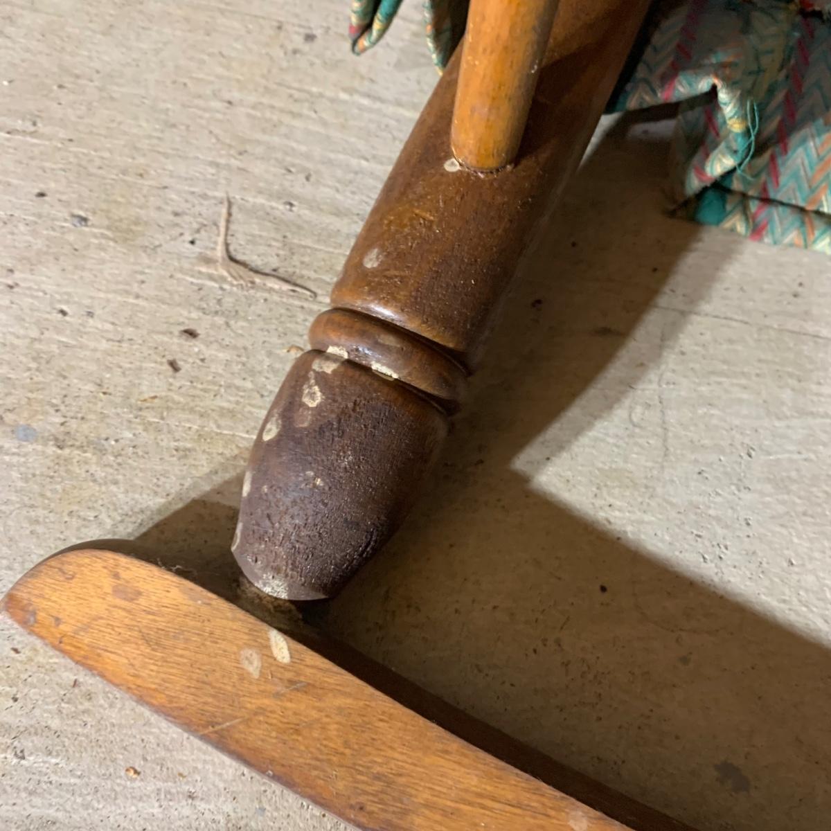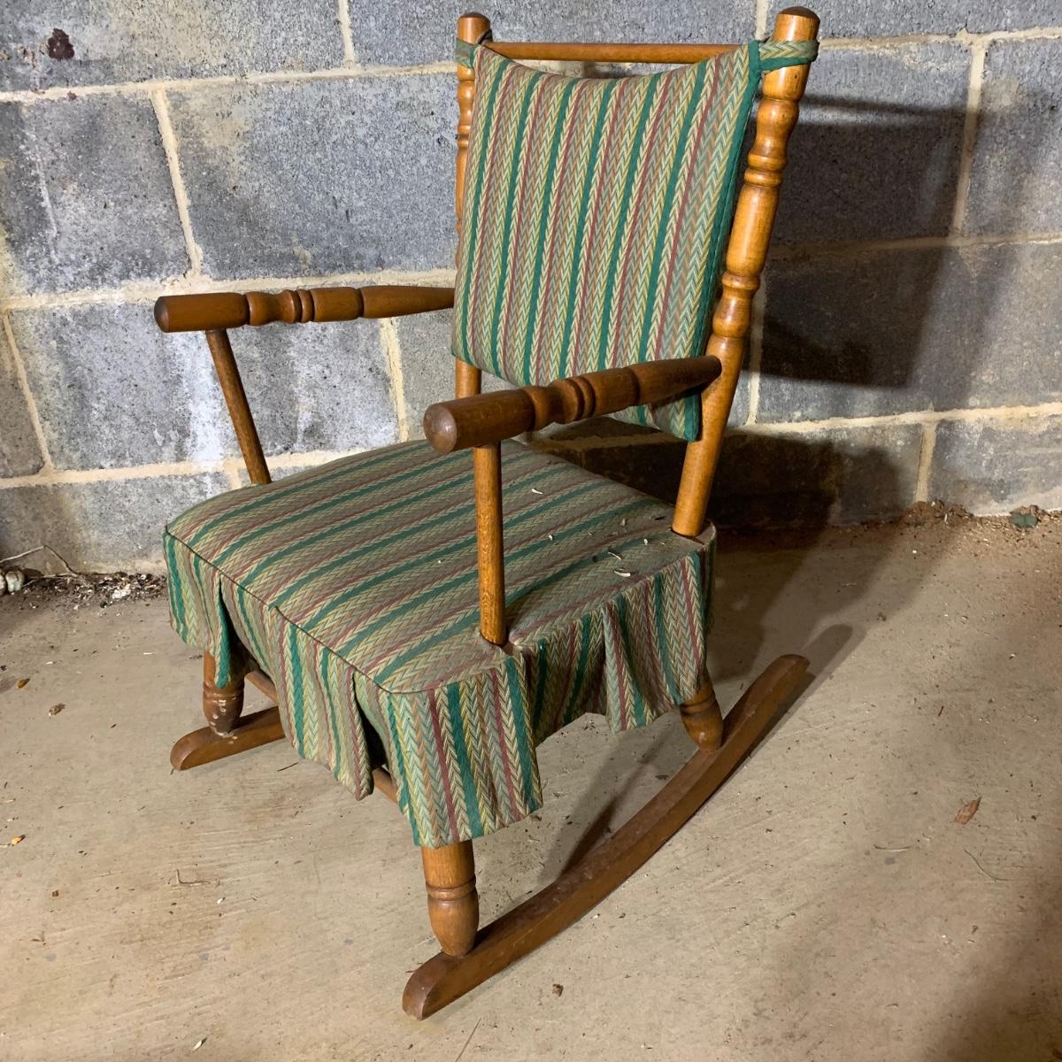 LOT 112 B: Vintage Frank Wisig Chest, Matilda Round Back Spindle Children's Rocking Chair, & Cricket Style Ladder Back Children's Rocking Chair