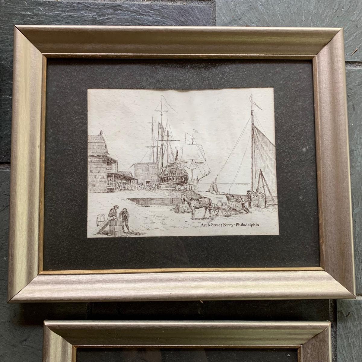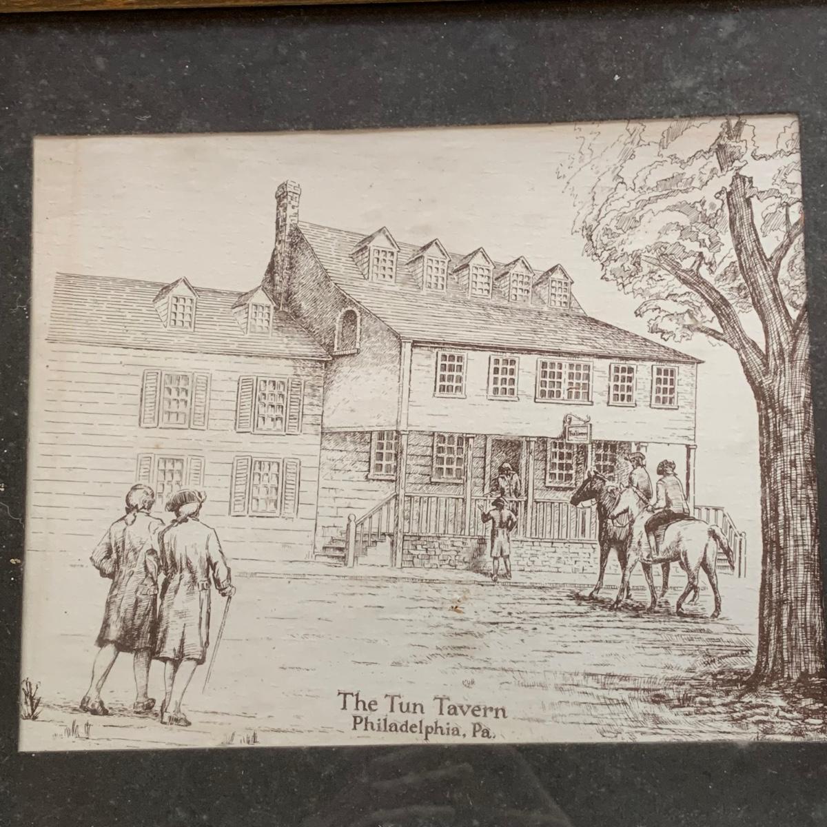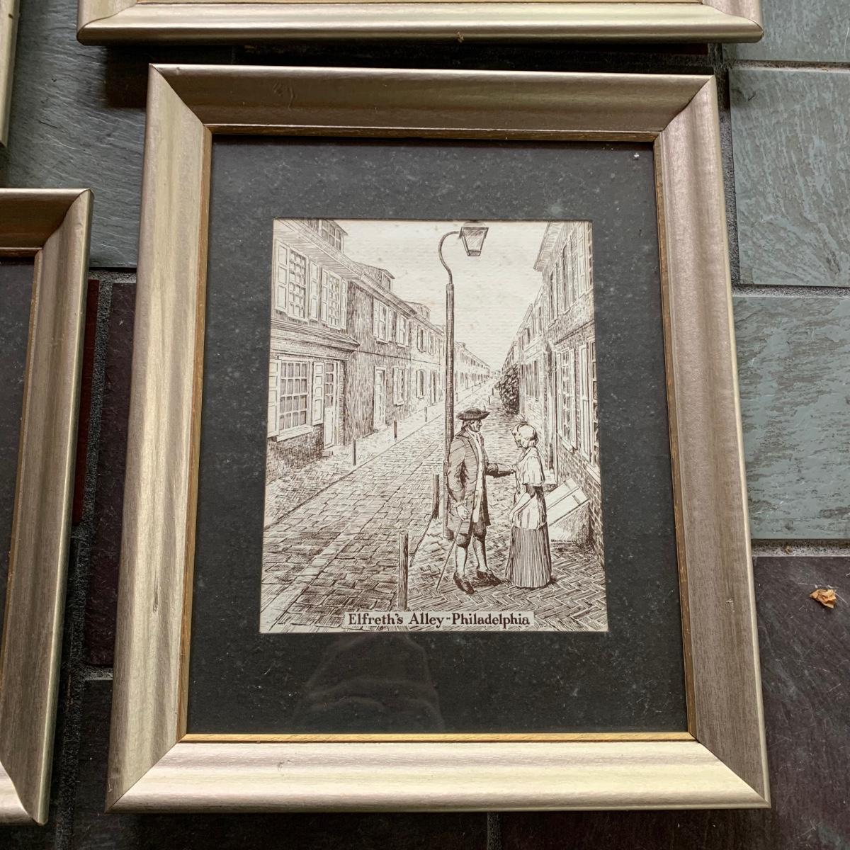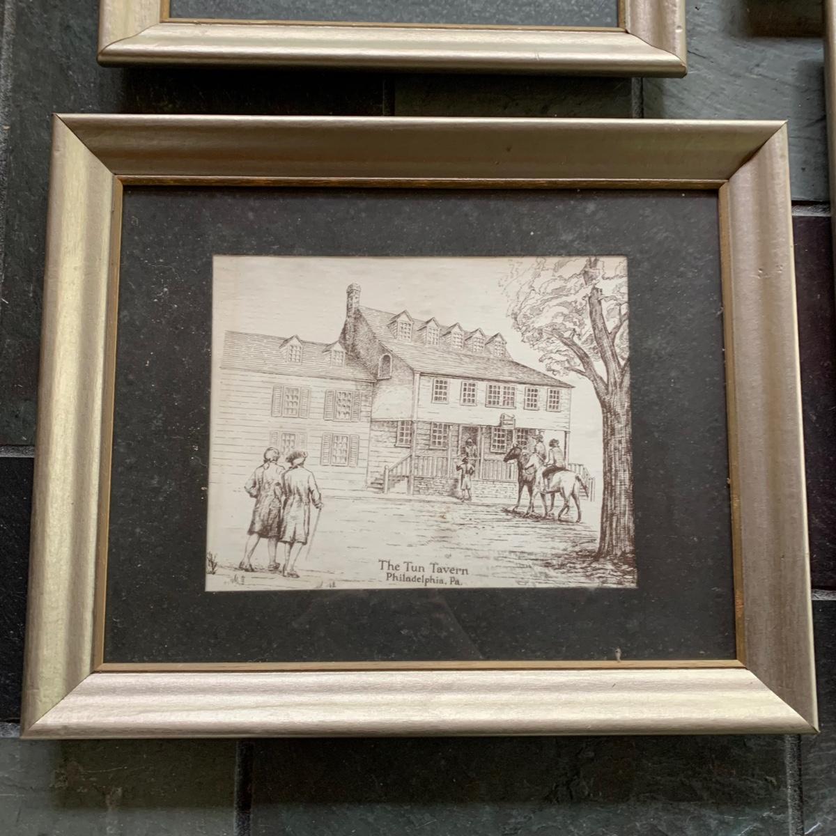LOT 120 B: Vintage Framed Historic Philadelphia Prints including Independence Hall, Arch Street Ferry, Elfreth's Alley, & The Tun Tavern