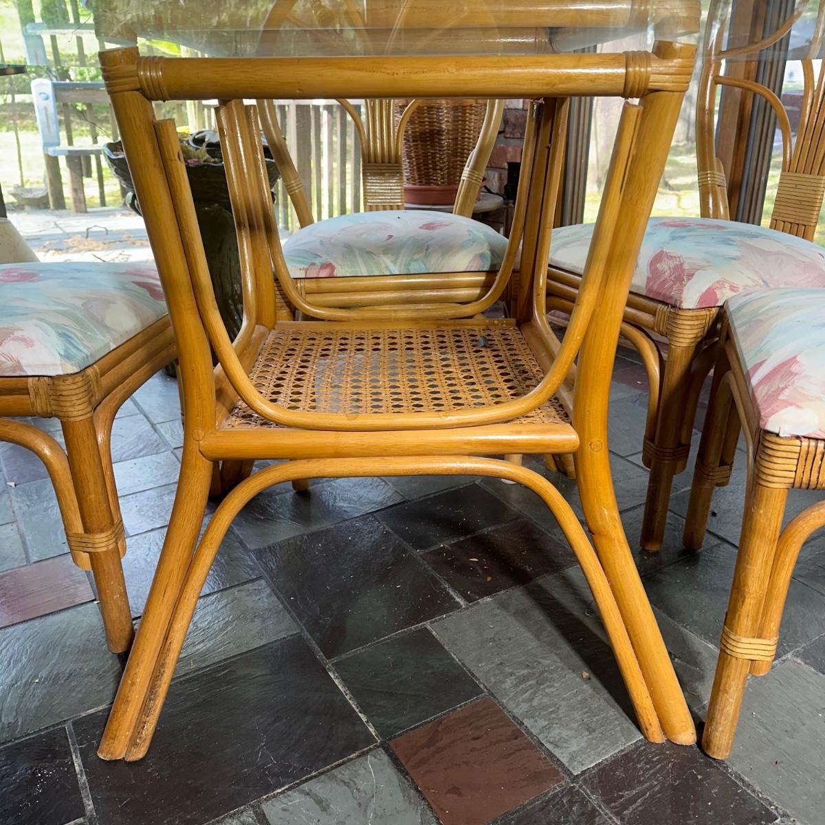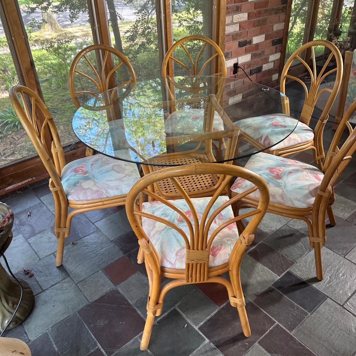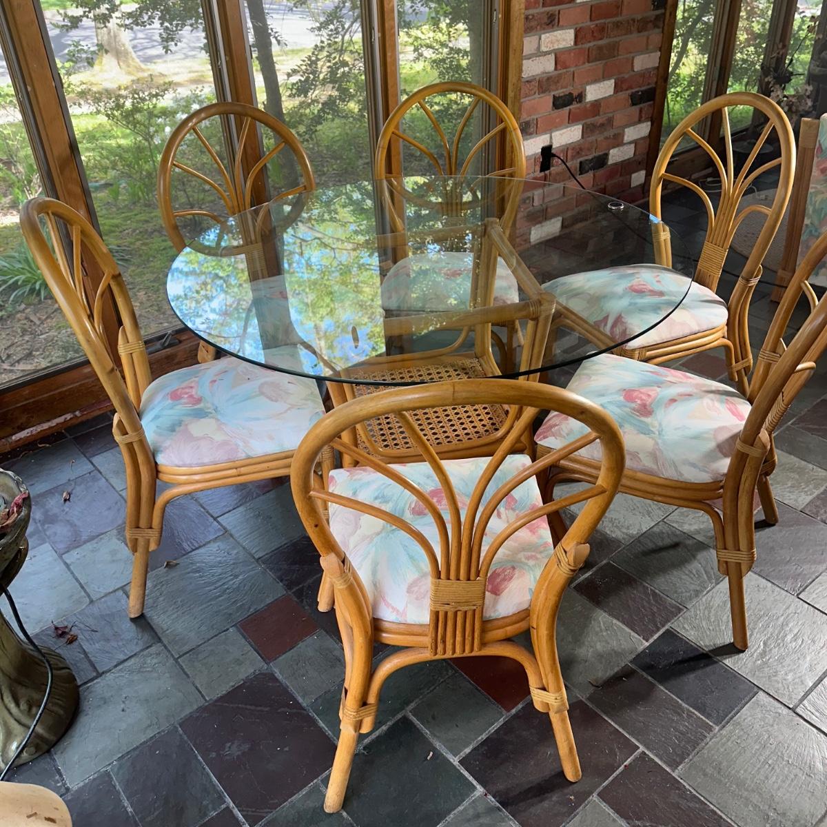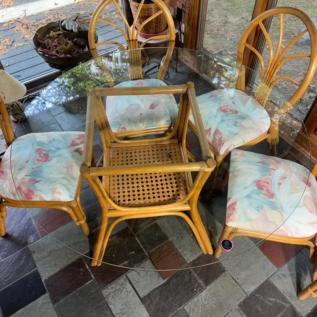 LOT 127P: Round Glass Top Rattan Dining Table & Chairs