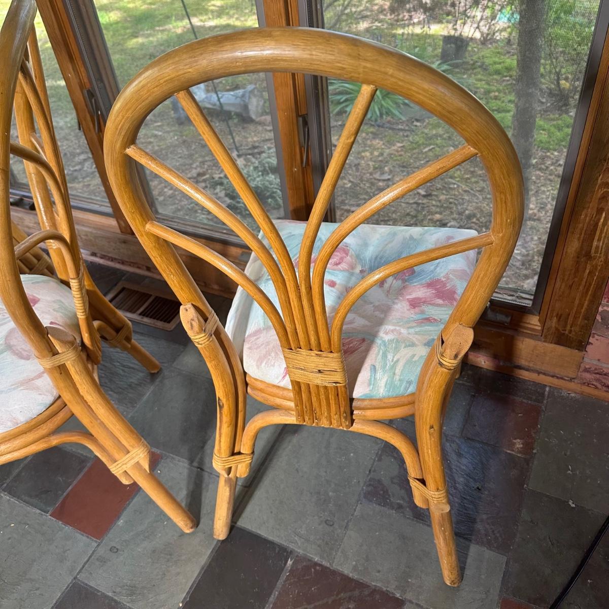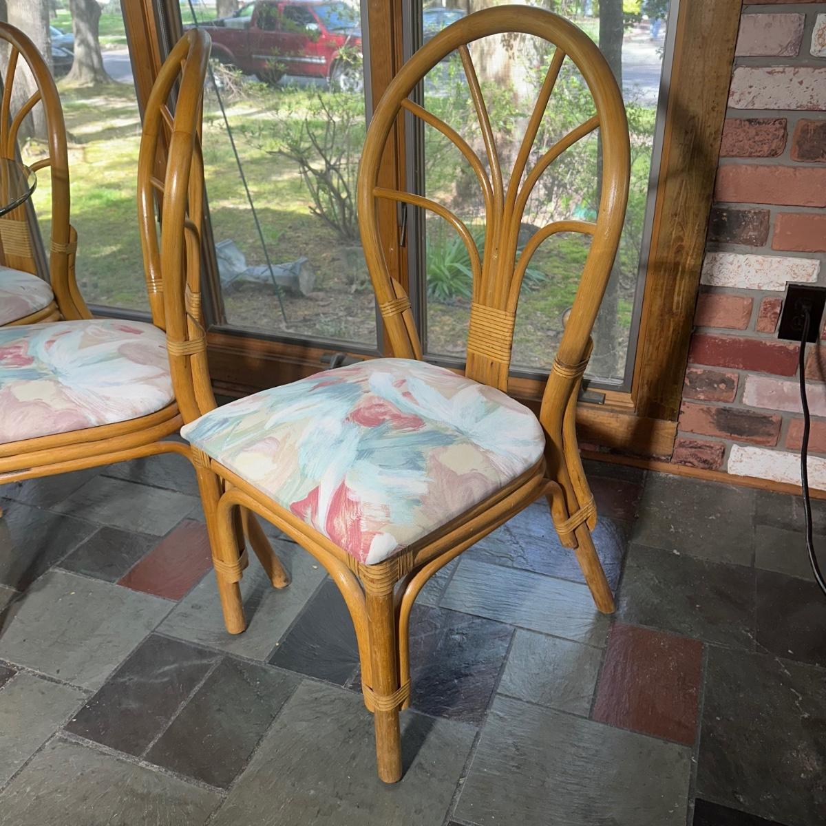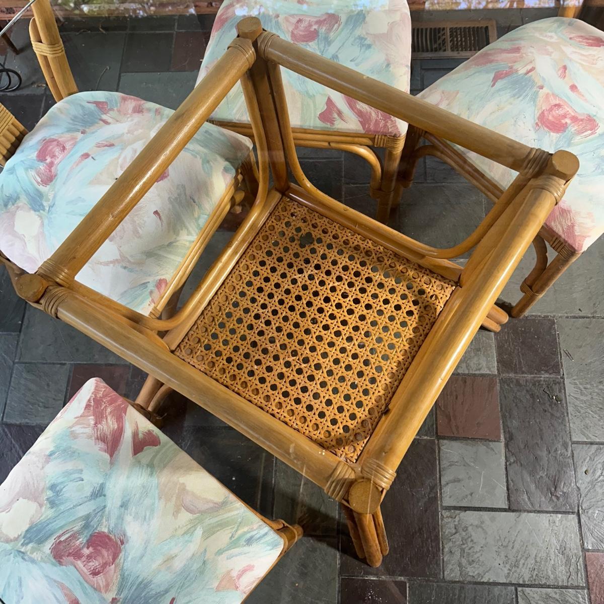 LOT 127P: Round Glass Top Rattan Dining Table & Chairs