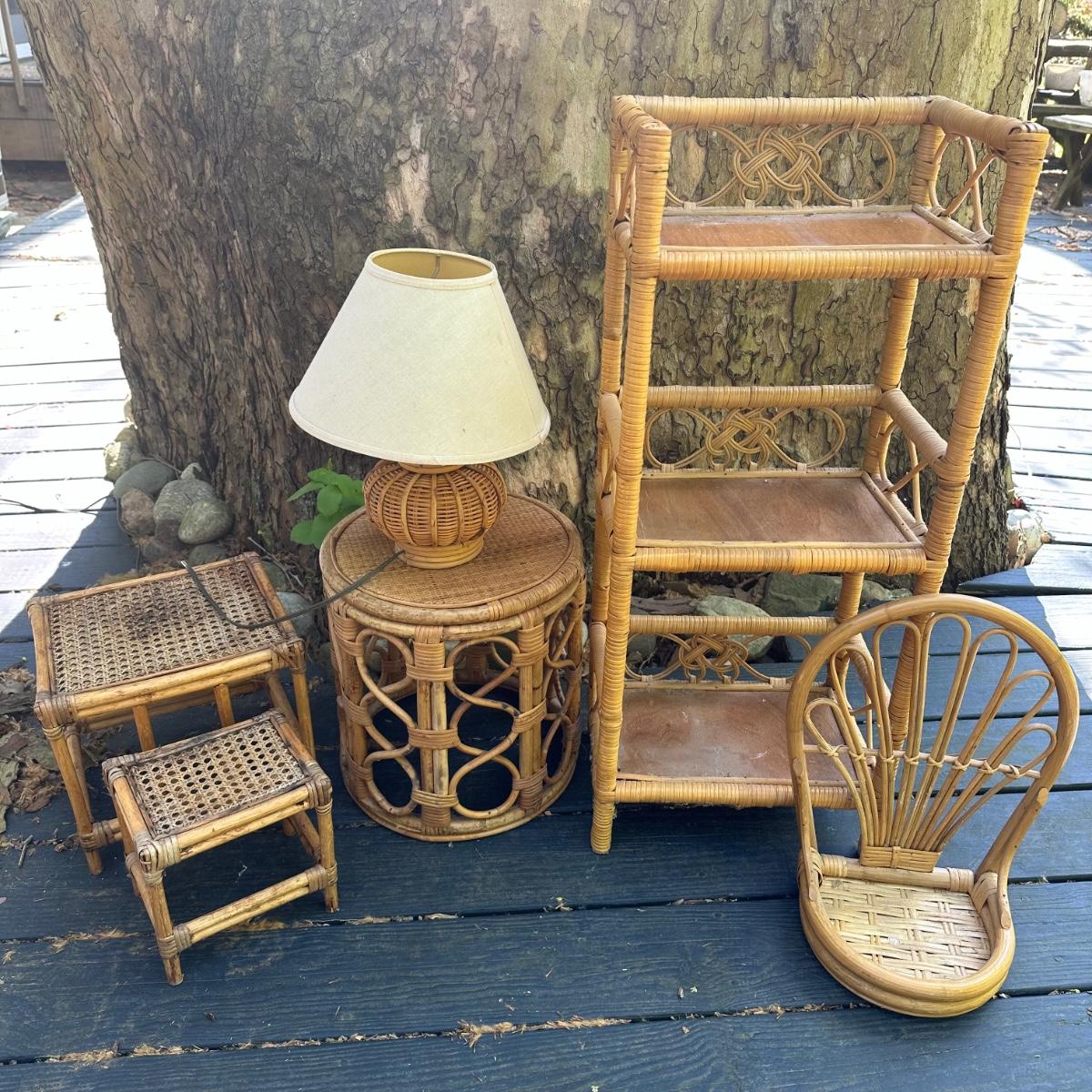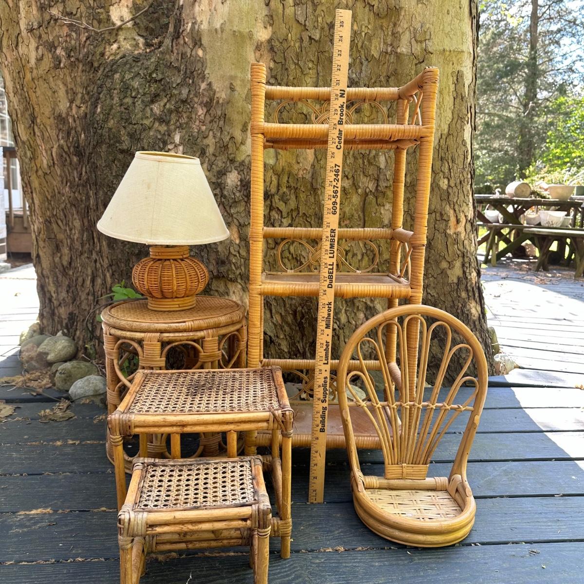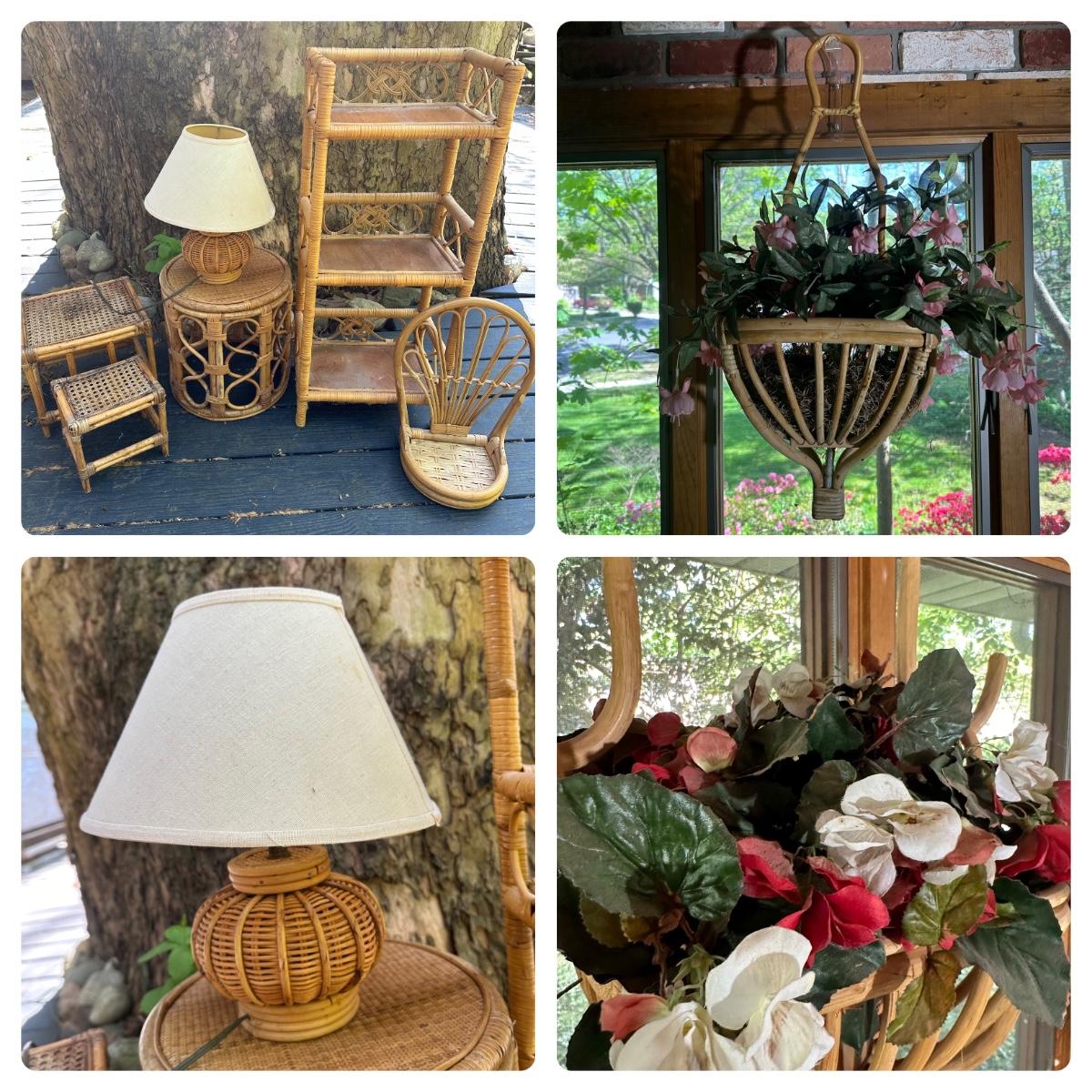 LOT 148P: Rattan Lamp, Stools, Plant Hangers & More