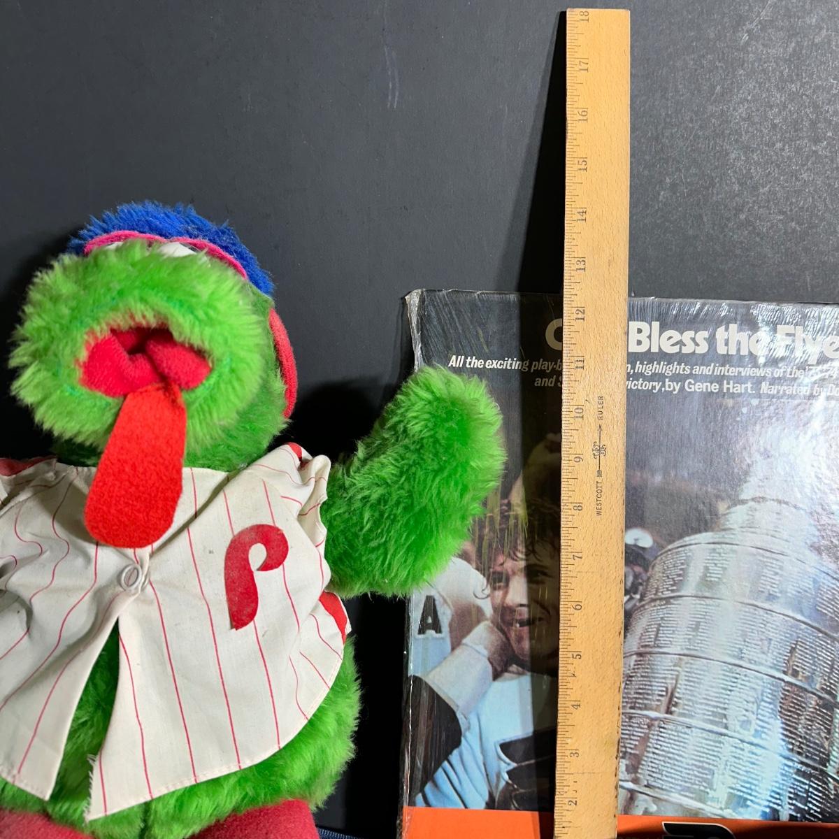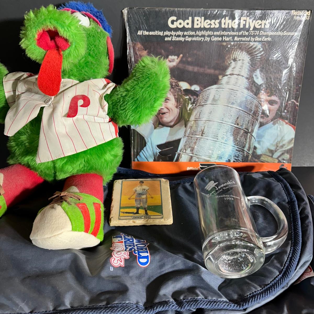 LOT 152G: Vintage Philadelphia Sports Collection - Phillies Phanatic, Philadelphia Flyers Official Album, 1983 World Series Garment Bag & More
