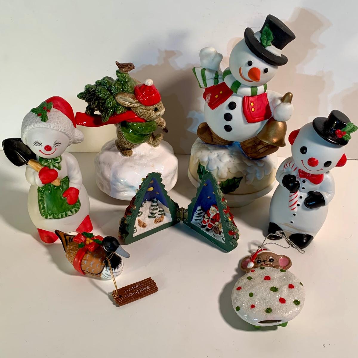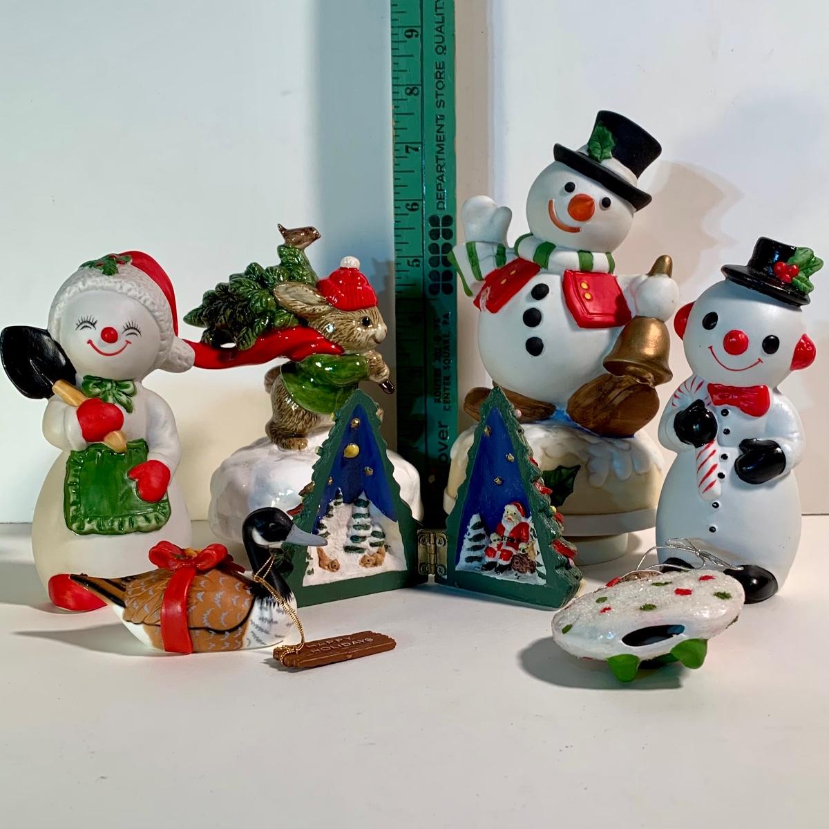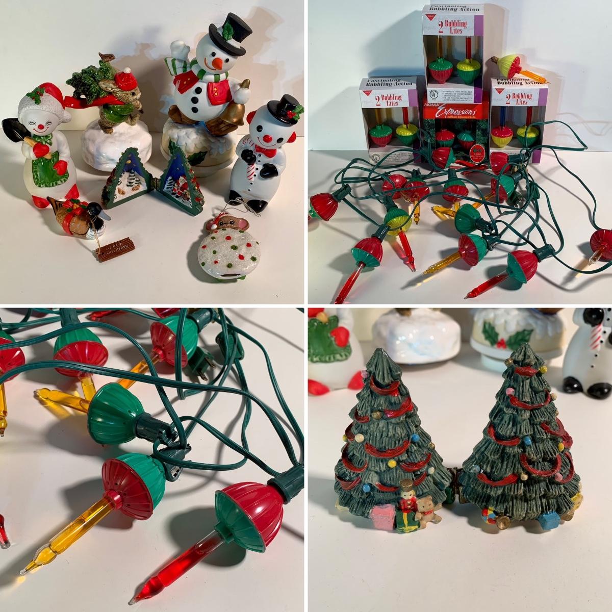 LOT 199 B: Vintage Bubble Christmas Lights W/ Replacements, Enesco Ceramic Snowmen & Plastic Goose Ornament, & More
