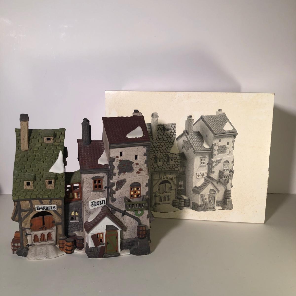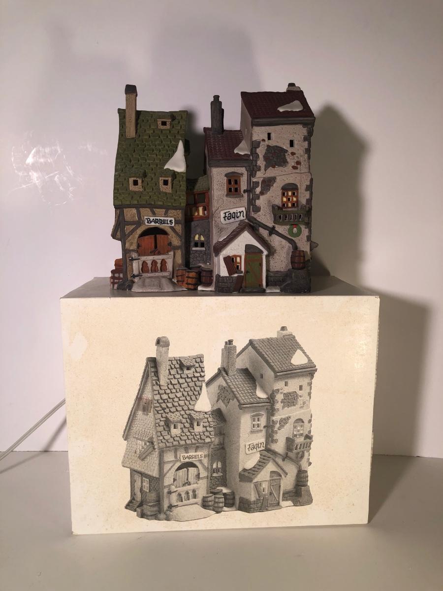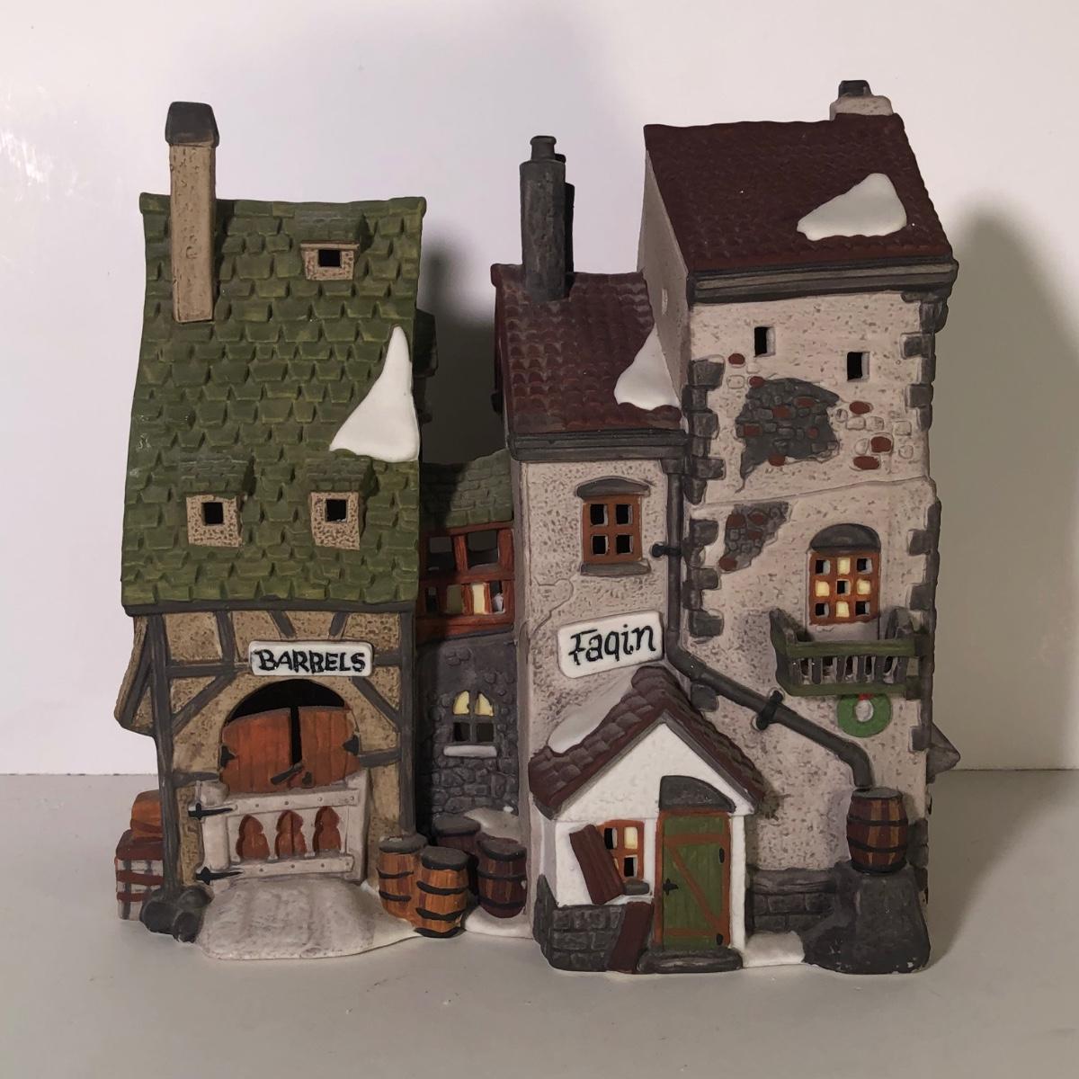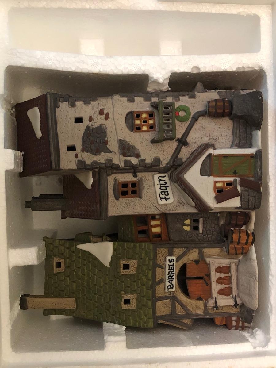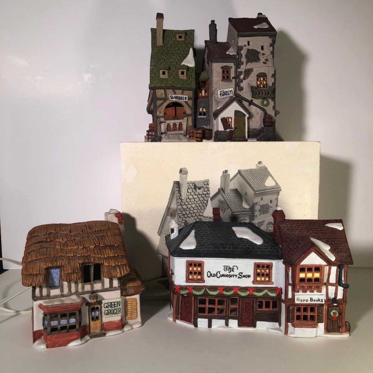 LOT 247G: Department 56 Dickens' Village - 1990 Oliver Twist Fagin's Hide-A-Way #5552-2, 1984Green Grocer & 1987 Old Curiosity Shoppe