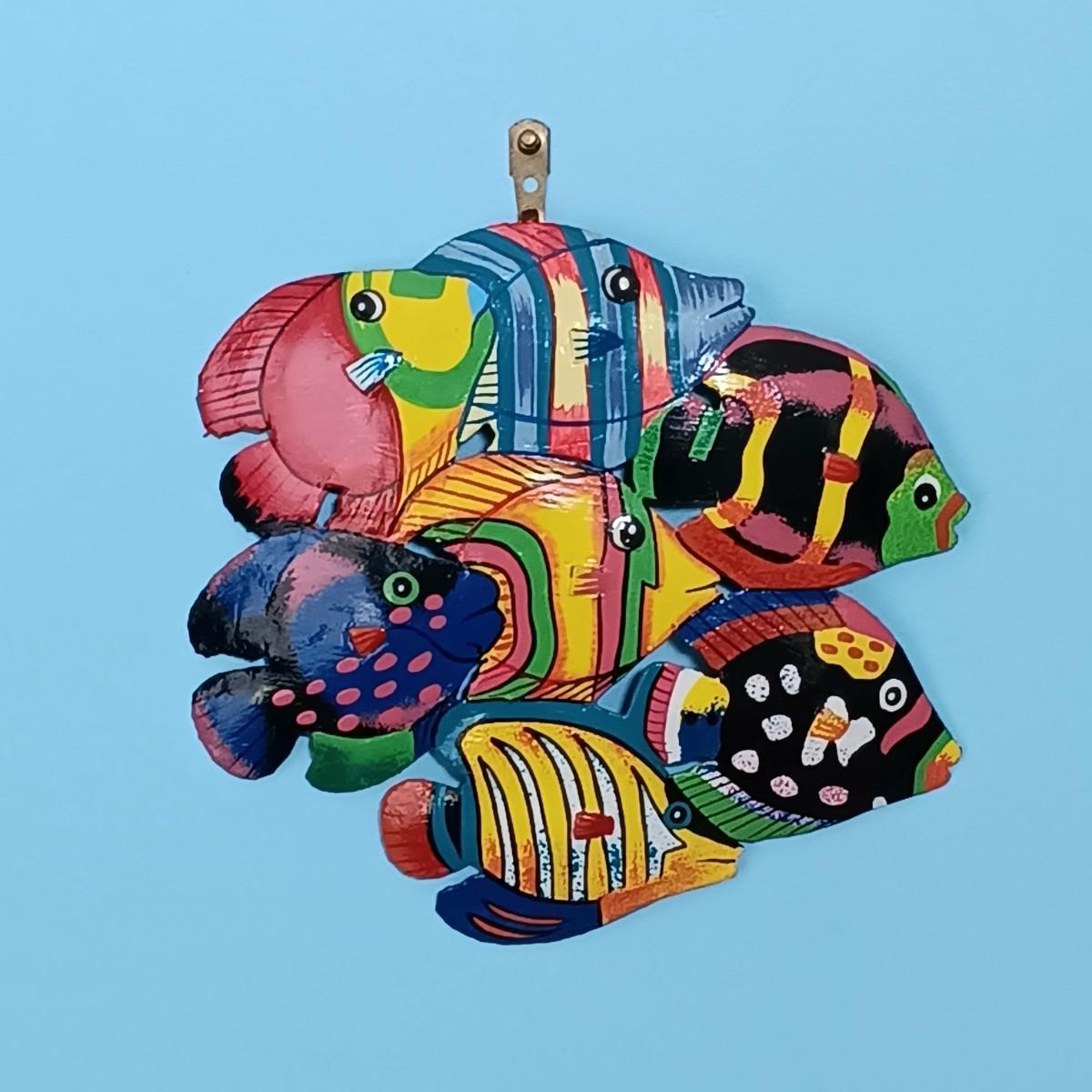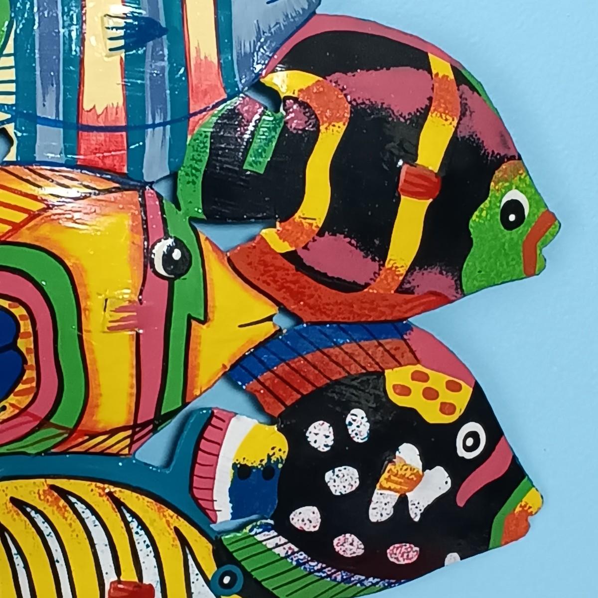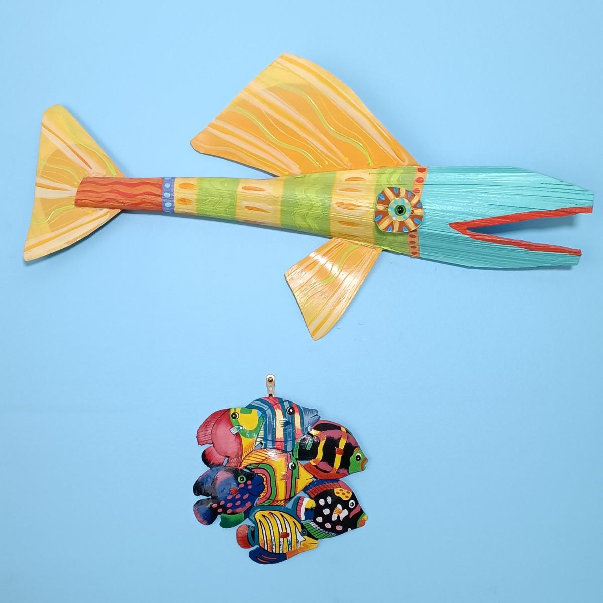 LOT 28: Signed Palm Frond Fish & Painted Metal School of Fish Wall Art