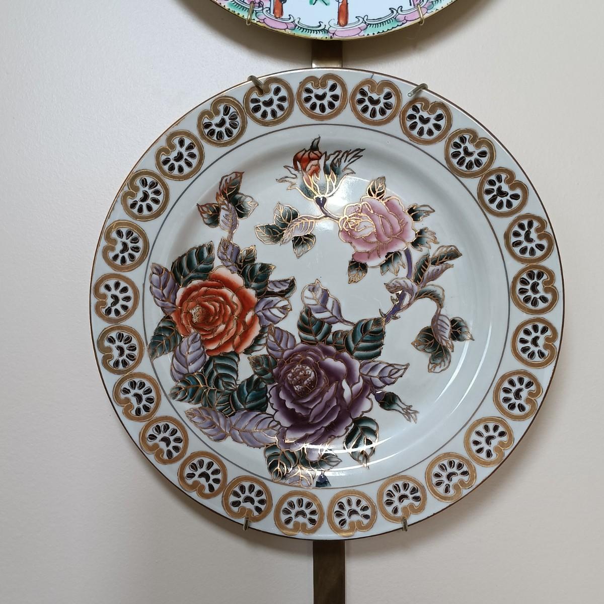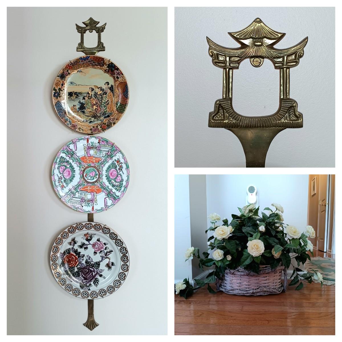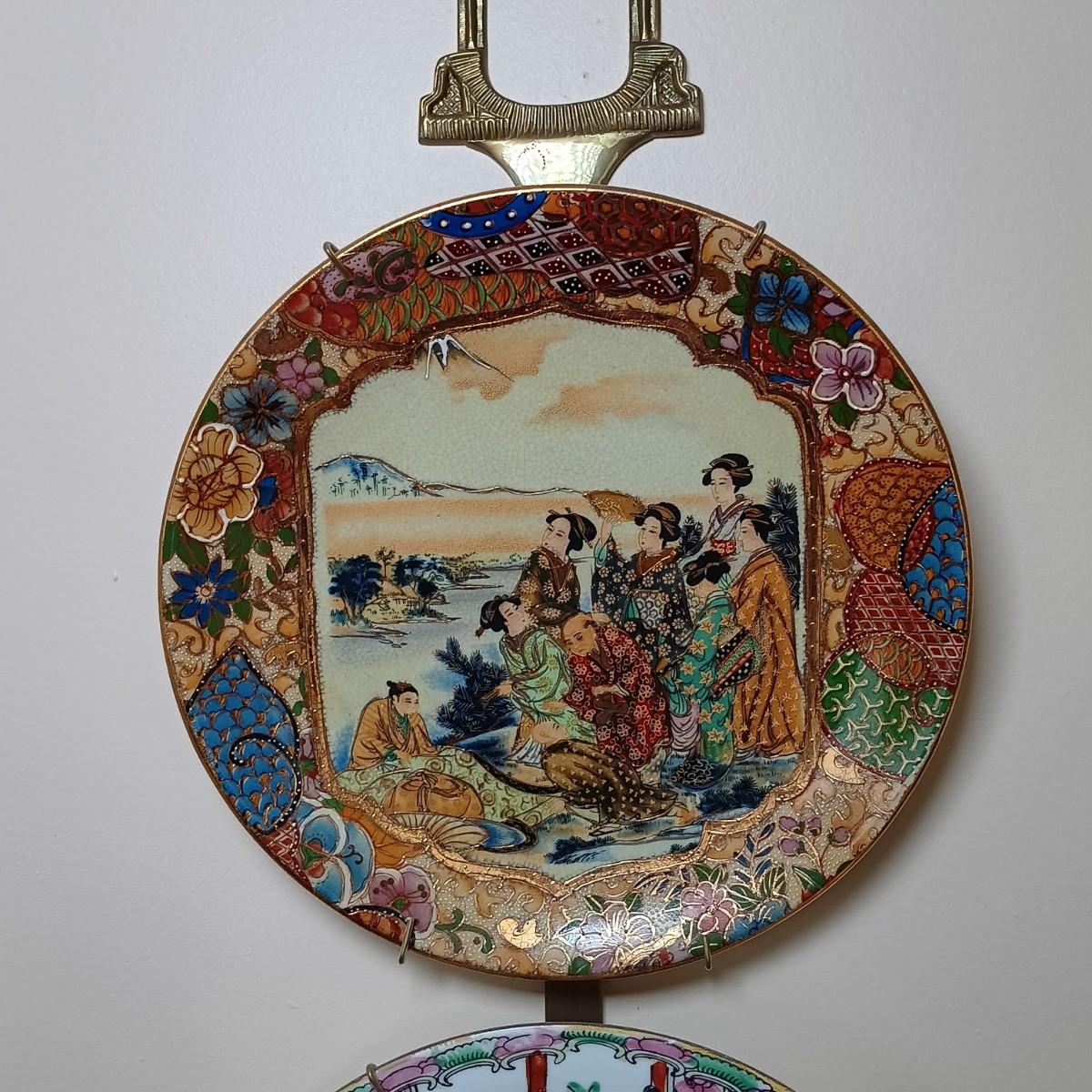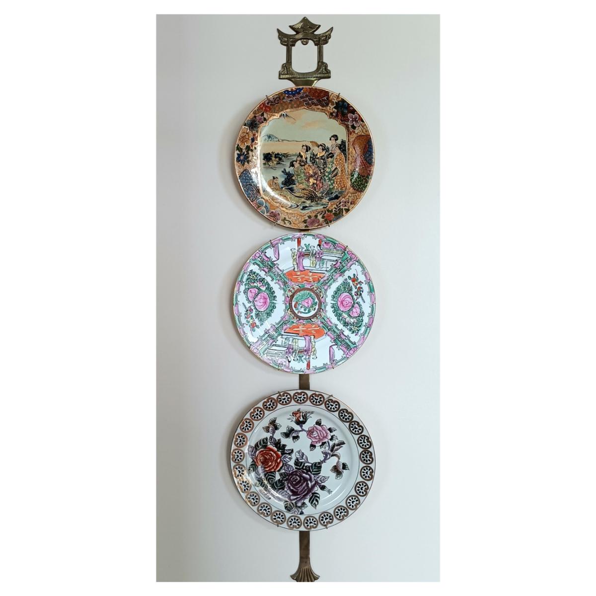 LOT 77: Set of 3 Satsuma-Style and Famille Rose Chinese Plates on Brass Wall Display w/ Floral Arrangement