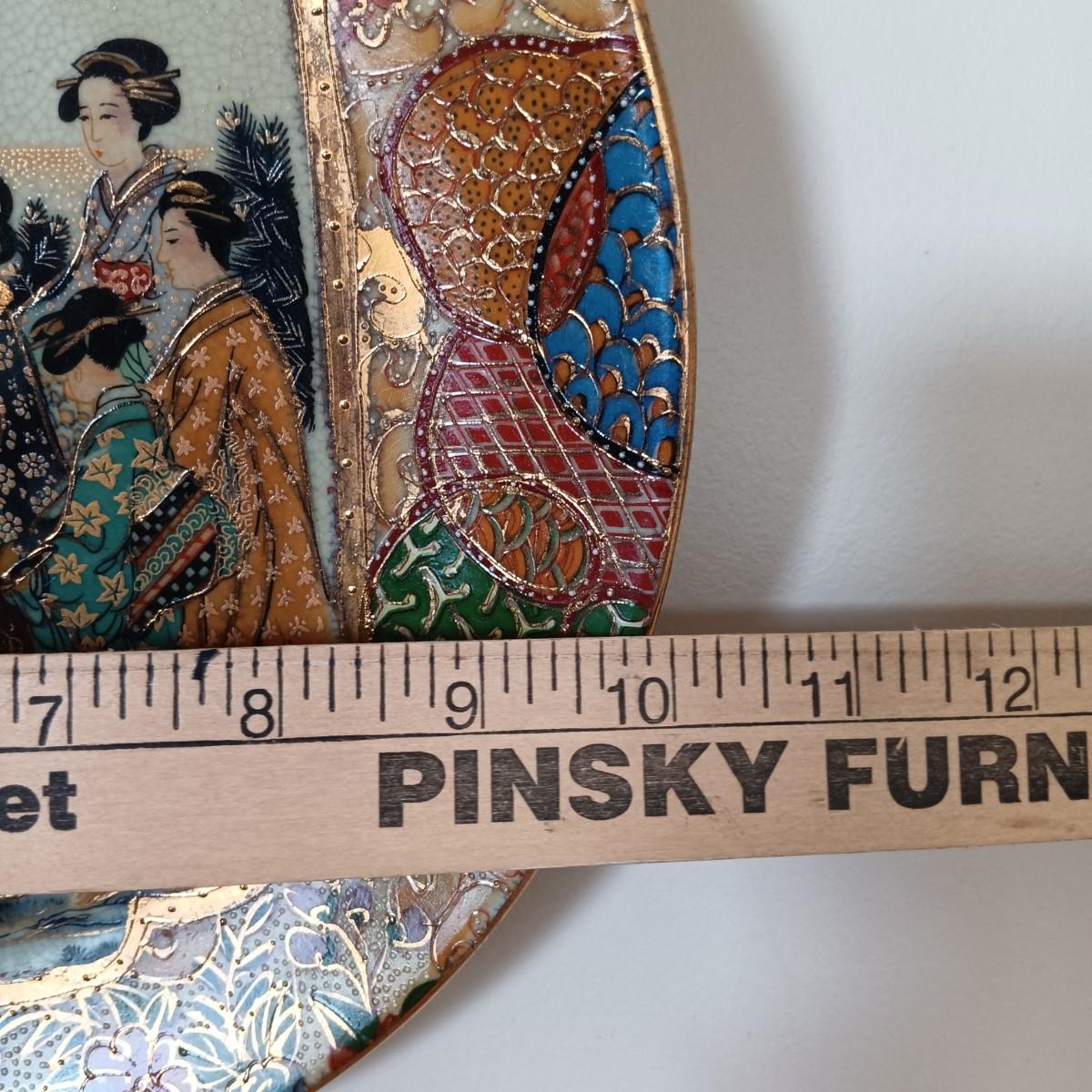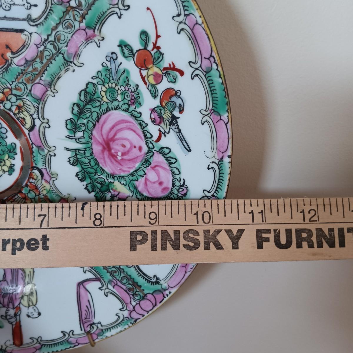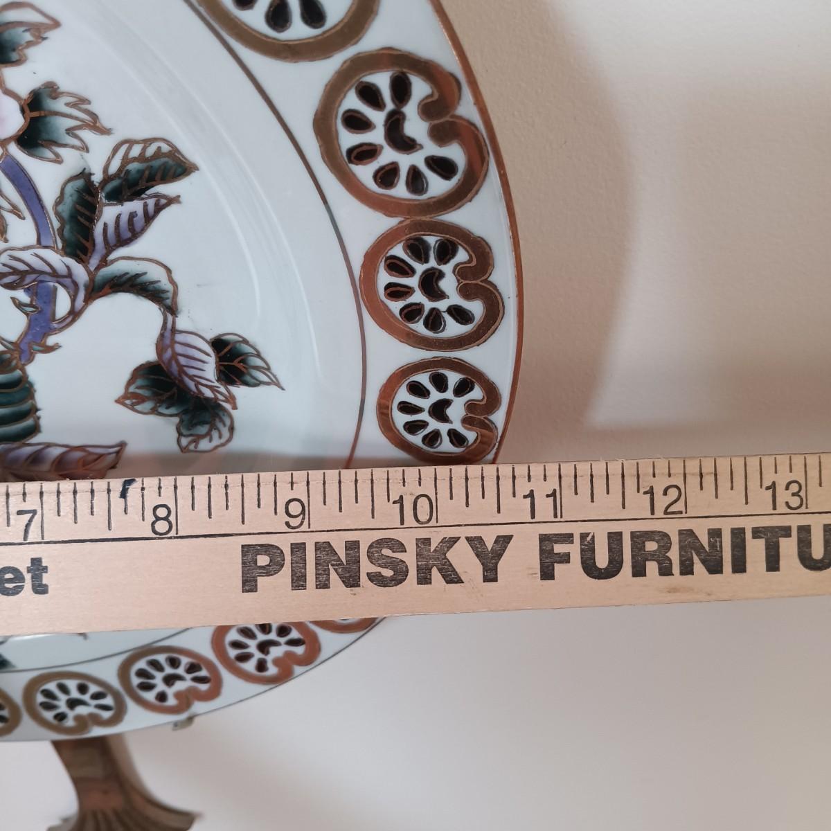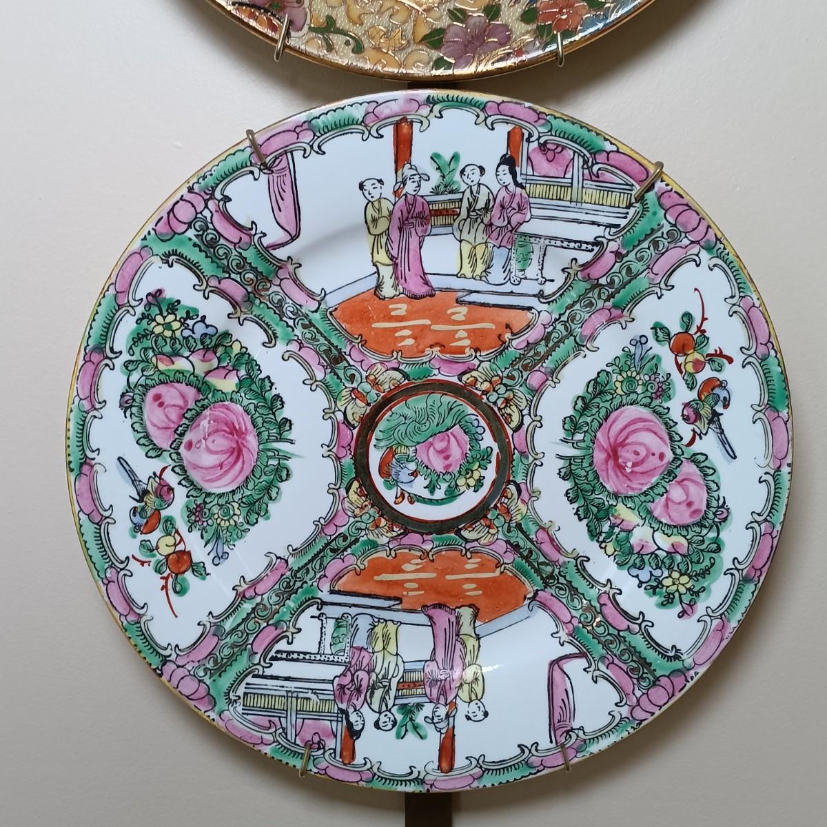 LOT 77: Set of 3 Satsuma-Style and Famille Rose Chinese Plates on Brass Wall Display w/ Floral Arrangement