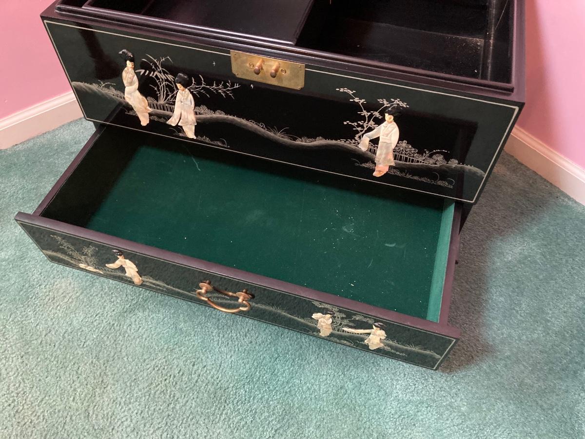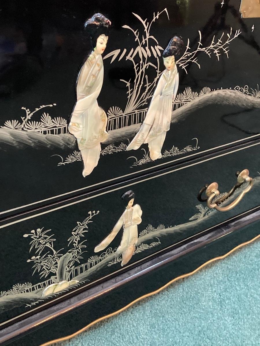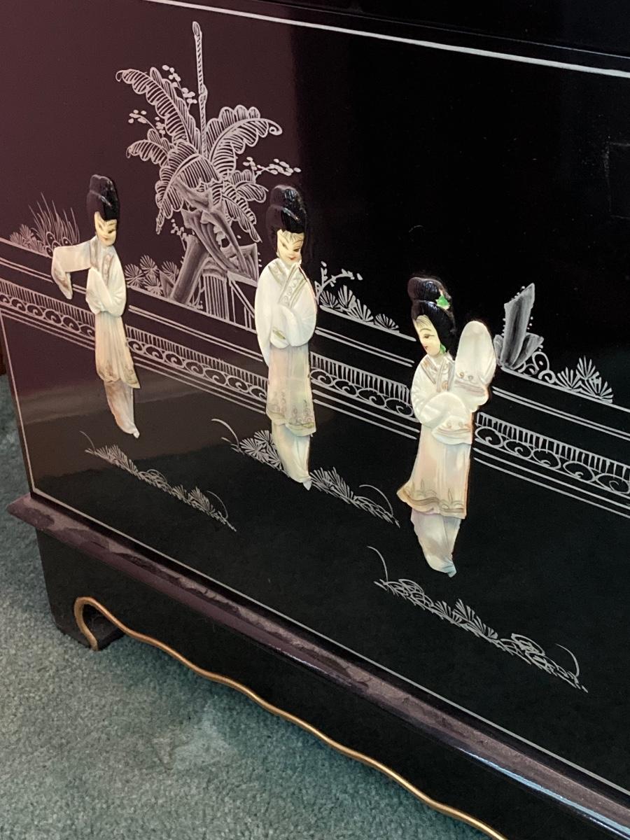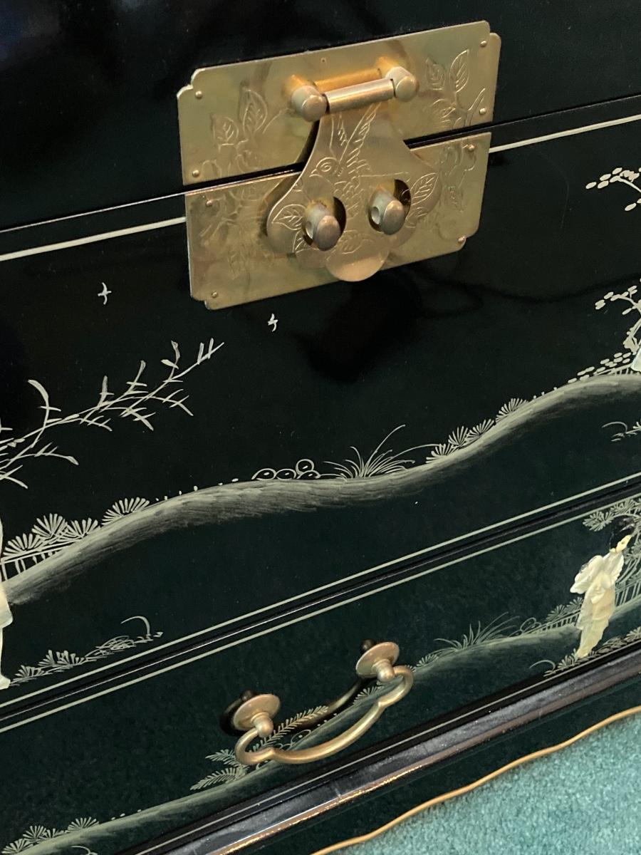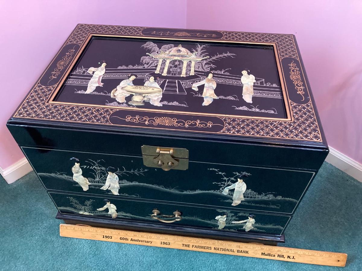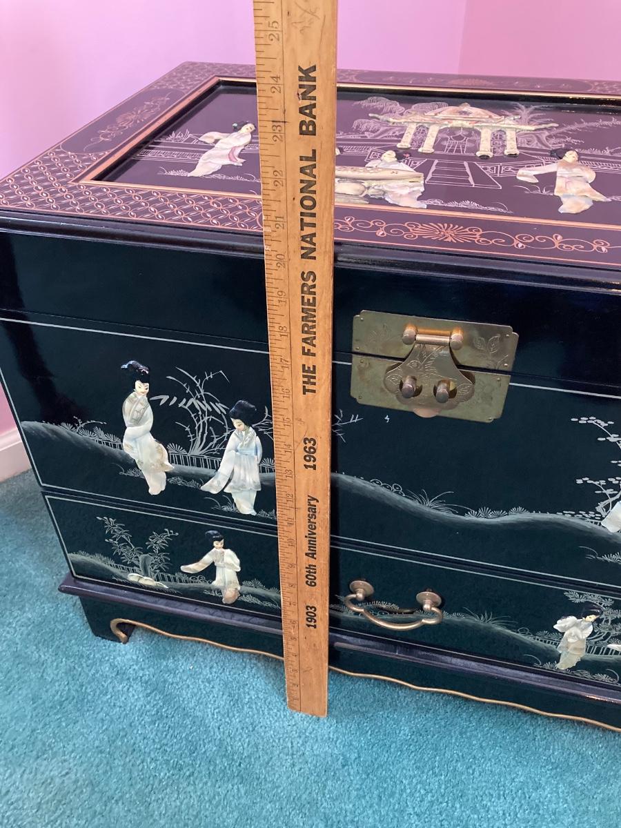 LOT 113: Beautiful Vintage Black Lacquer Embossed Mother of Pearl Chest