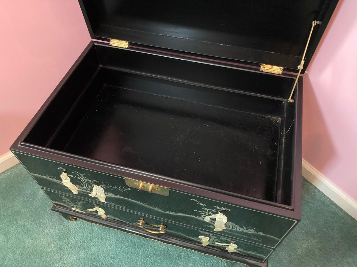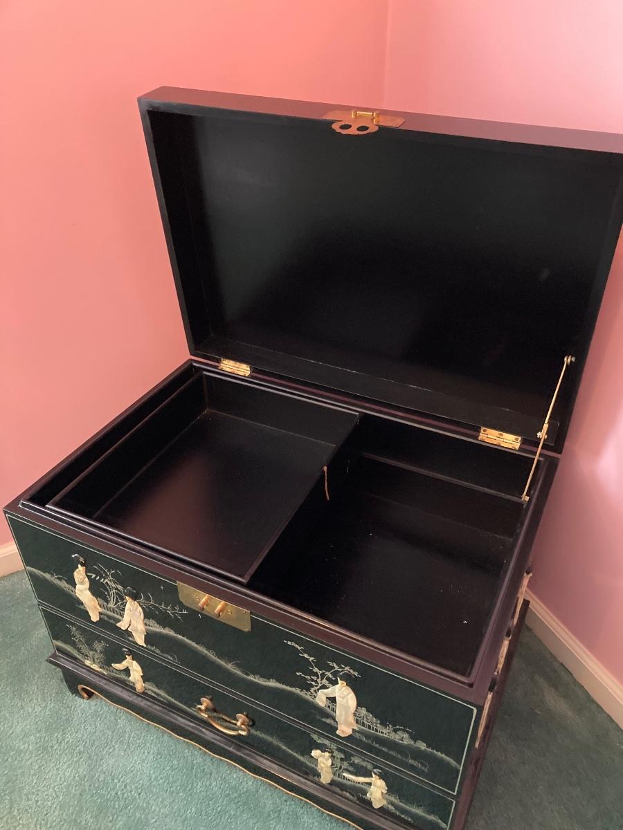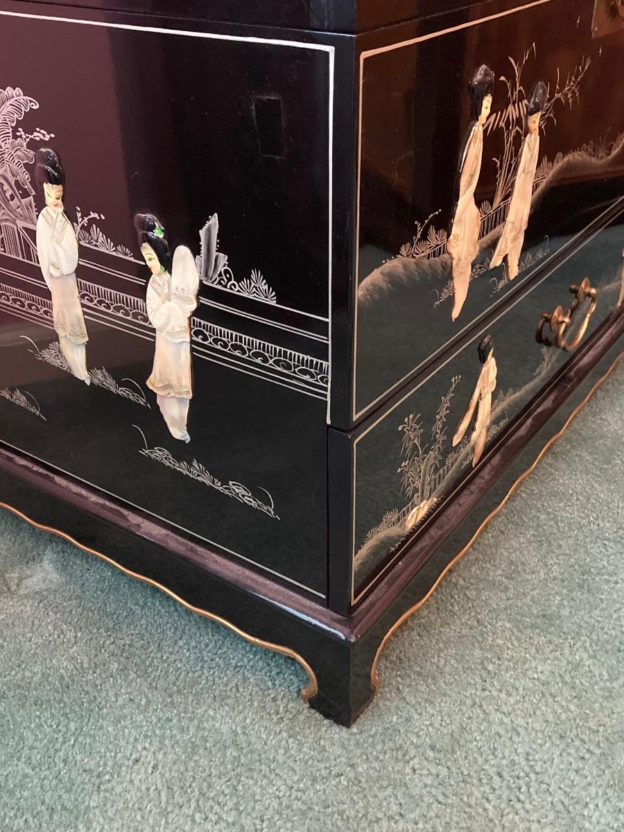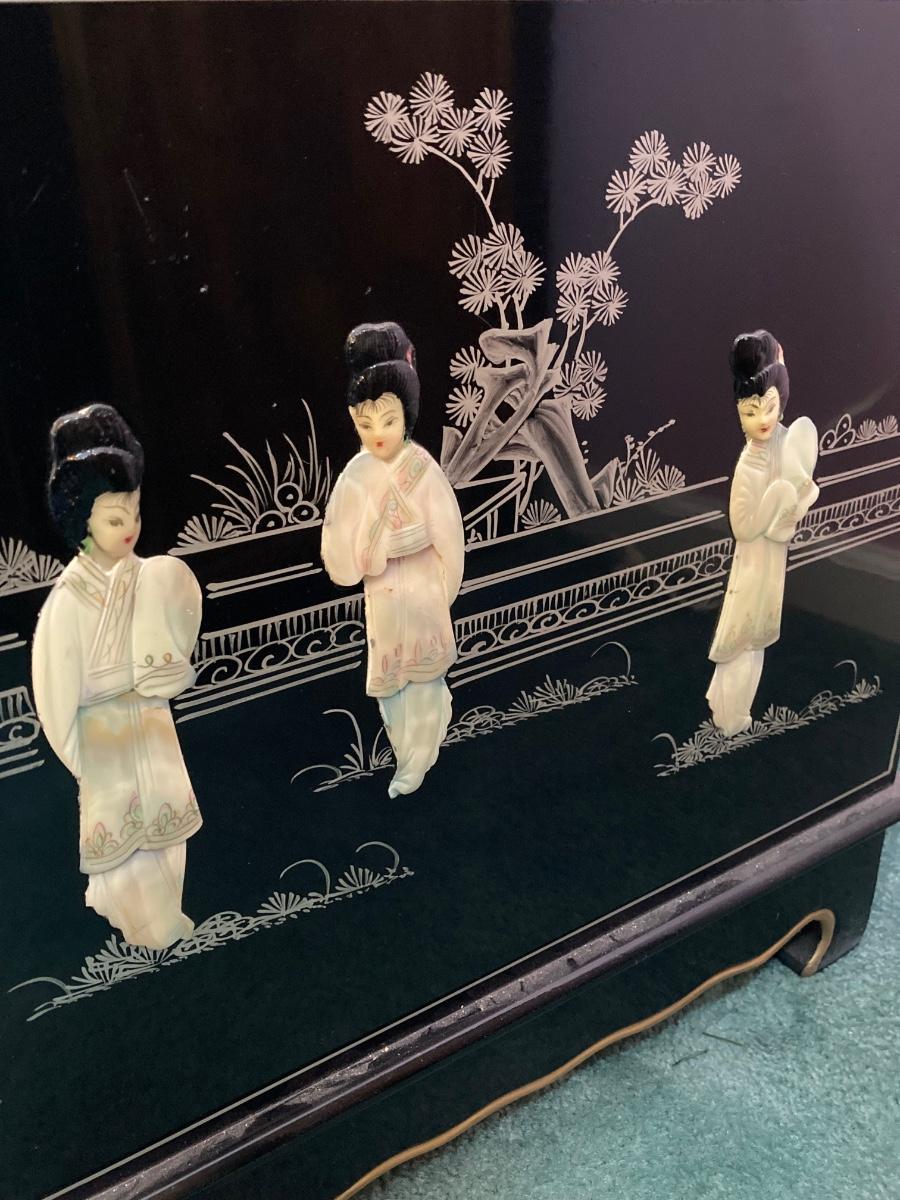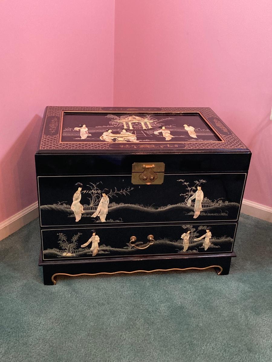 LOT 113: Beautiful Vintage Black Lacquer Embossed Mother of Pearl Chest