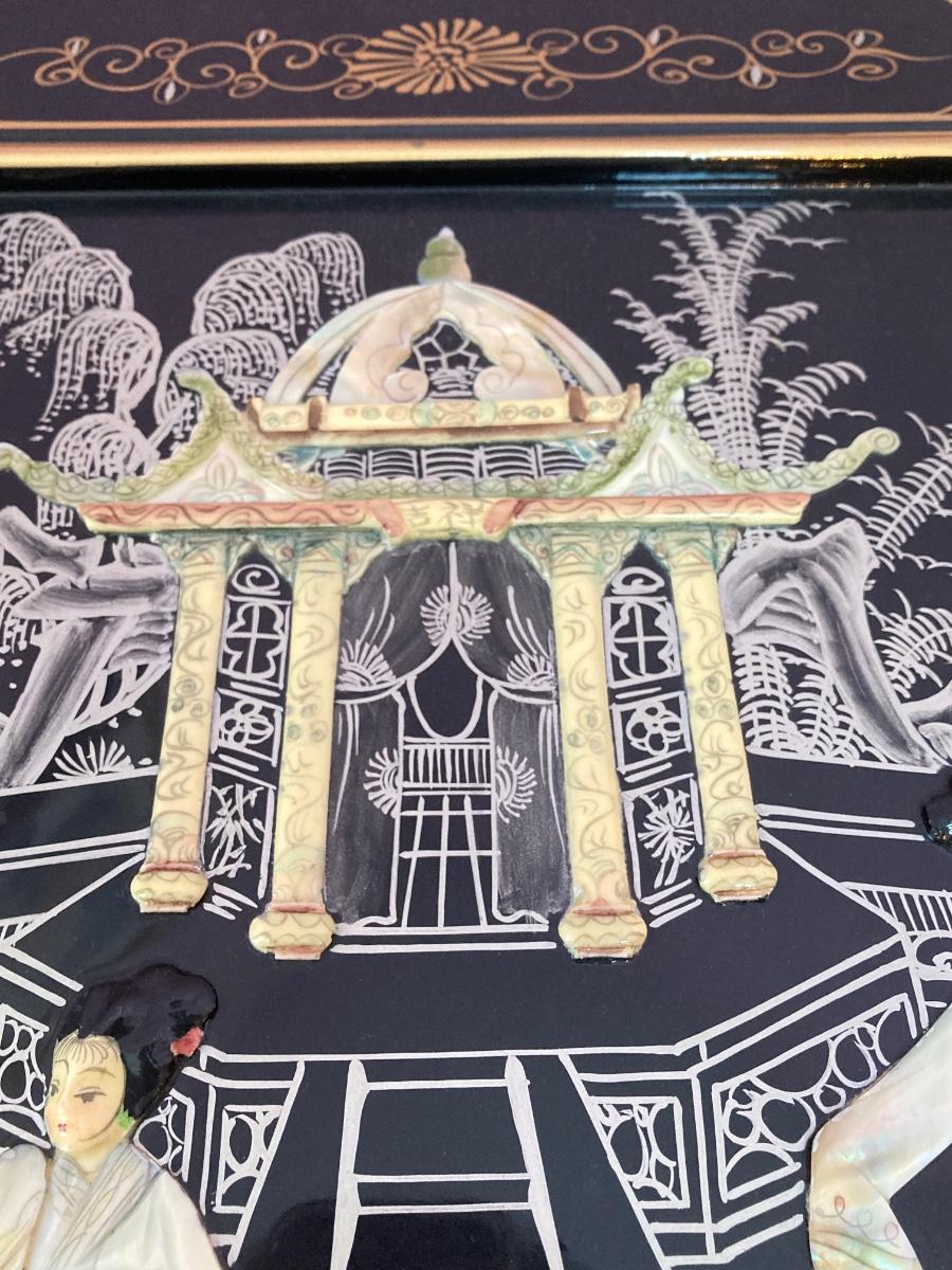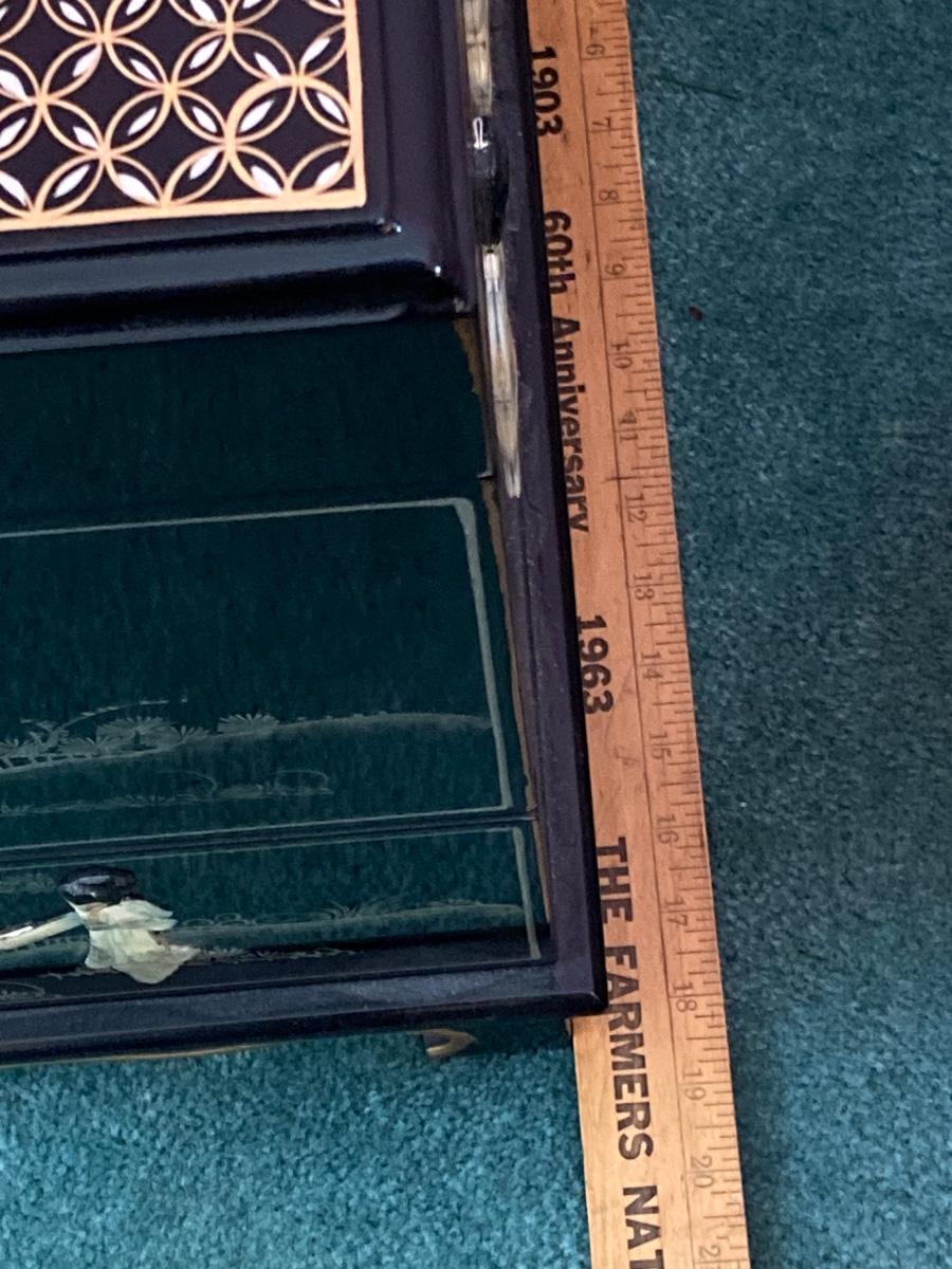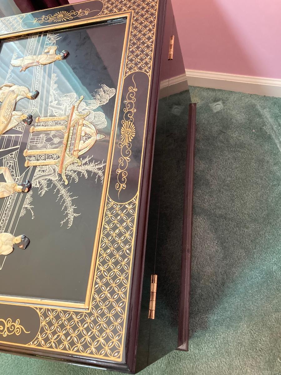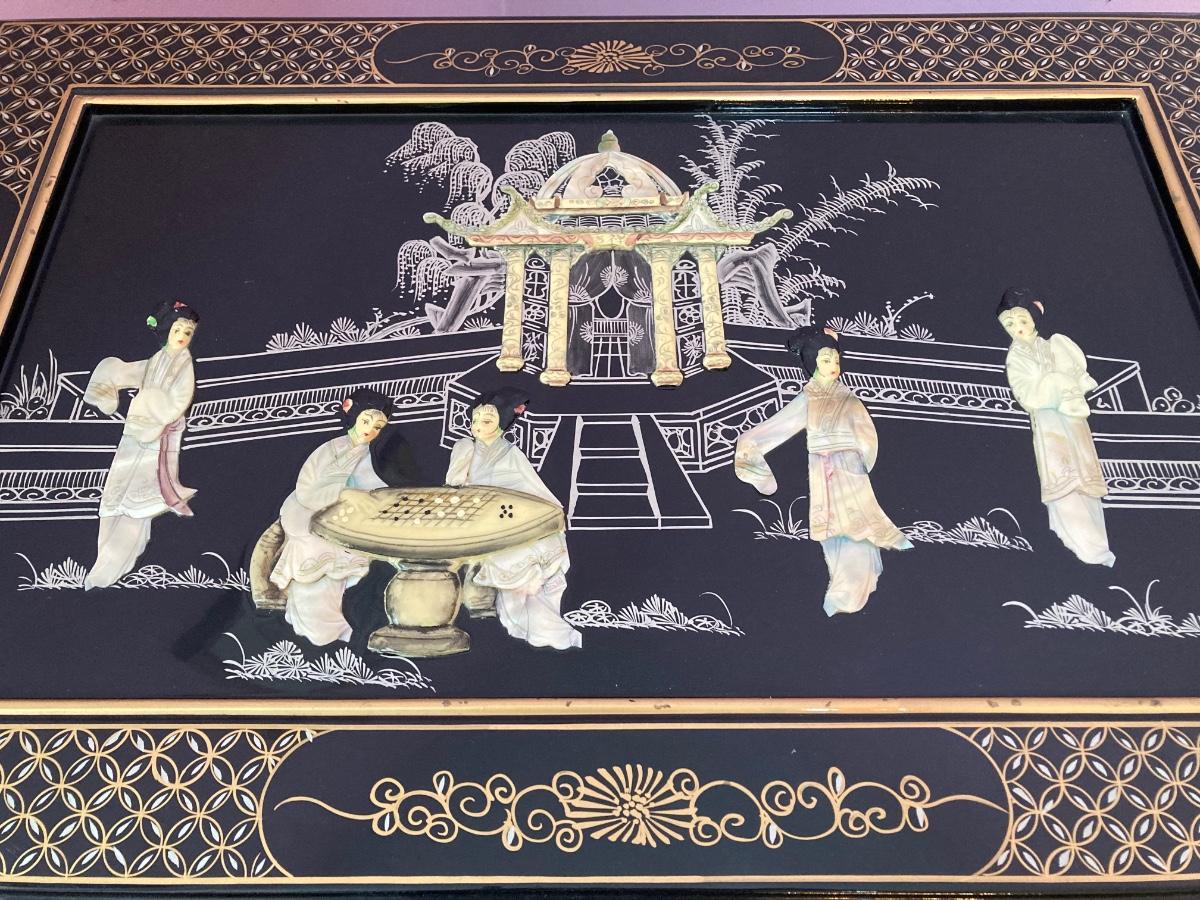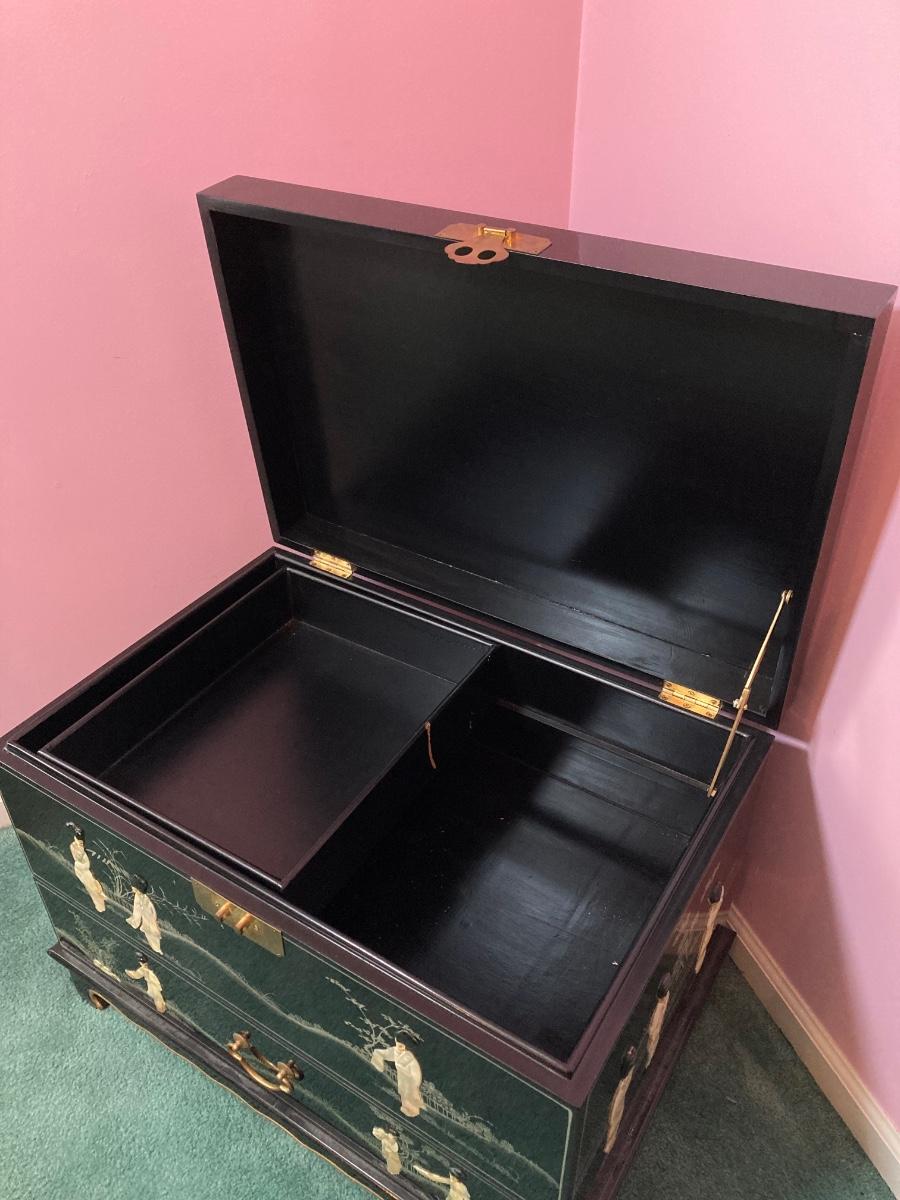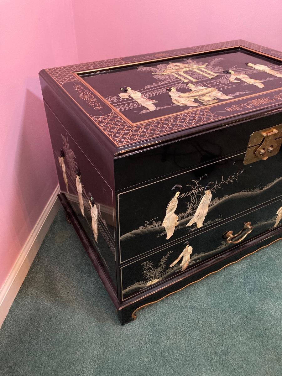 LOT 113: Beautiful Vintage Black Lacquer Embossed Mother of Pearl Chest