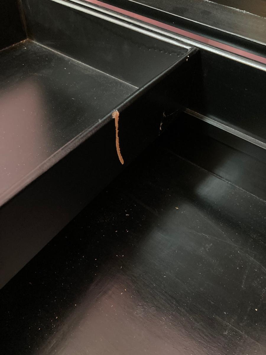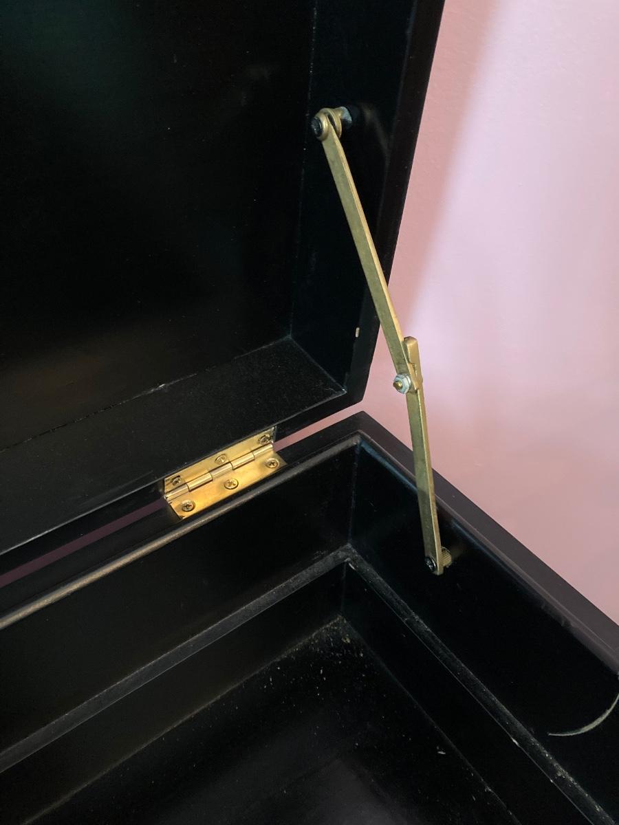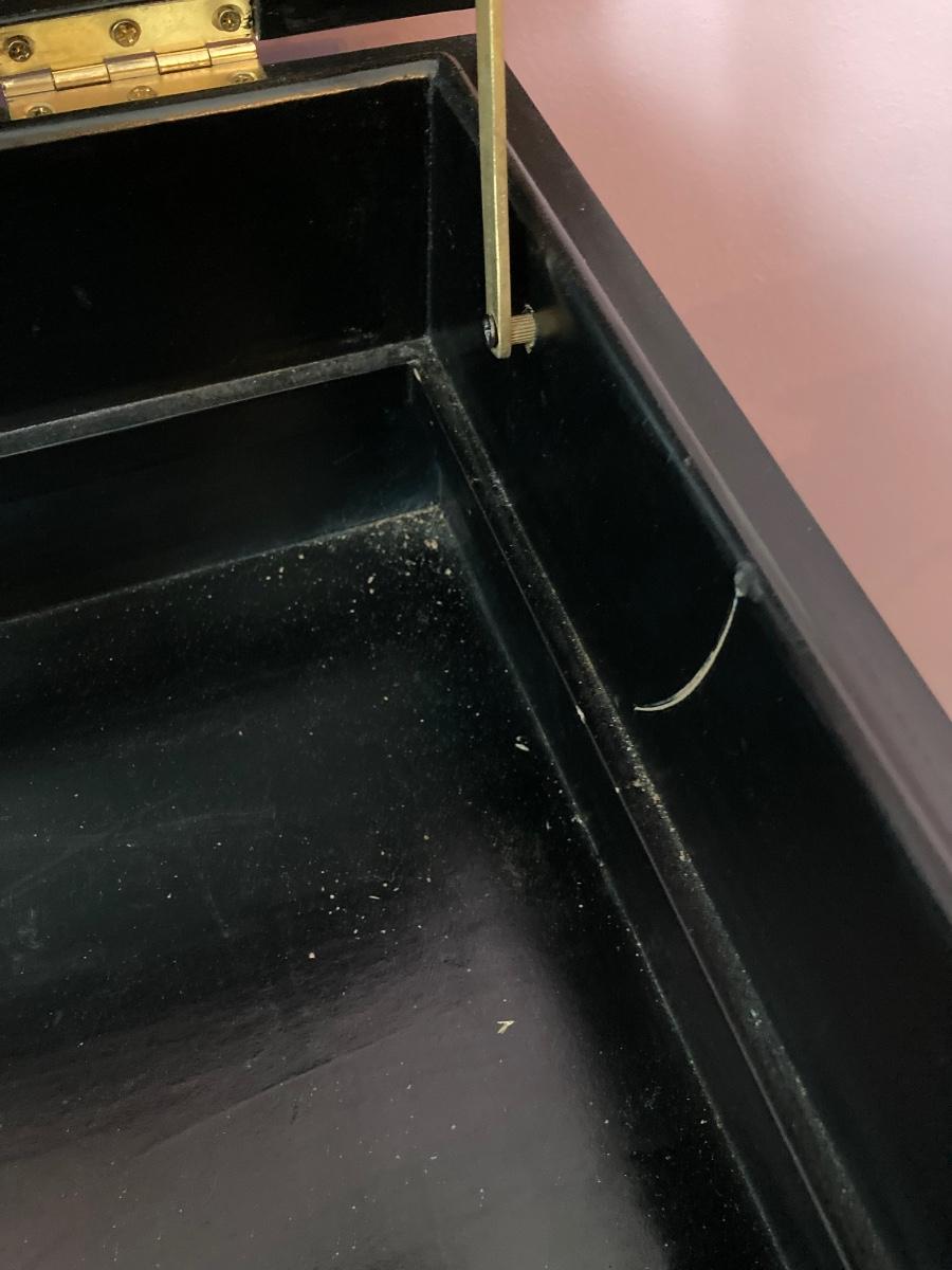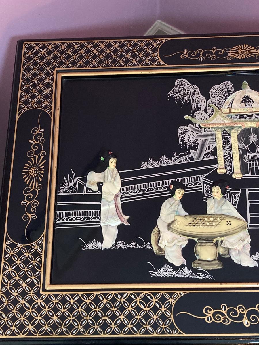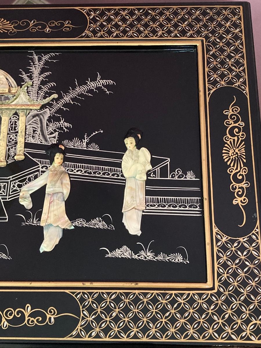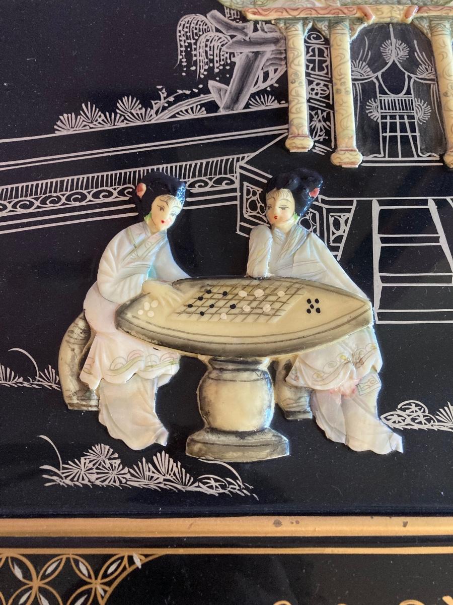 LOT 113: Beautiful Vintage Black Lacquer Embossed Mother of Pearl Chest