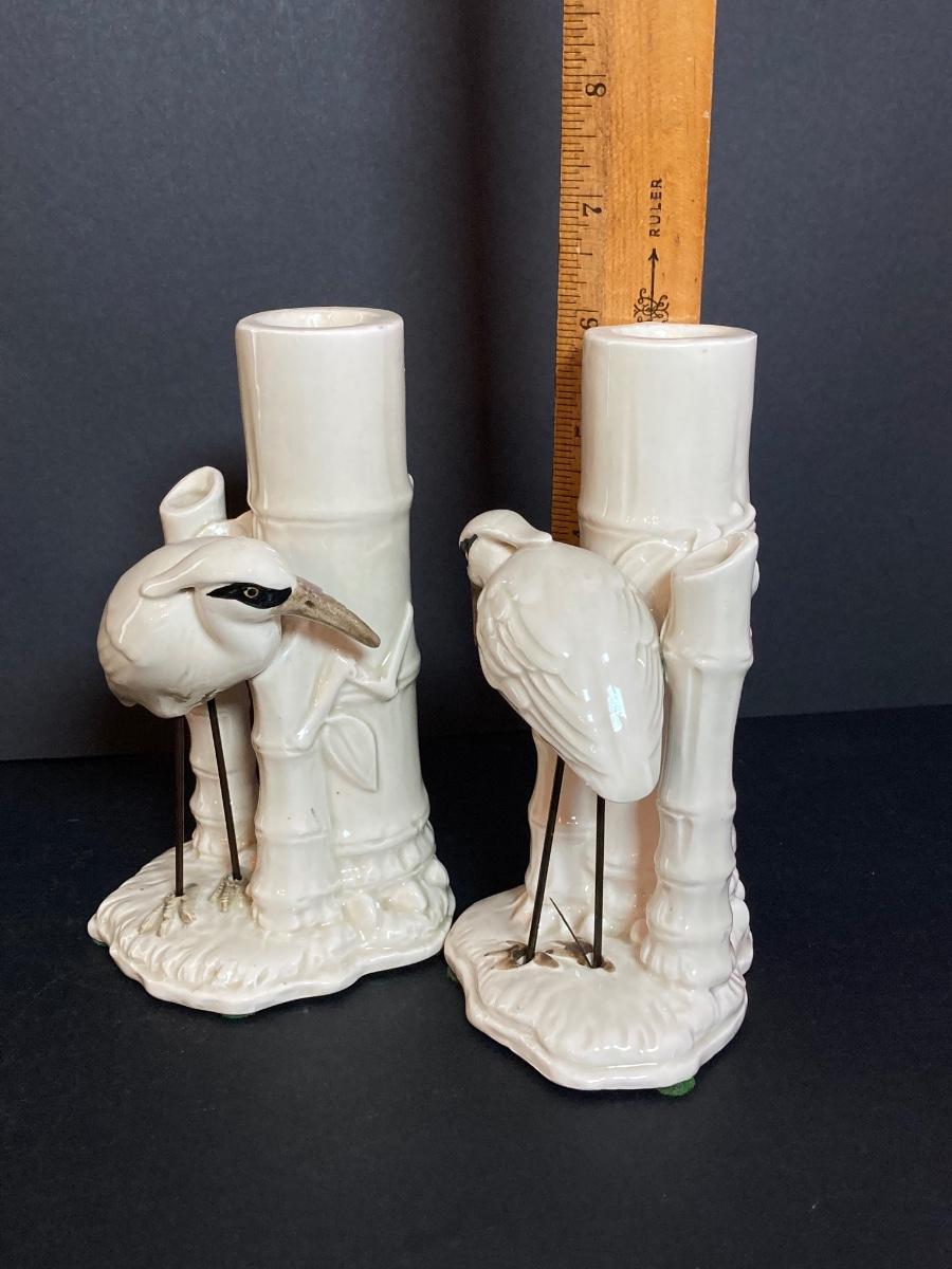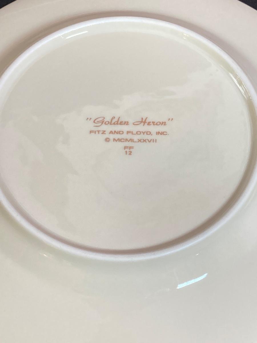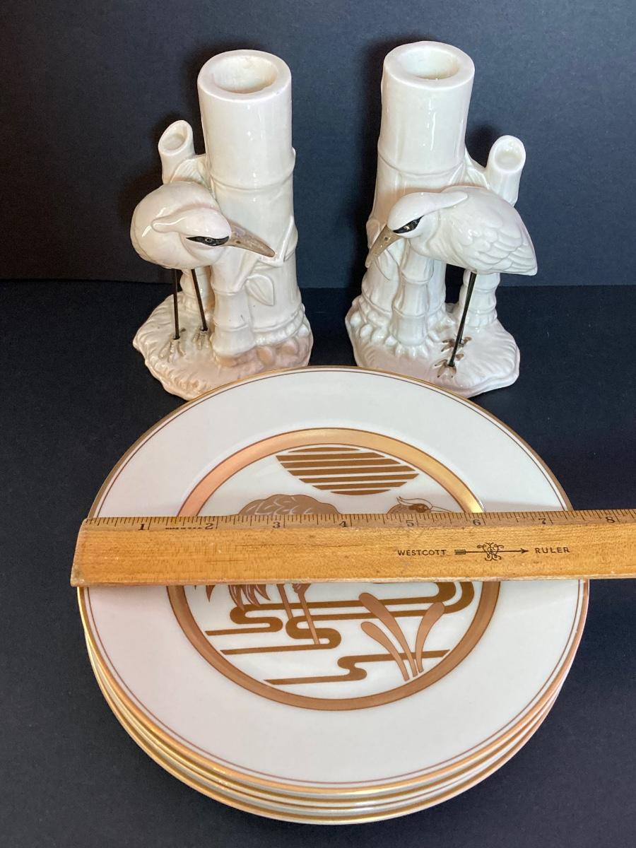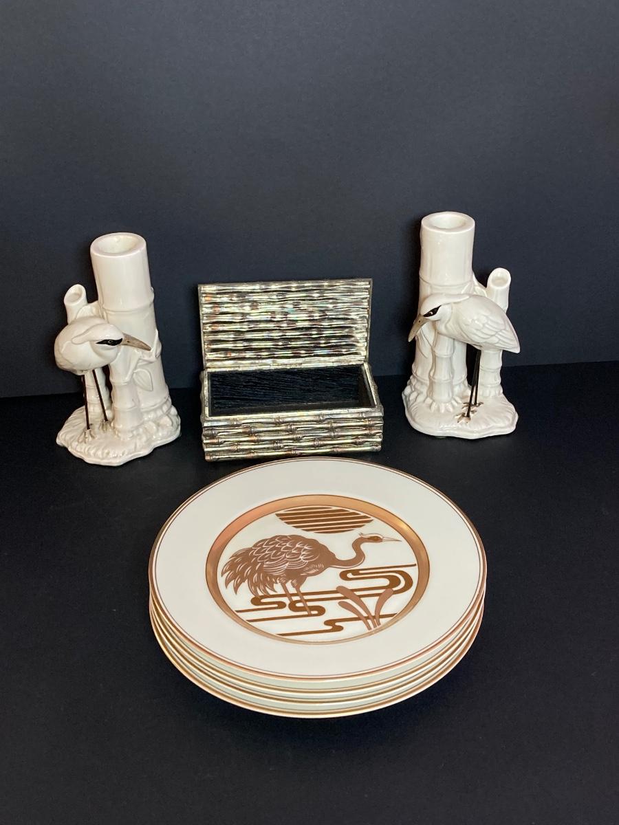 LOT 132: Fitz and Floyd "Golden Heron" Plates, Heron Candlestick Holders and Metal Bamboo Trinket Box