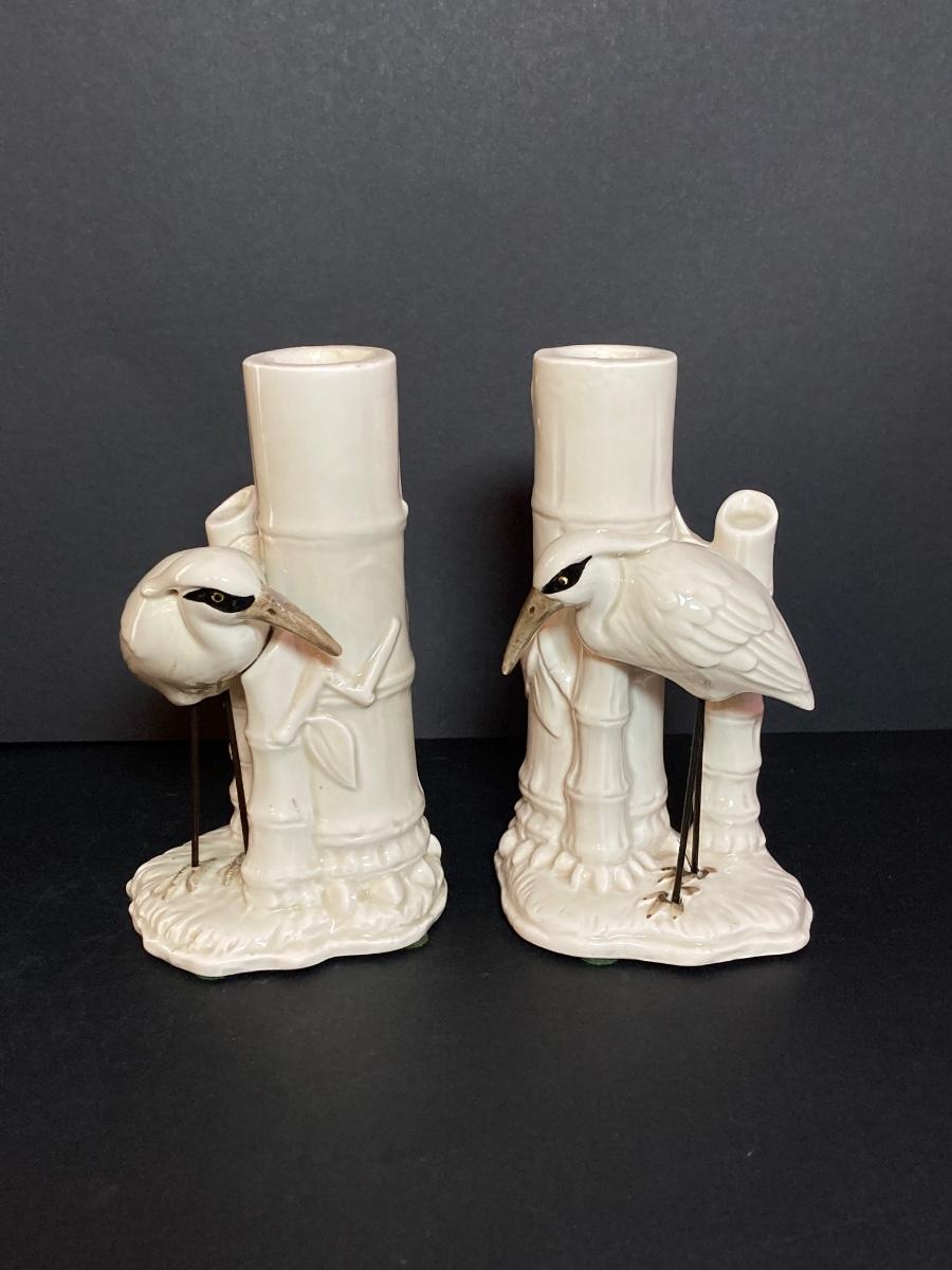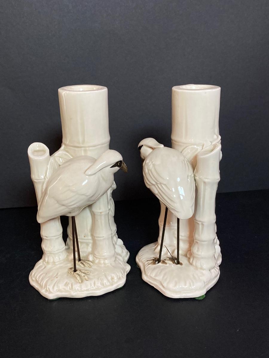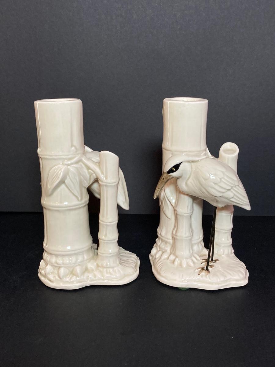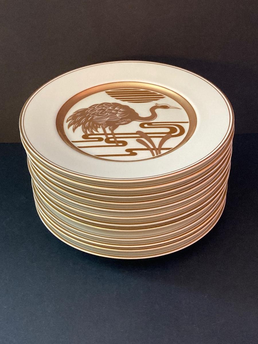 LOT 132: Fitz and Floyd "Golden Heron" Plates, Heron Candlestick Holders and Metal Bamboo Trinket Box