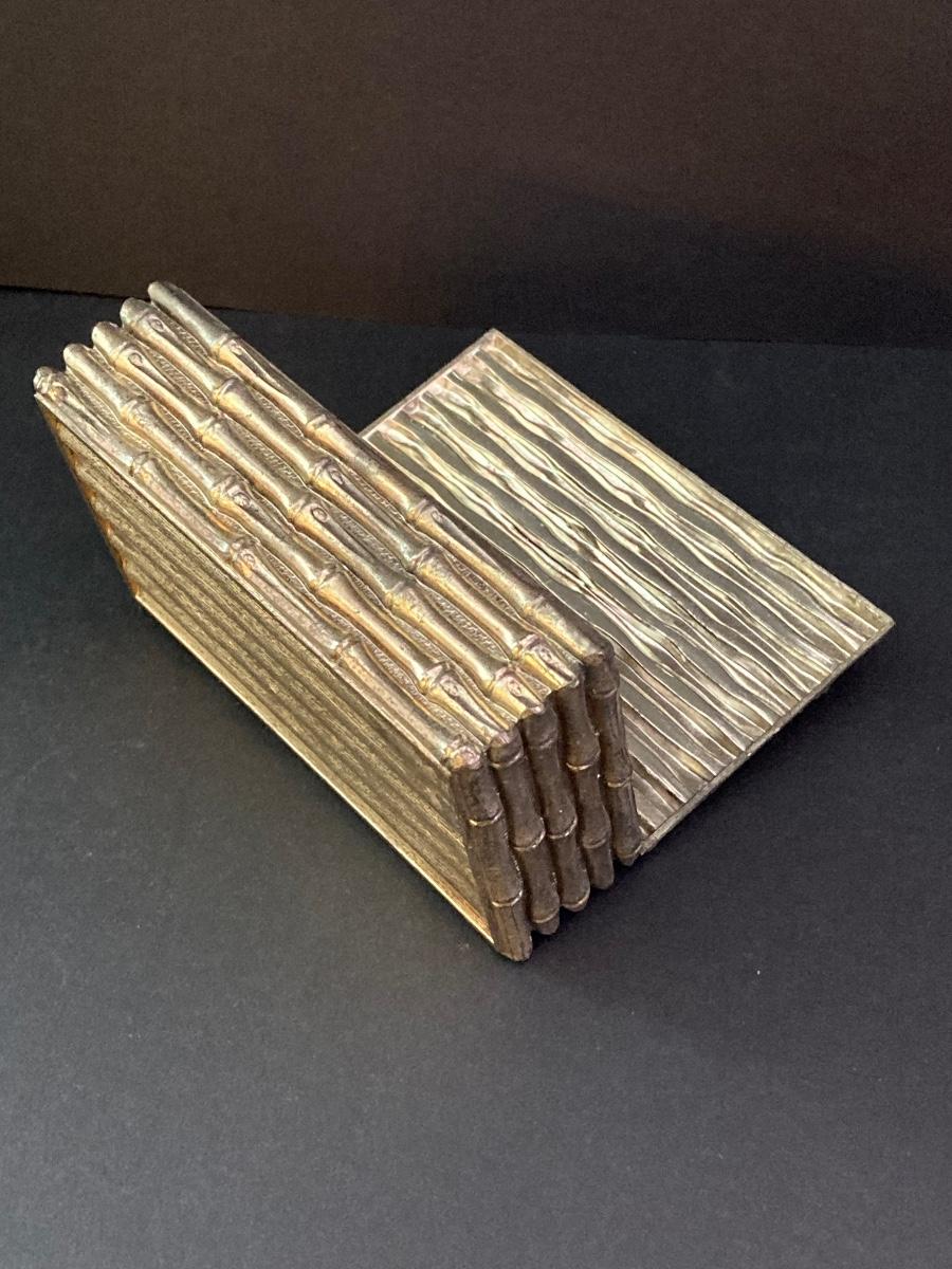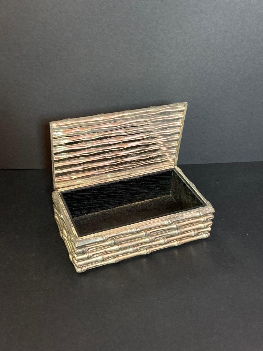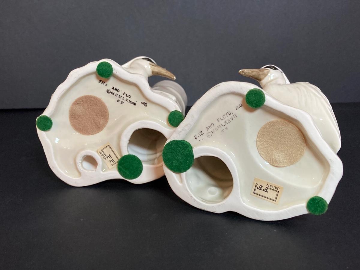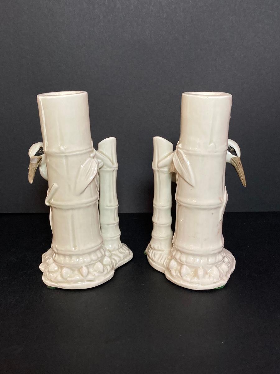 LOT 132: Fitz and Floyd "Golden Heron" Plates, Heron Candlestick Holders and Metal Bamboo Trinket Box