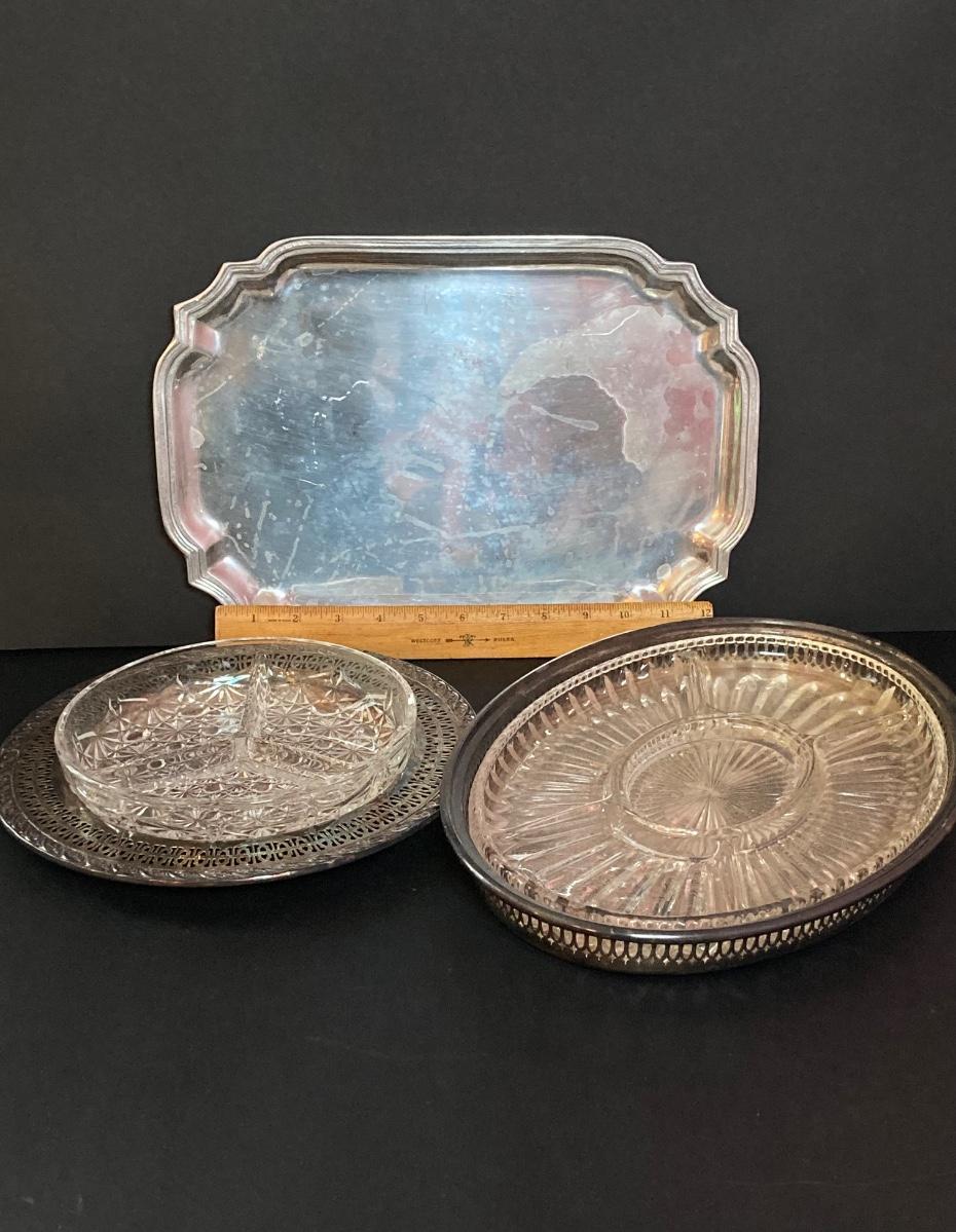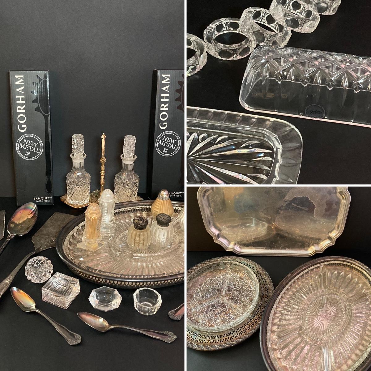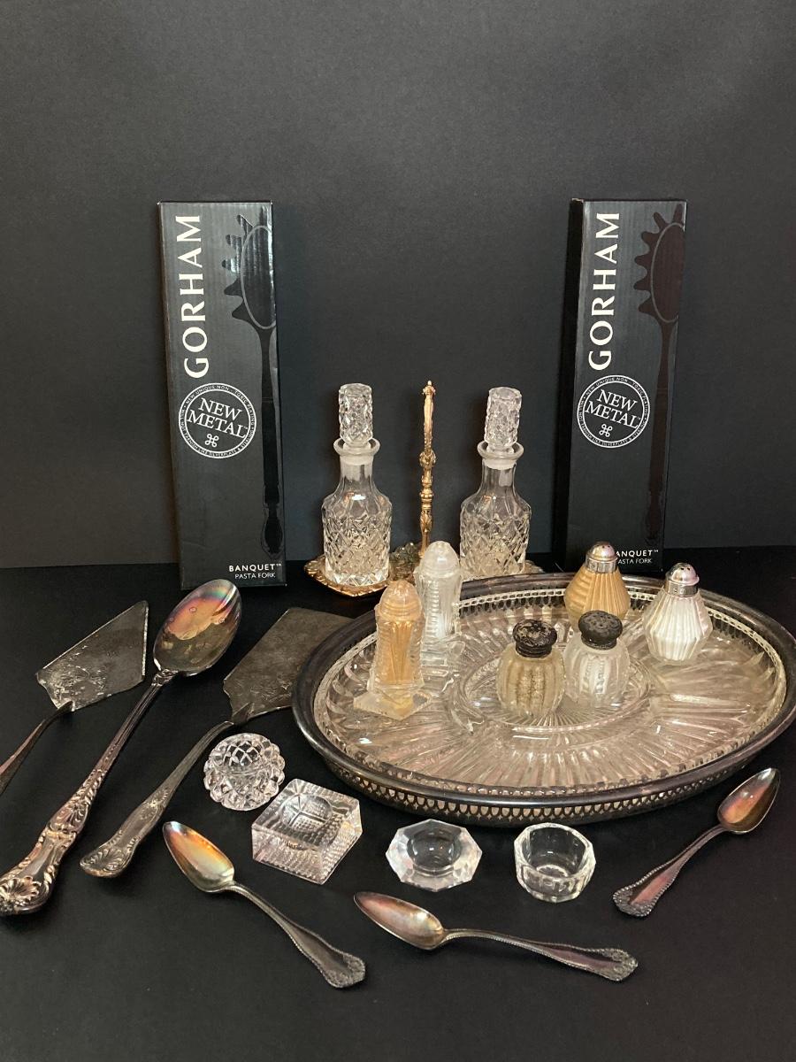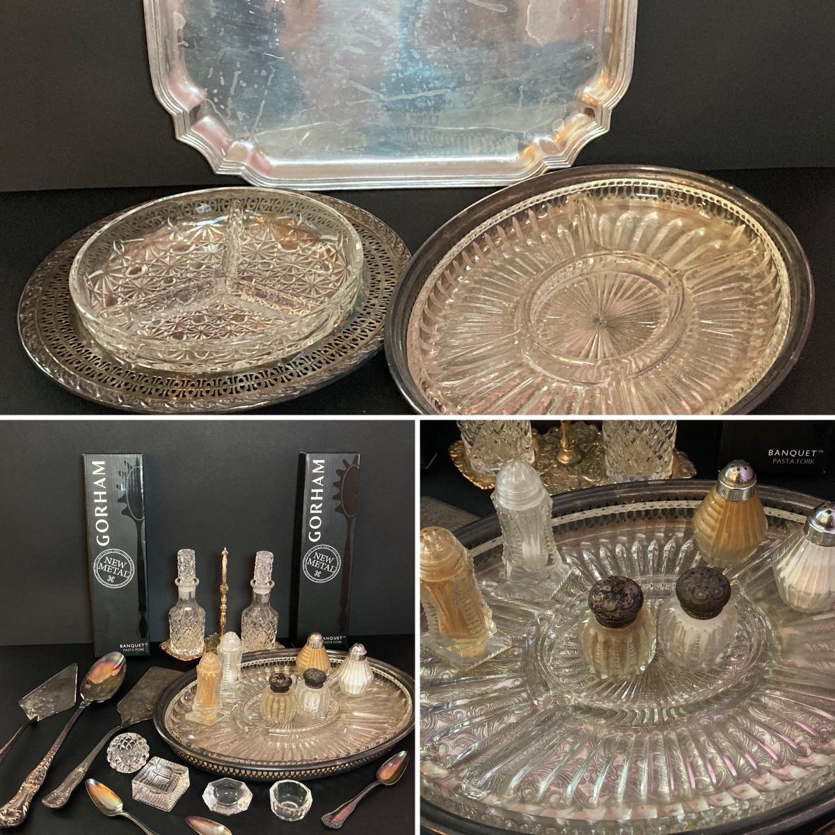 LOT 138: Large Serving Collection - Silver Plate, Pewter, Gorham, Cut Glass and More