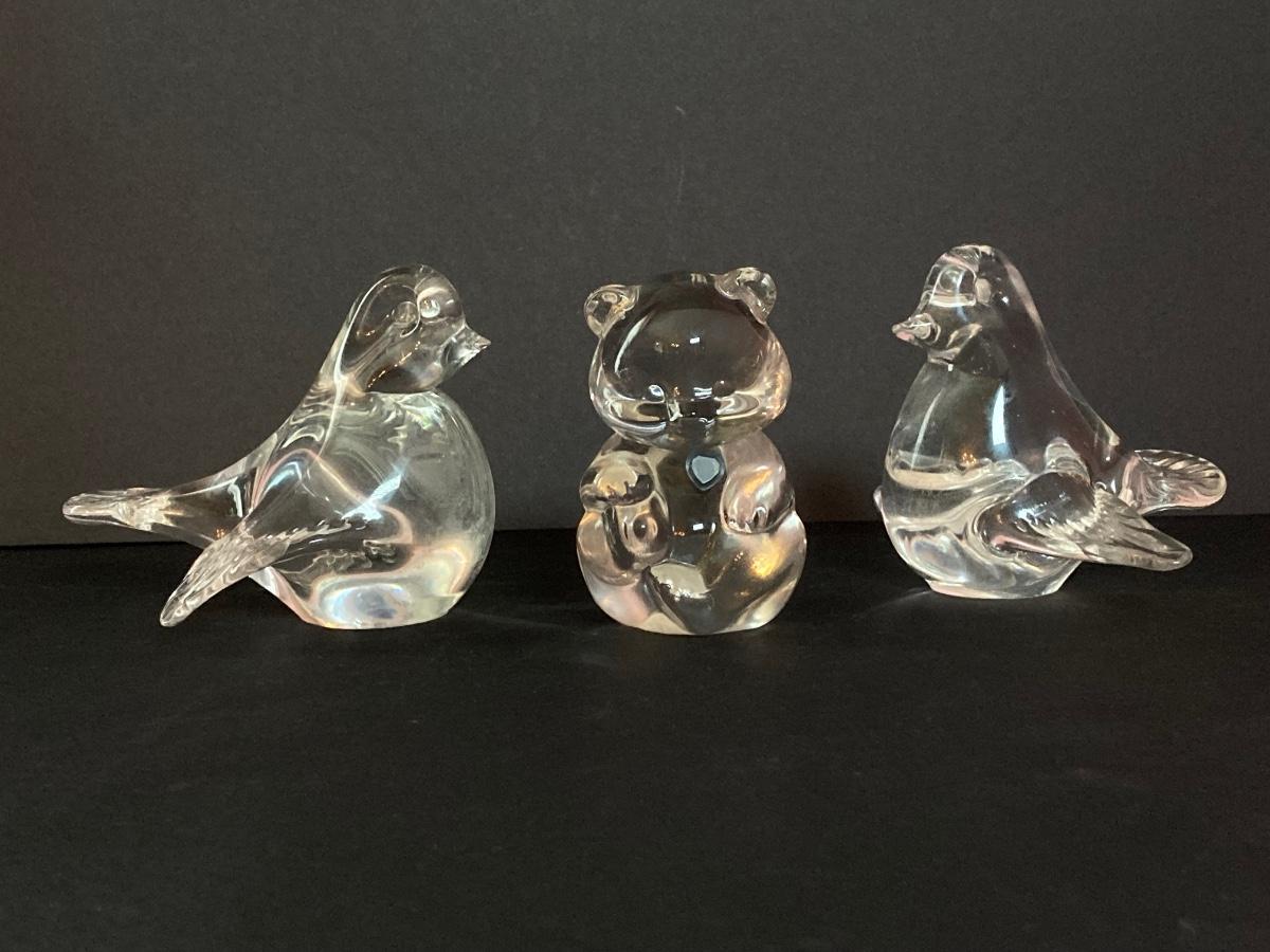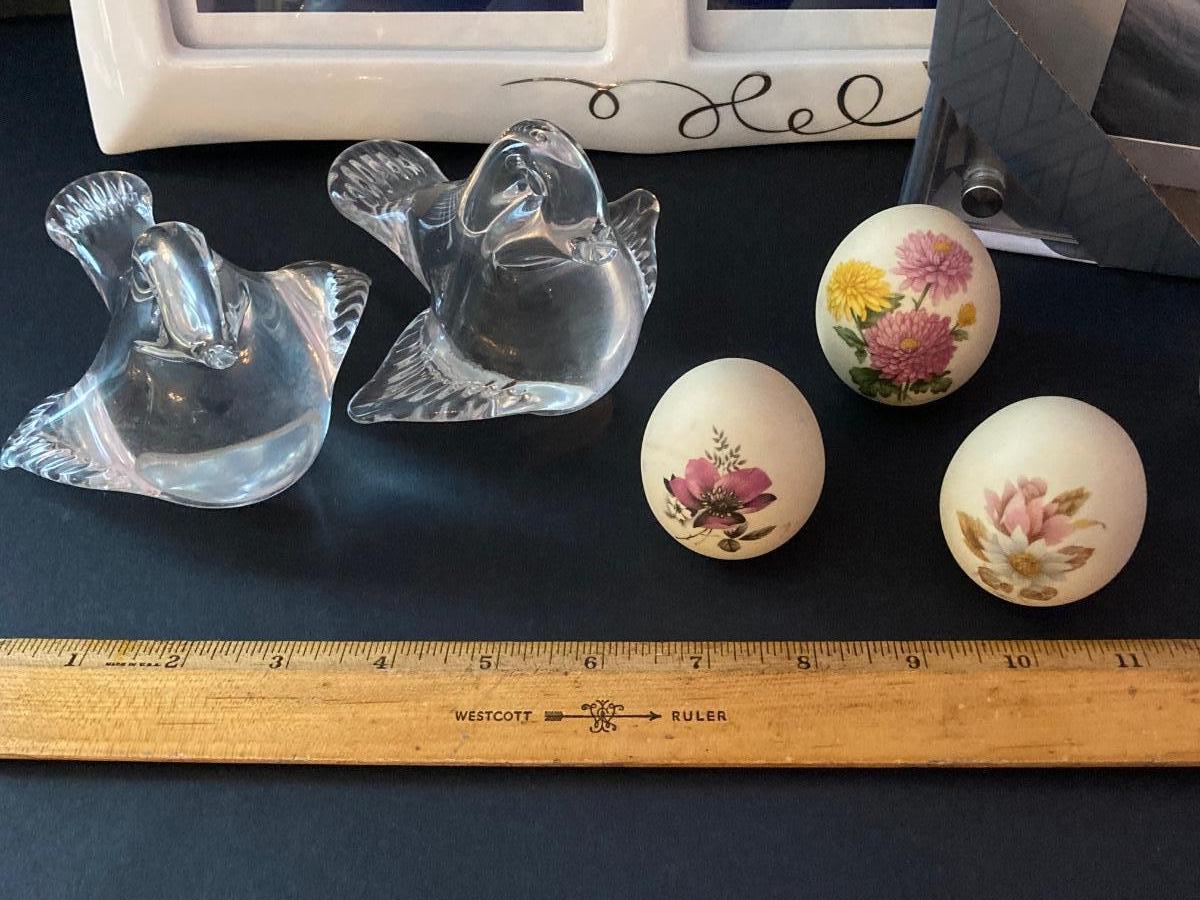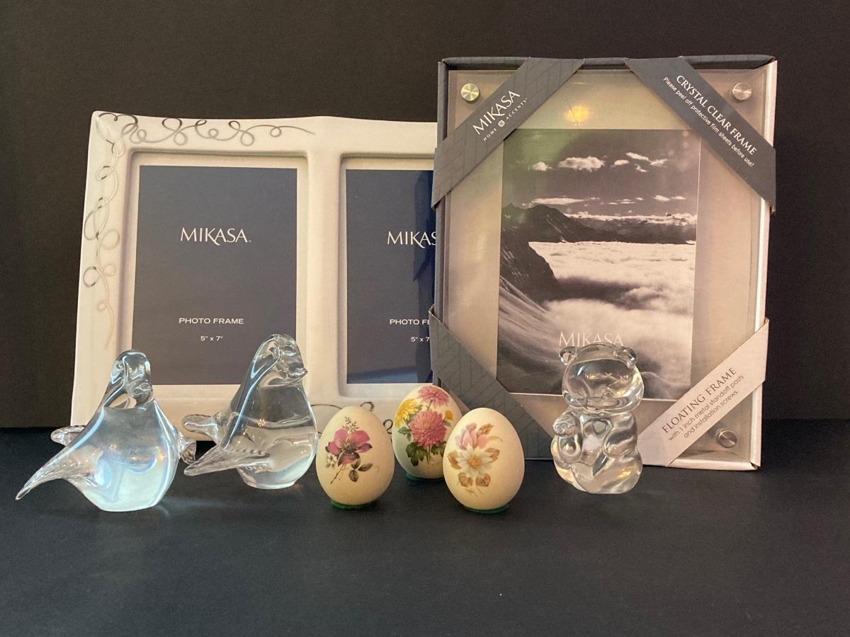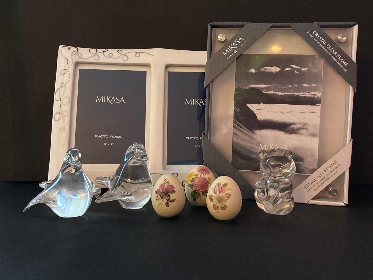 LOT 141: Signed Ivory Satin Hand Painted Egg (D. Hague), Glass Birds & Bear Figurines & Mikasa Picture Frames
