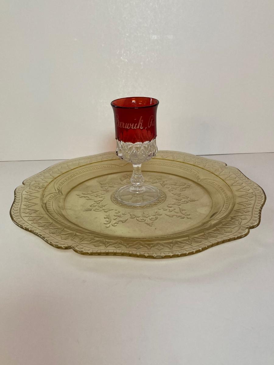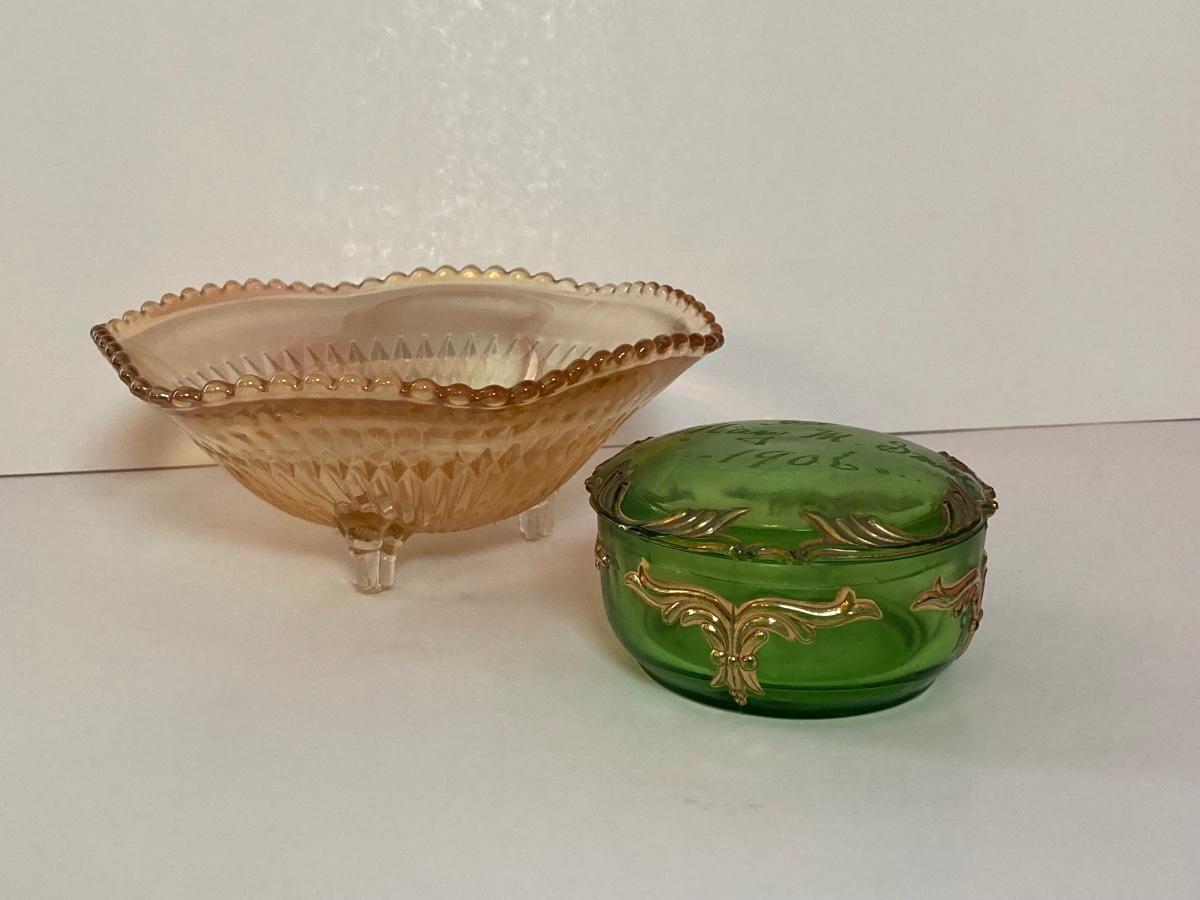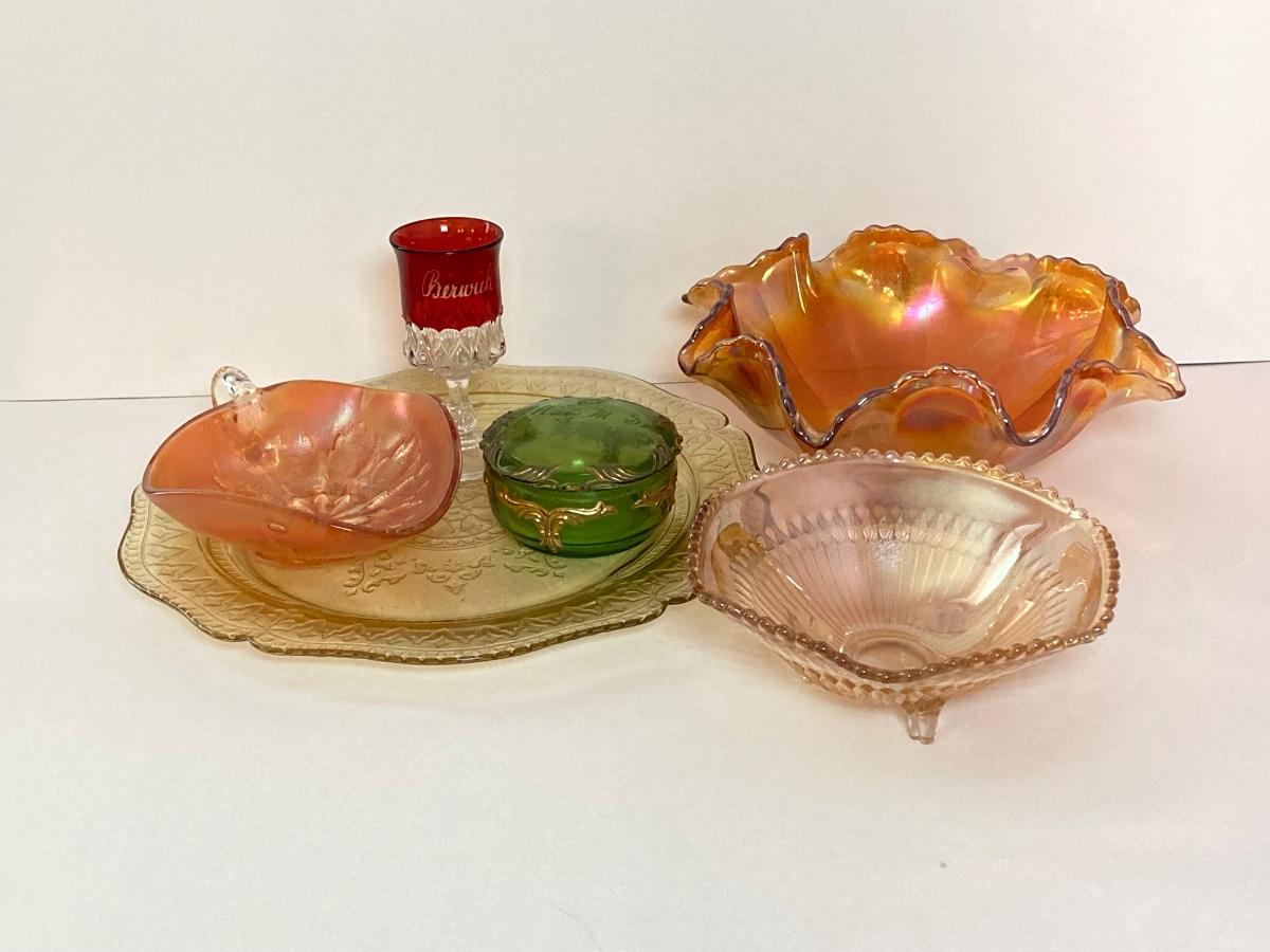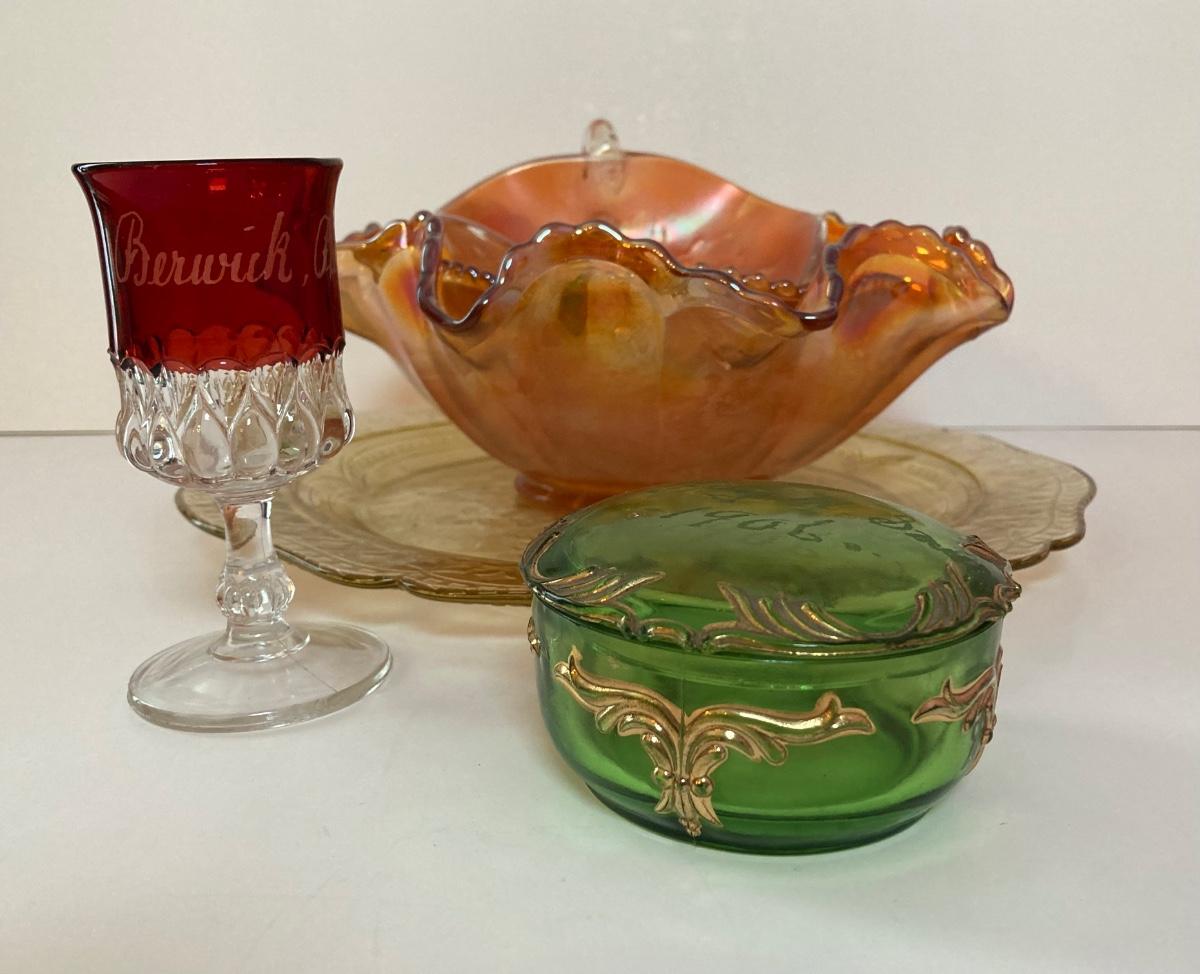 LOT 142: Collection of Antique / Vintage Glass - Carnival, Etched Personalized Trinket Dish, Berwick PA Souvenir