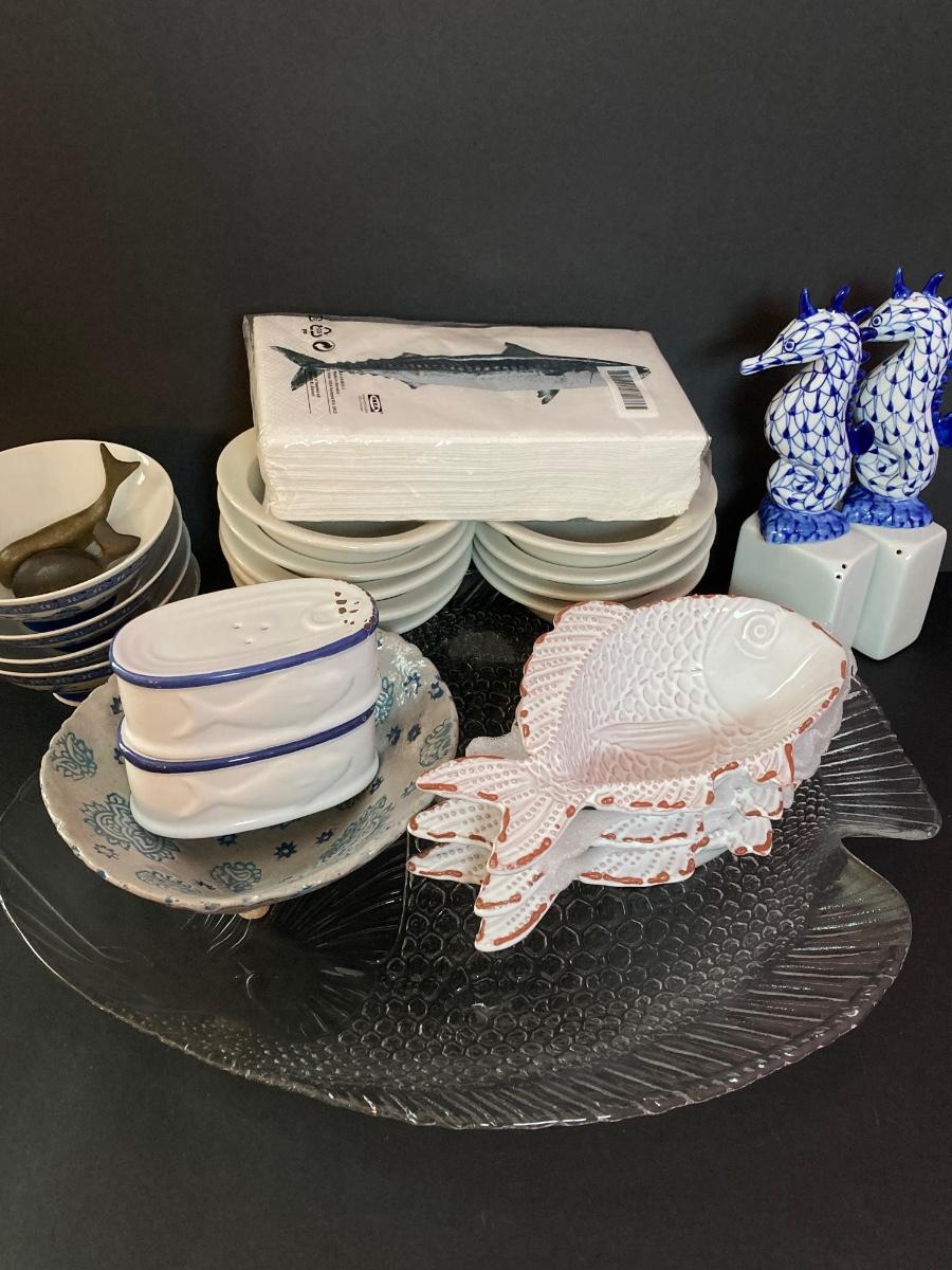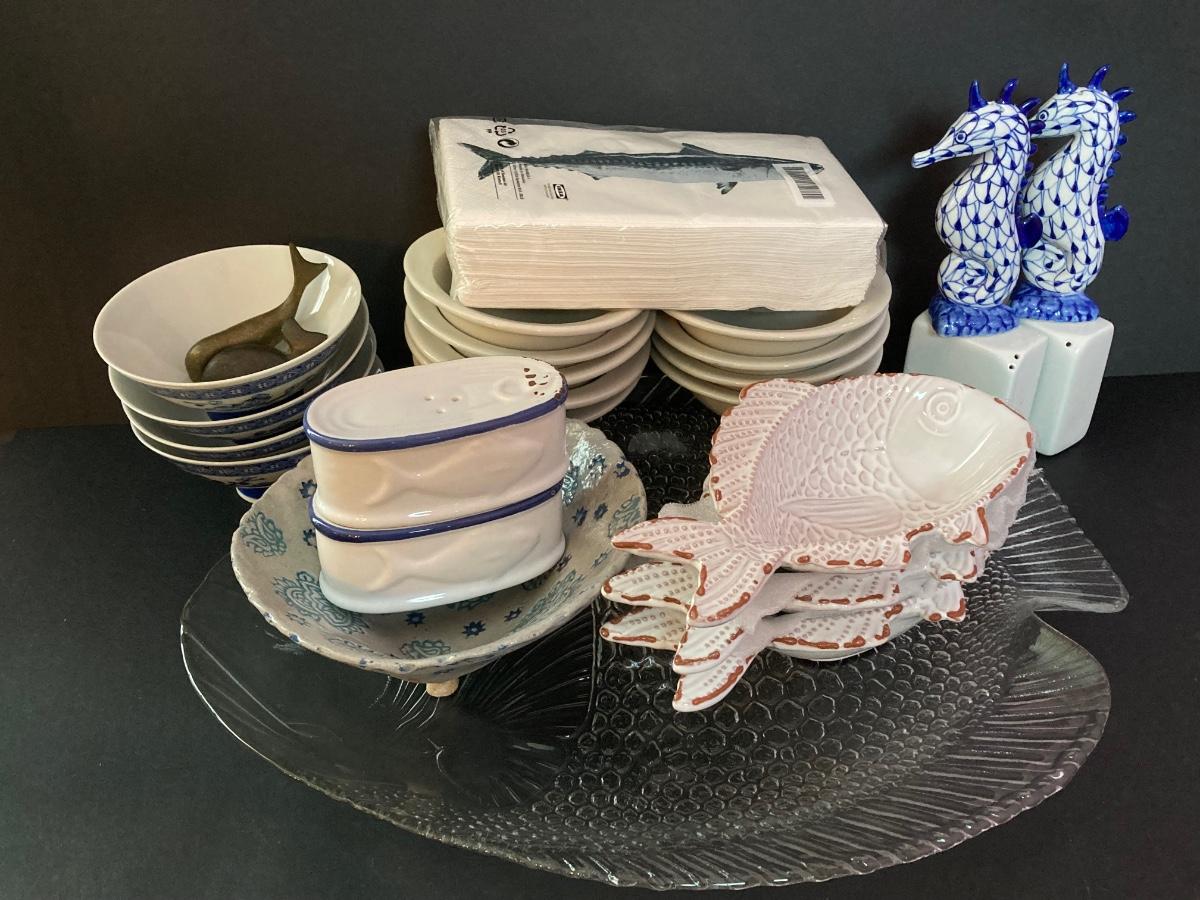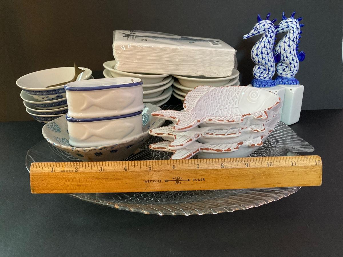 LOT 143: Nautical Themed Serving Collection - Signed Pottery, Mudpie. Glass and More