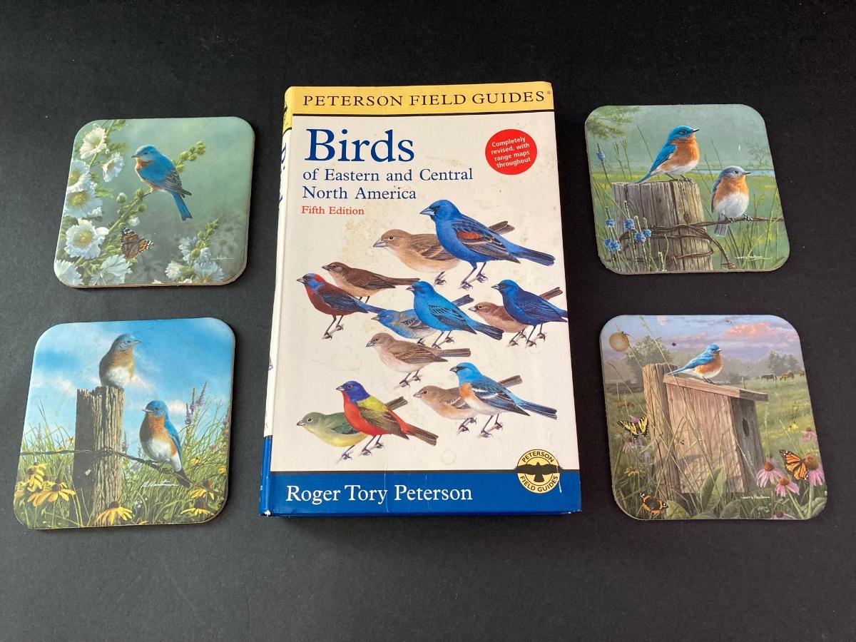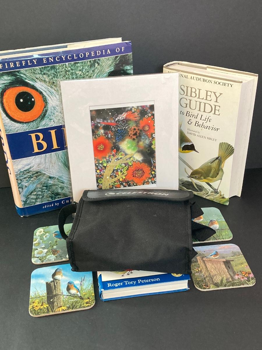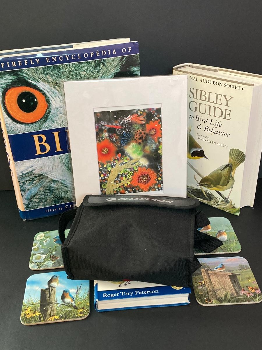 LOT 146: Bird Themed Collection - Painting by Artist Enzhao Liu, Bird Books, Coasters and Celestron Binoculars