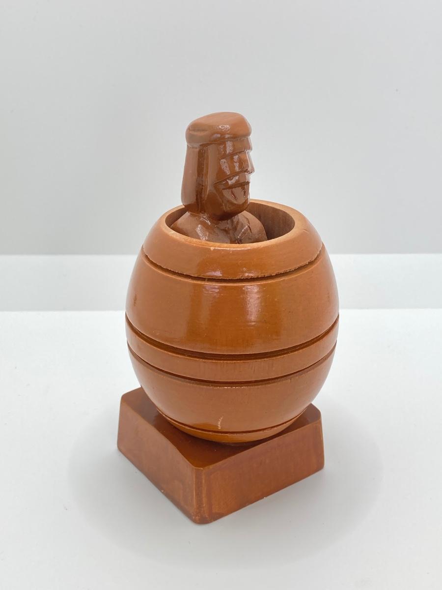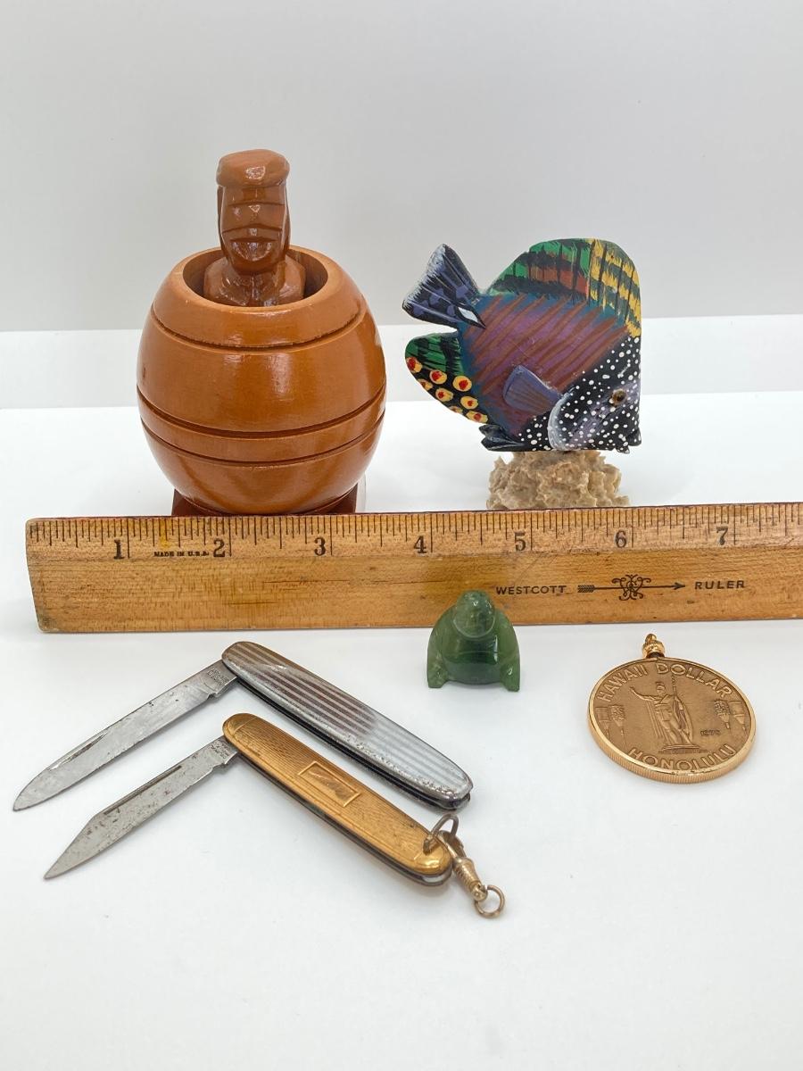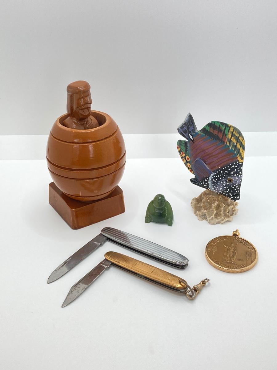 LOT 162: Vintage Collection - Pocket Knives, Honolulu Hawaii Coin, Miniature Buddha, Painted Tropical Fish and Novelty Carved Wooden Barrel with Naked Man