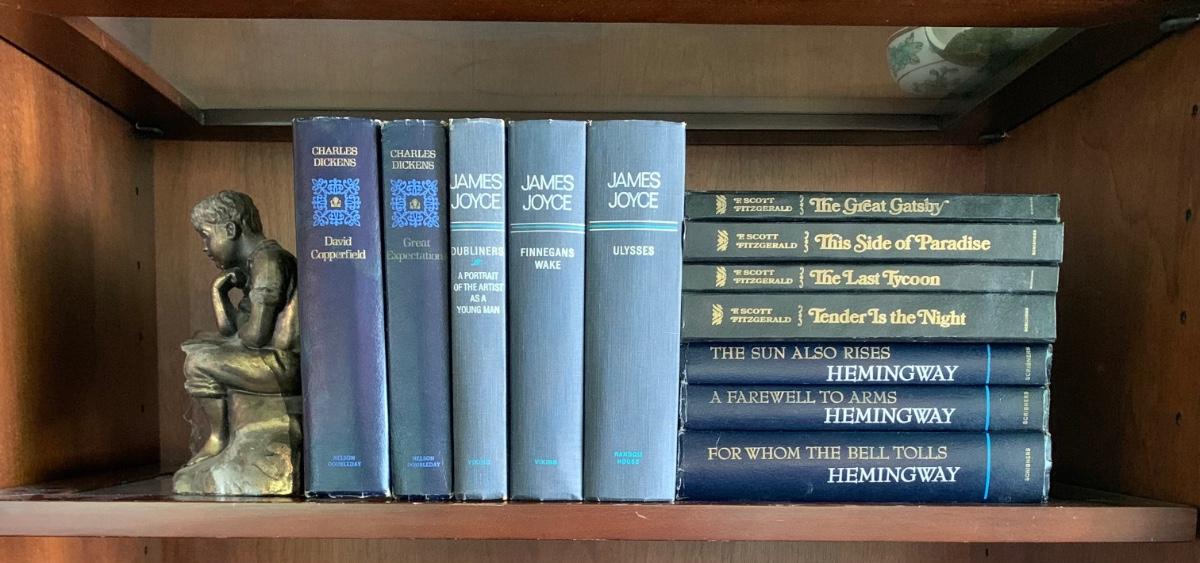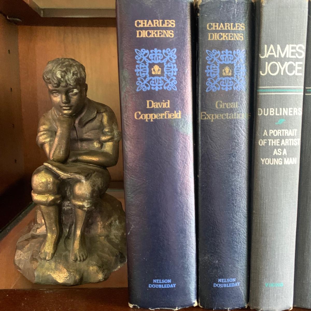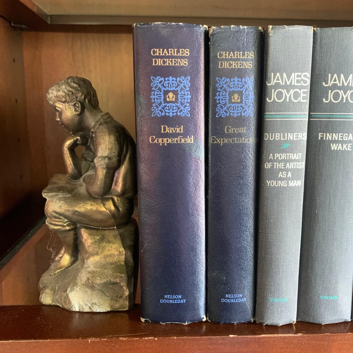 LOT 172: Bronze Thinking Boy Figure & Classic Novels by James Joyce, Charles Dickens, Hemingway & F. Scott Fitzgerald