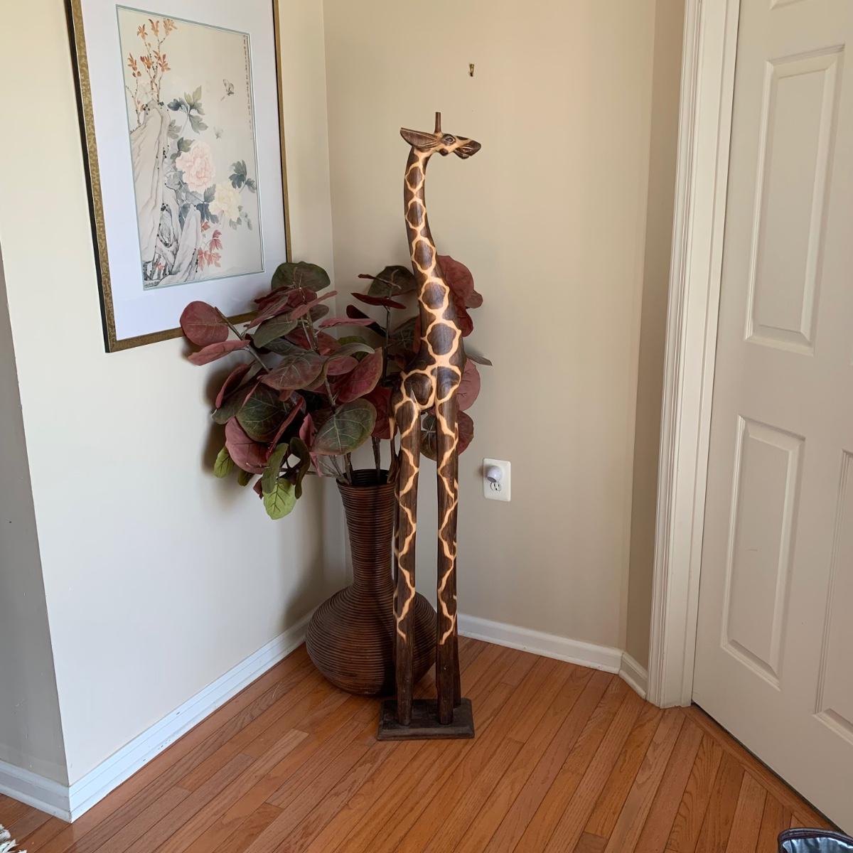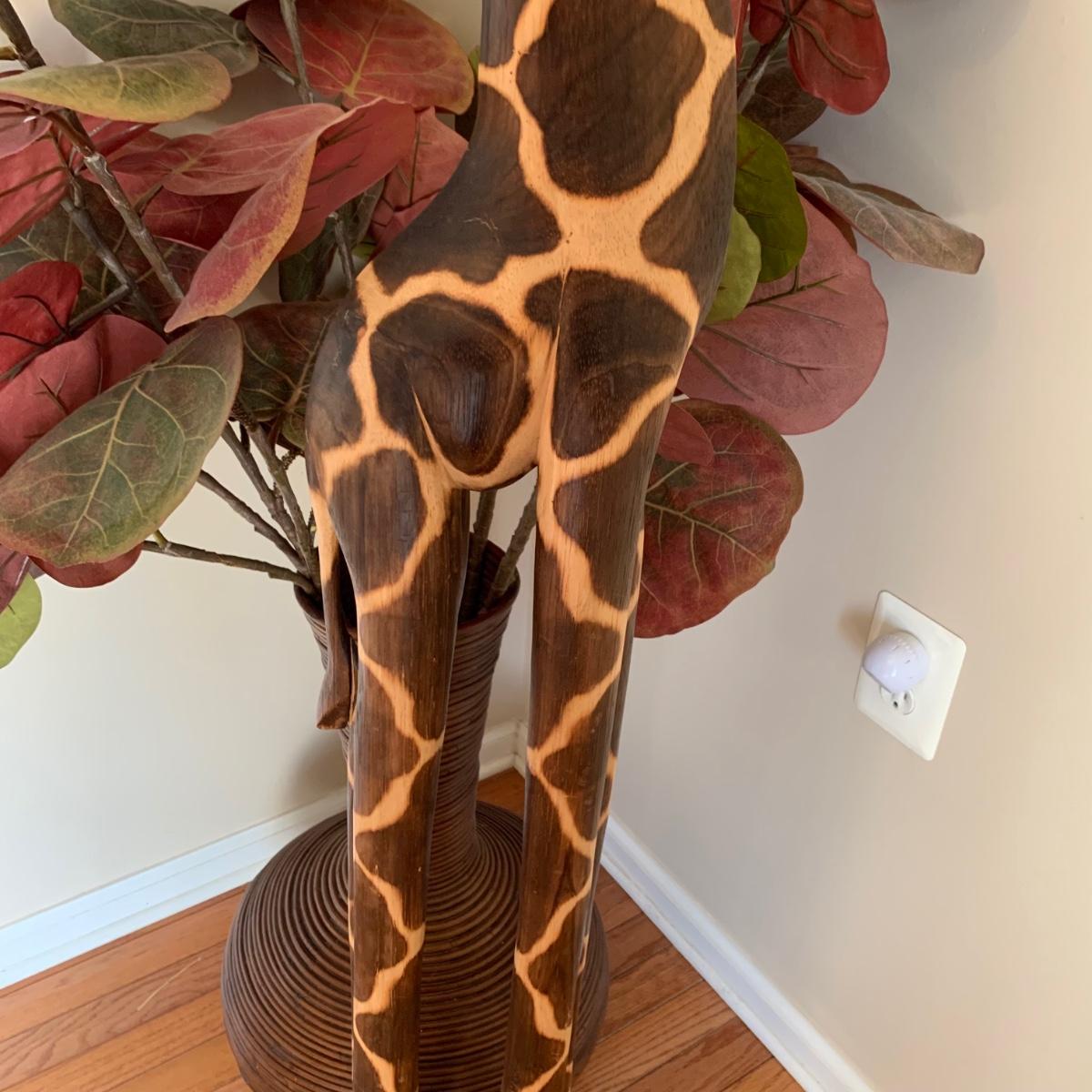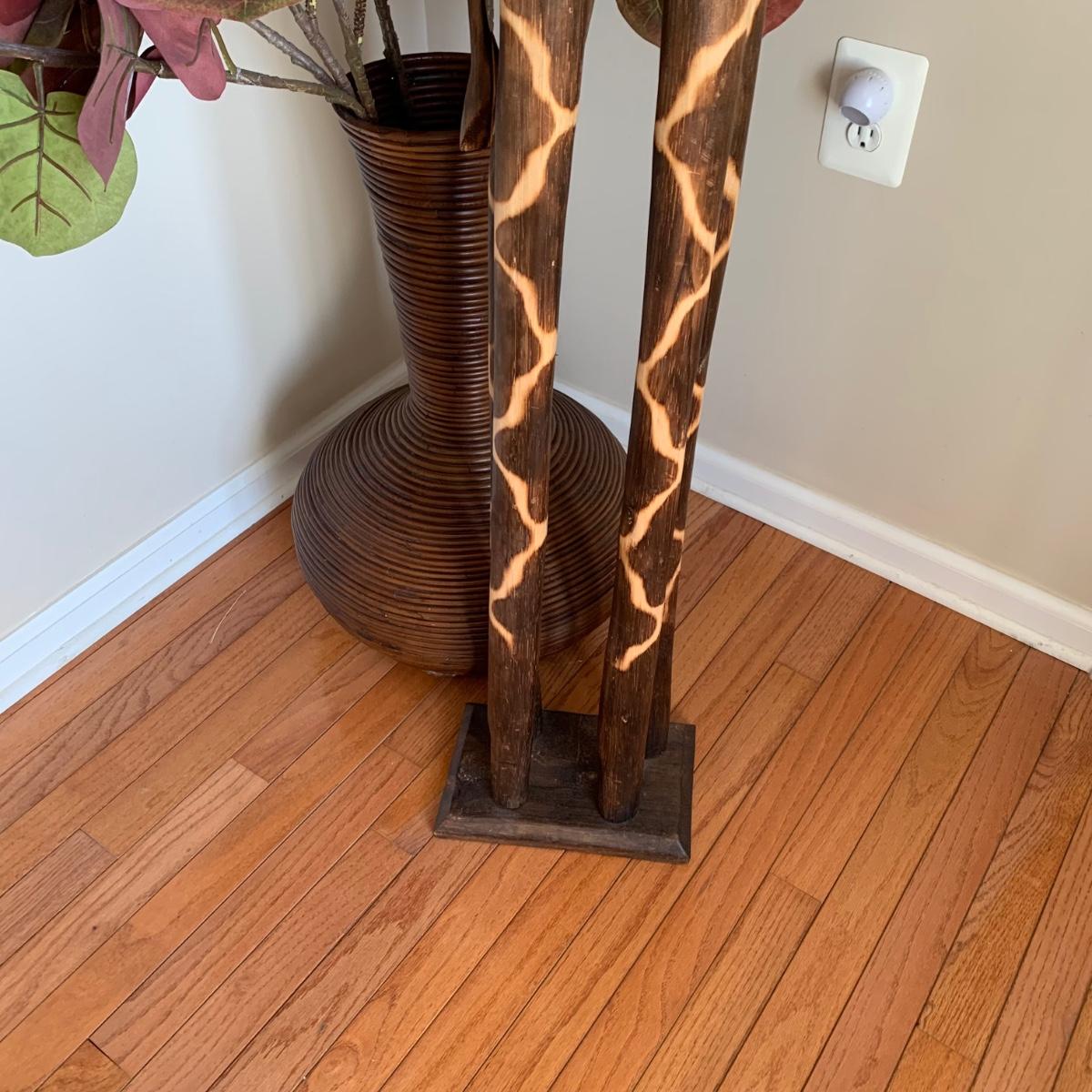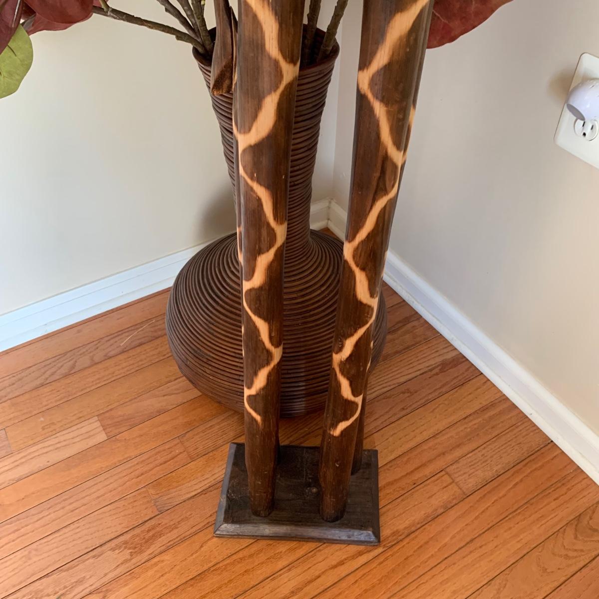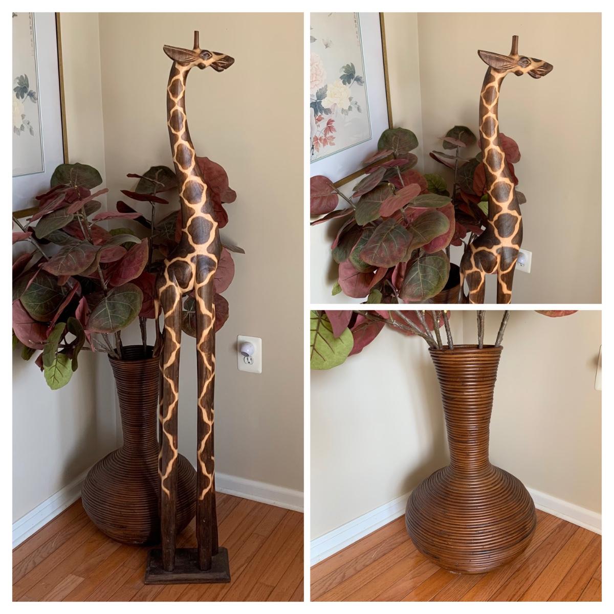 LOT 176: Wood Sculpture of Giraffe & Pencil Reed Rattan Floor Basket/Vase w/Faux Plant