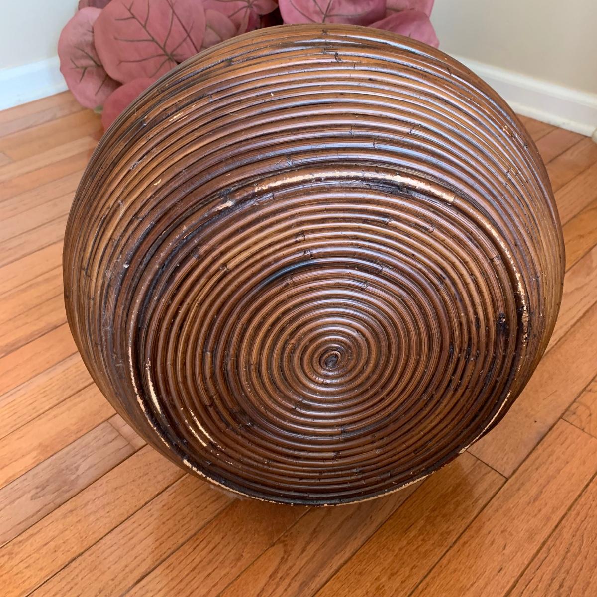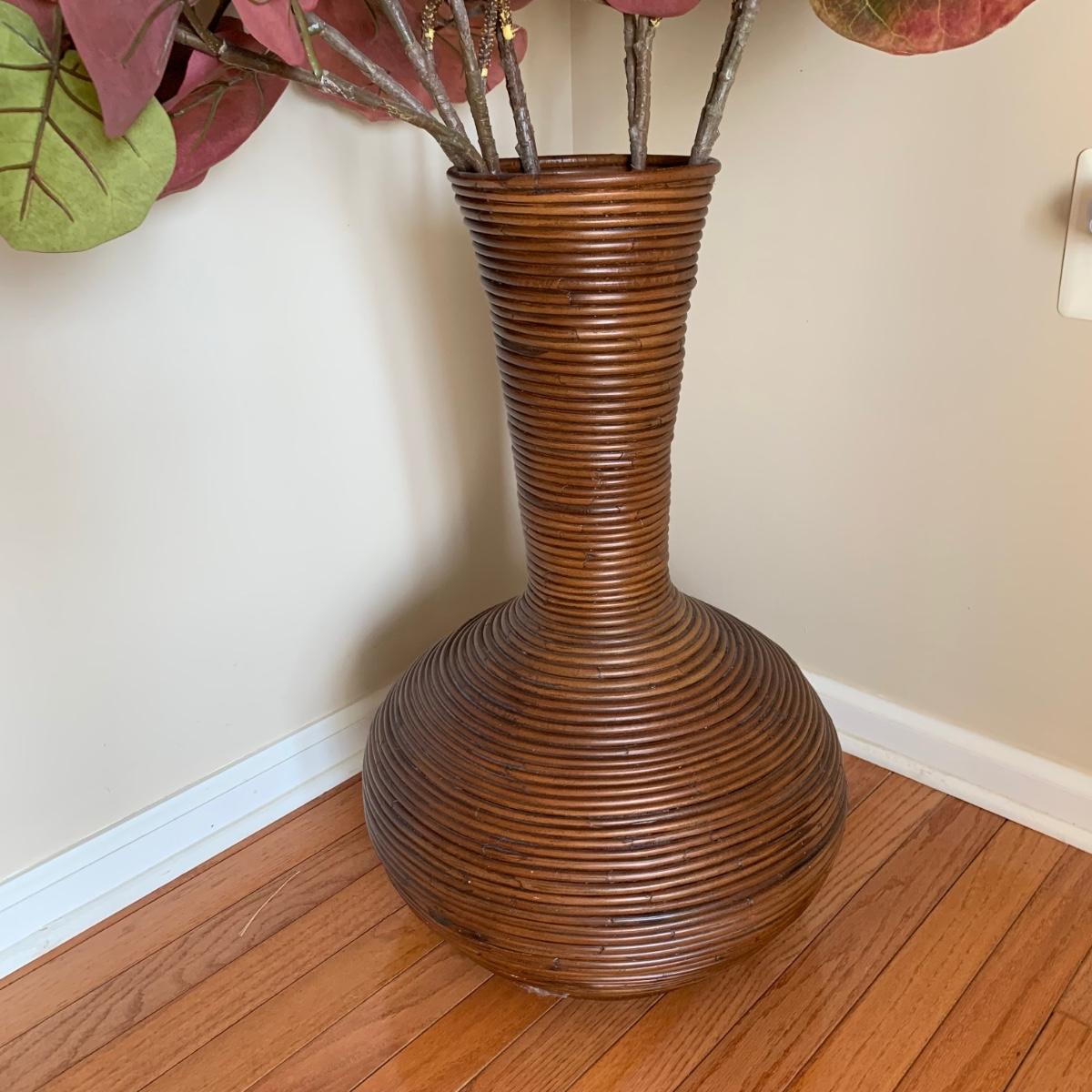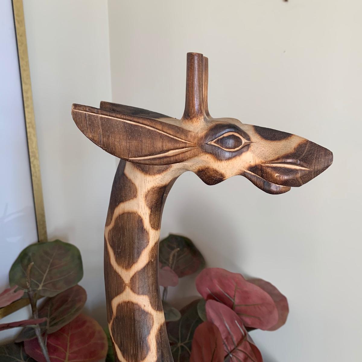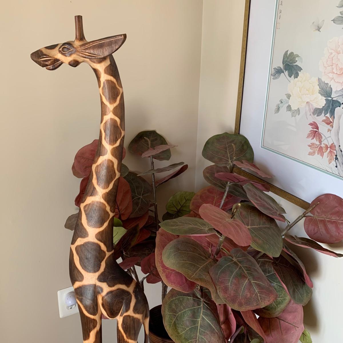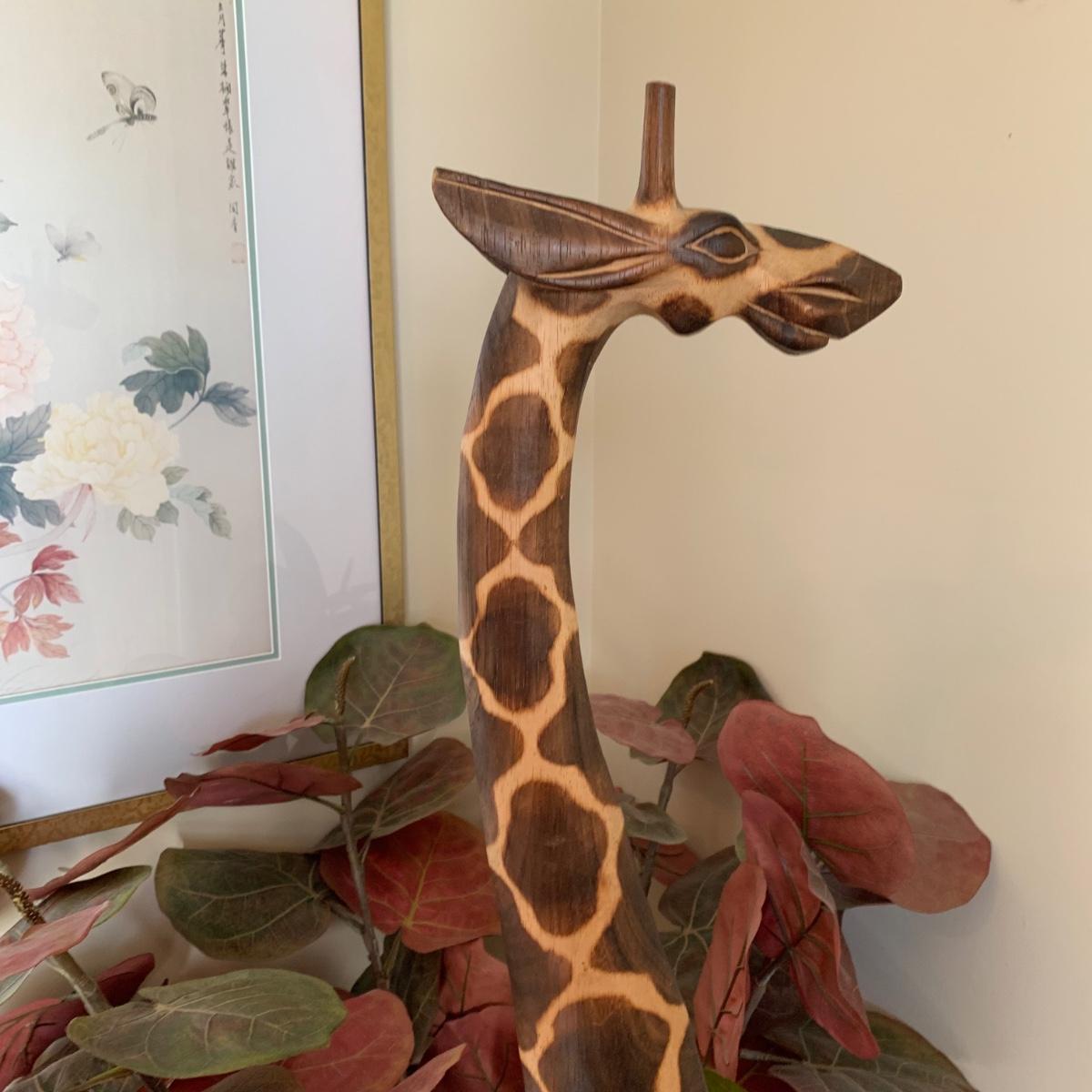 LOT 176: Wood Sculpture of Giraffe & Pencil Reed Rattan Floor Basket/Vase w/Faux Plant
