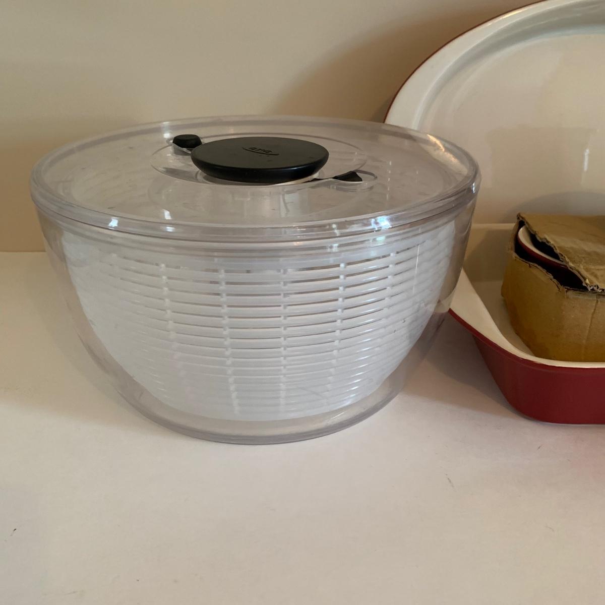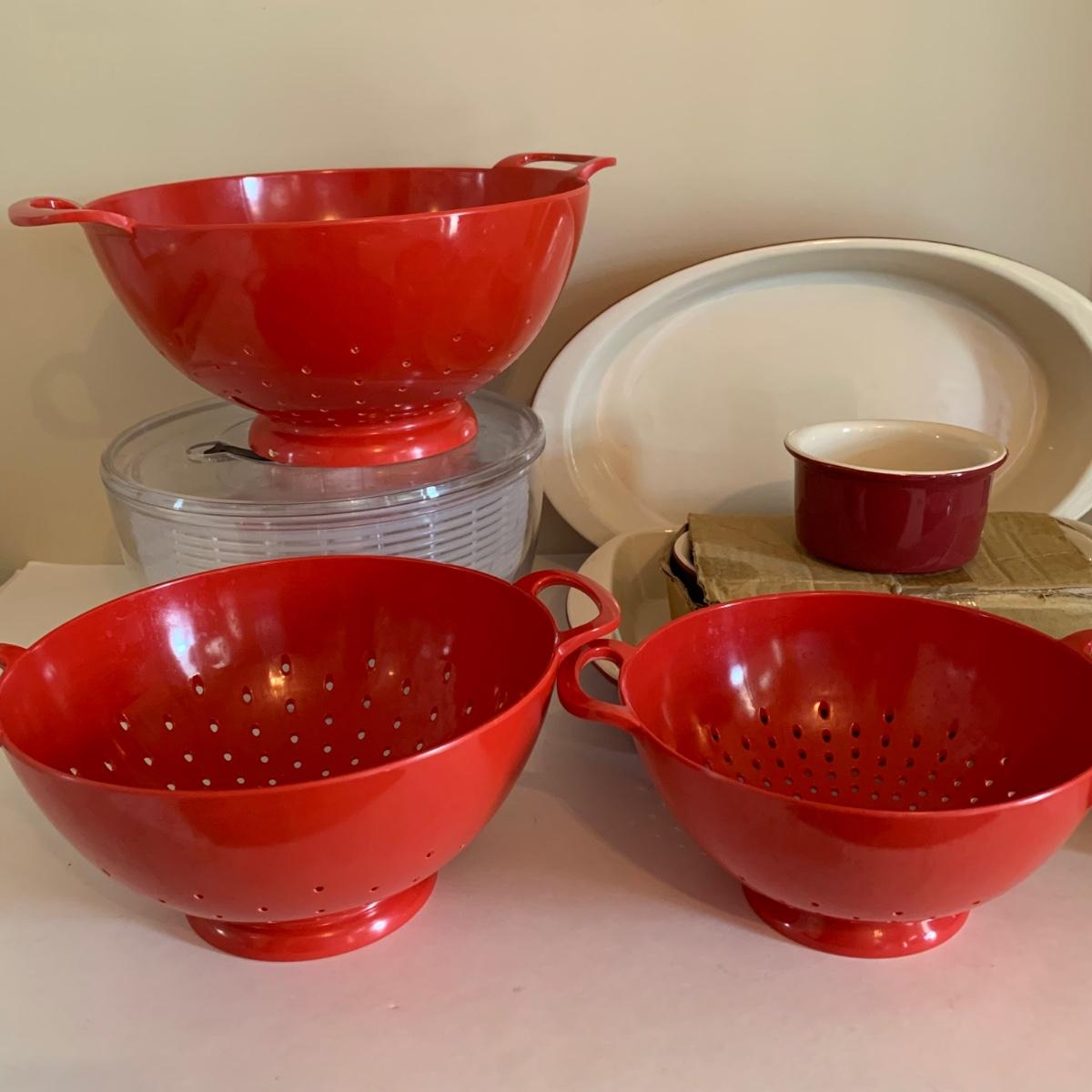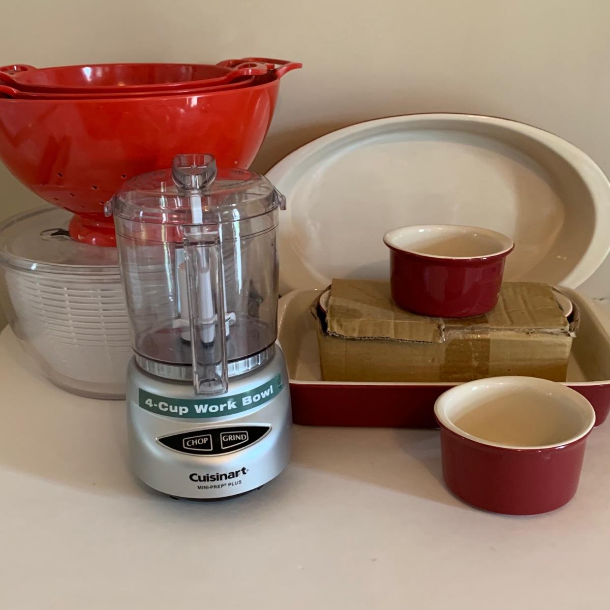 LOT 178: Cuisinart Mini-Press Plus # CGC-4PC5, Salad Spinner, Red Colander Set. Mayfair & Jackson Casserole Dishes & Ramekins