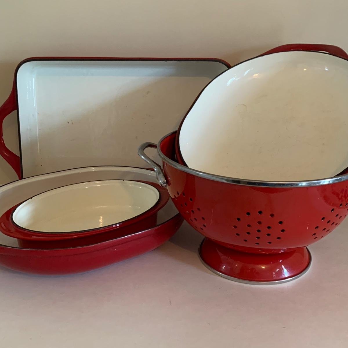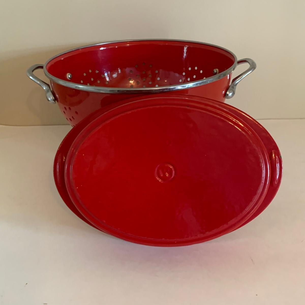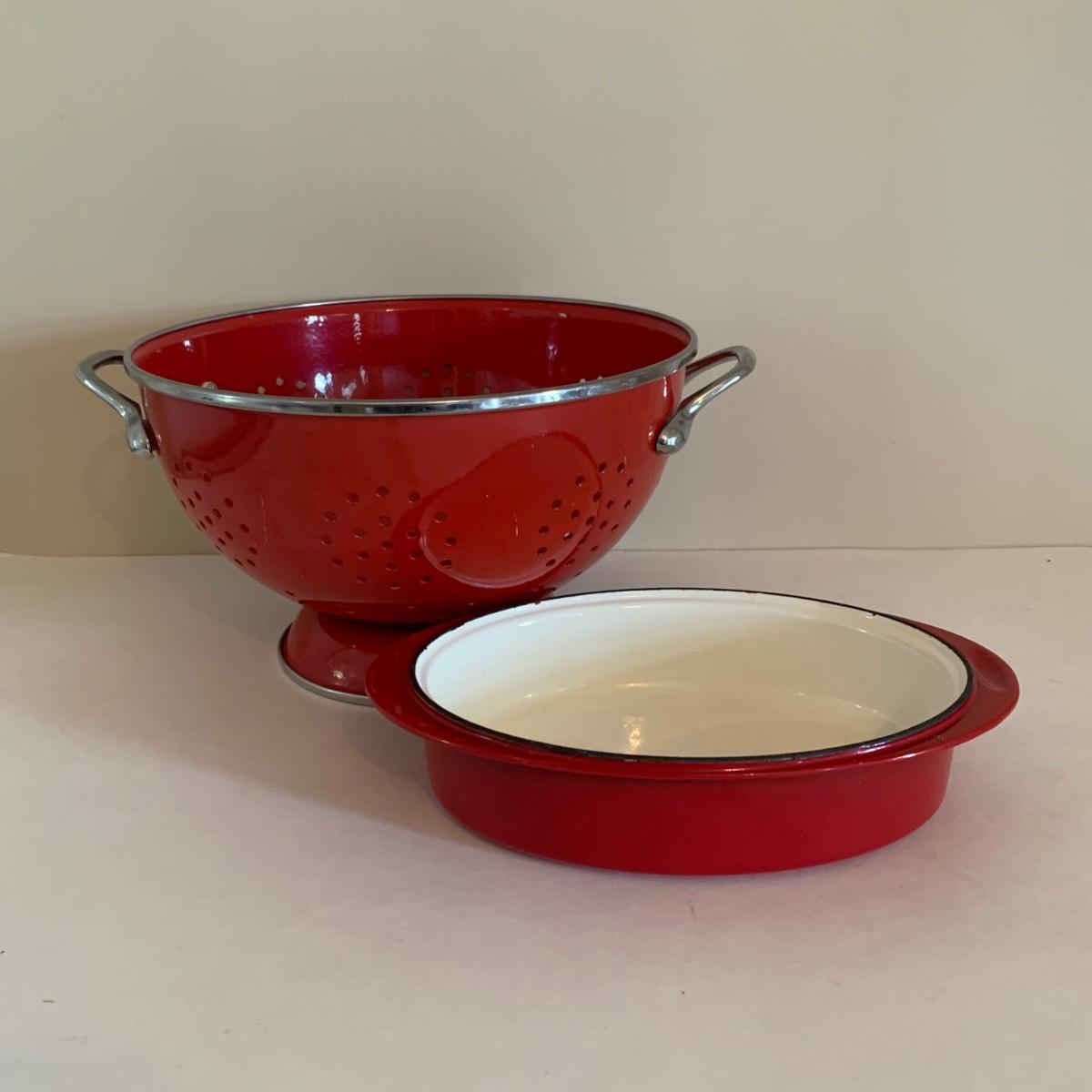 LOT 179: Red Enamel Cast Iron Cookware & Red Metal Colander