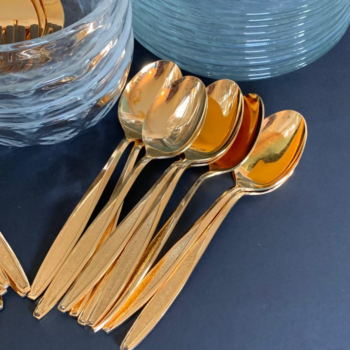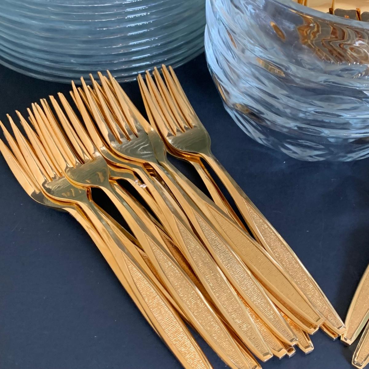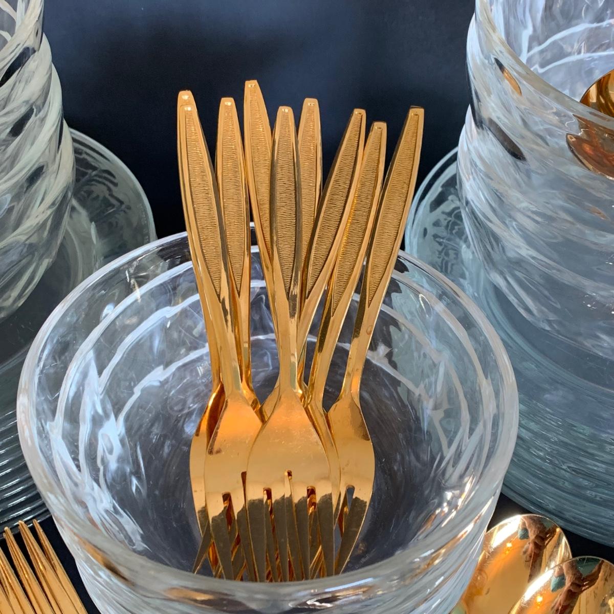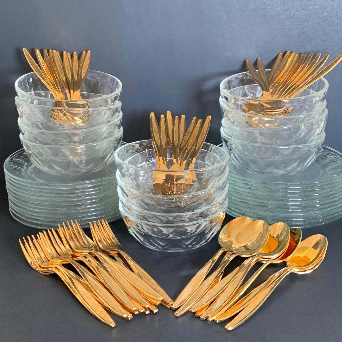 LOT 204: Royalton Gold Tone Flatware, Pyrex Teardrop Bowls, Arcoroc of France Plates