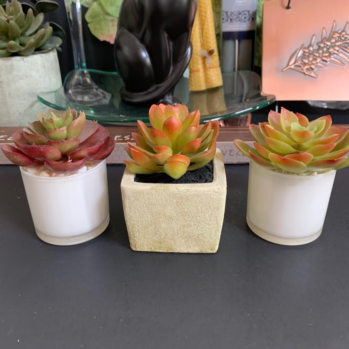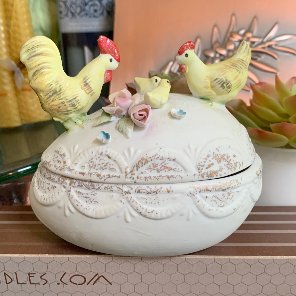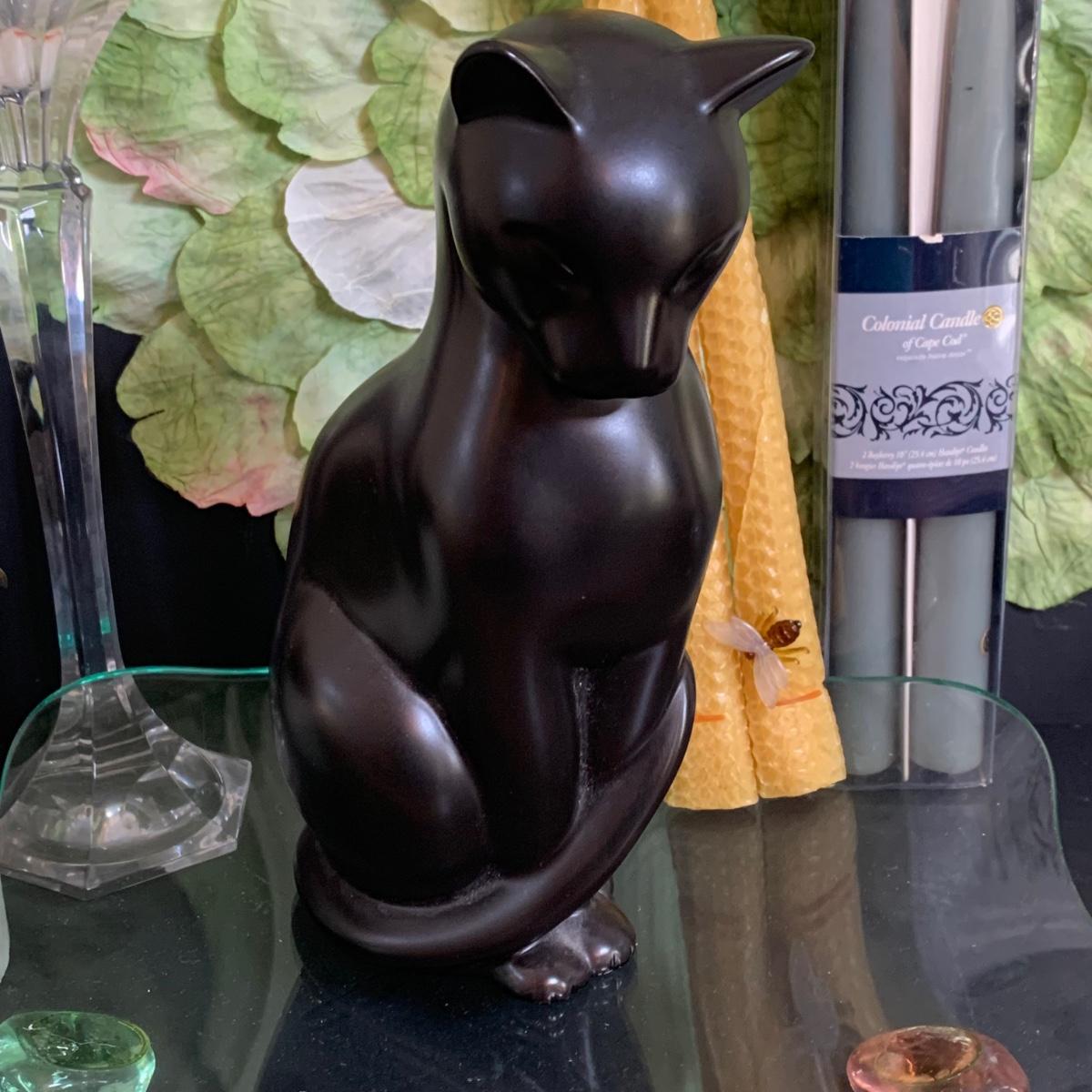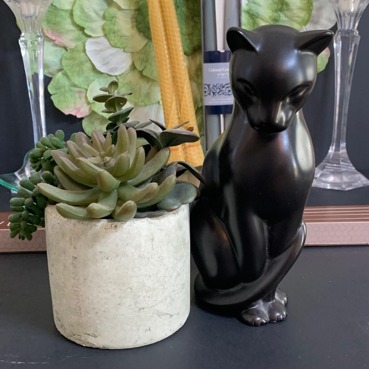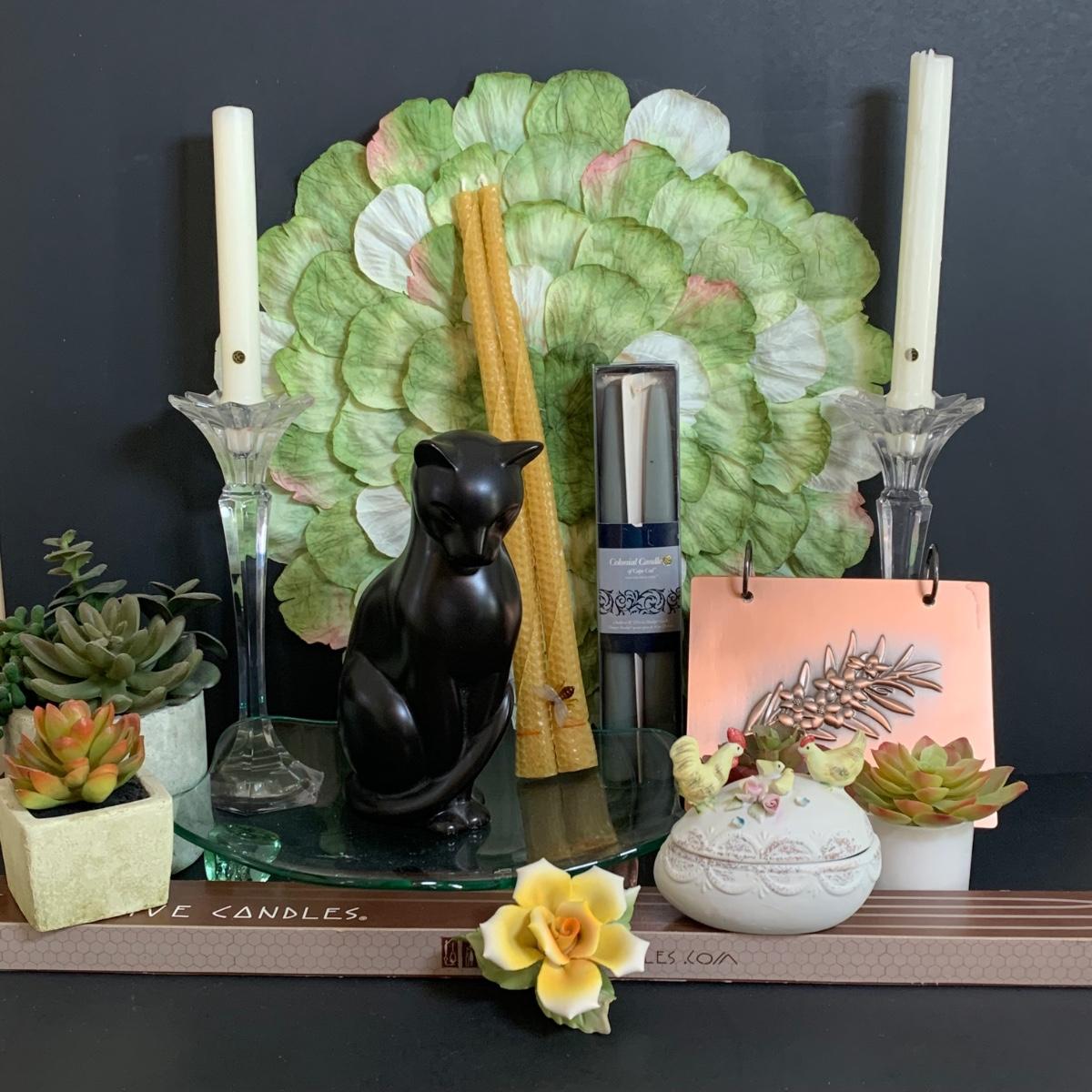 LOT 207: Home Decor: Black Ceramic Cat, Lefton Egg, Bees Wax Candles, 24" Orchid Creative Candles (NIP), Vintage Tri-Color Base Trinket Dish. Faux Plants & More