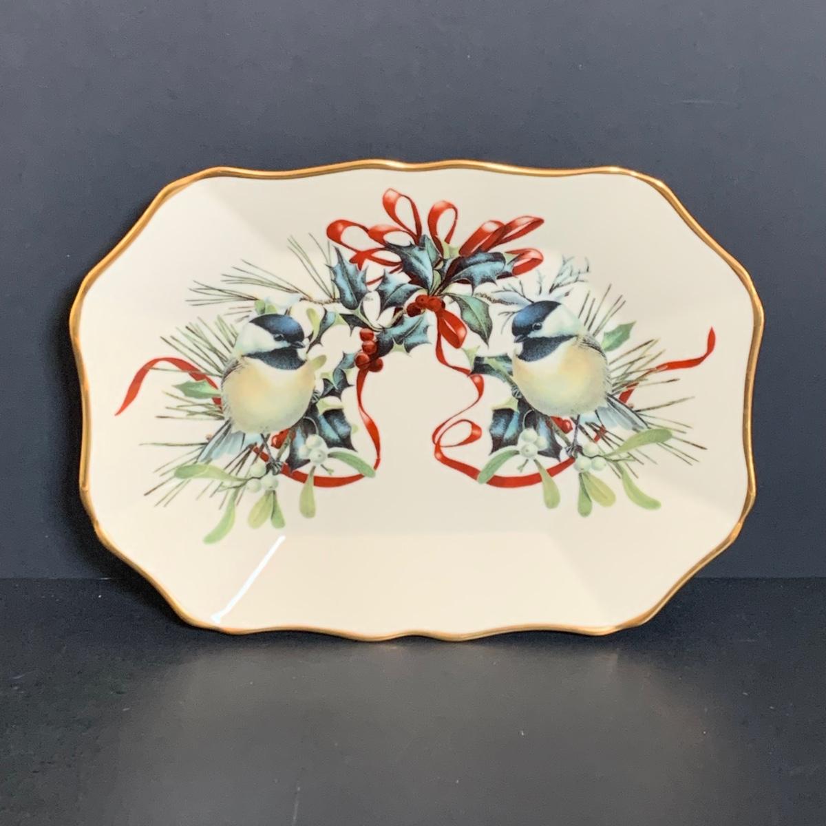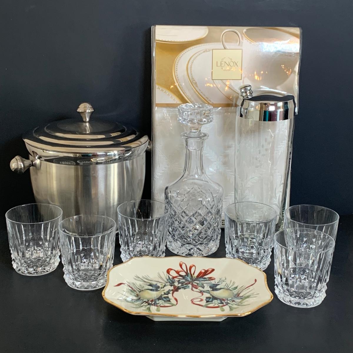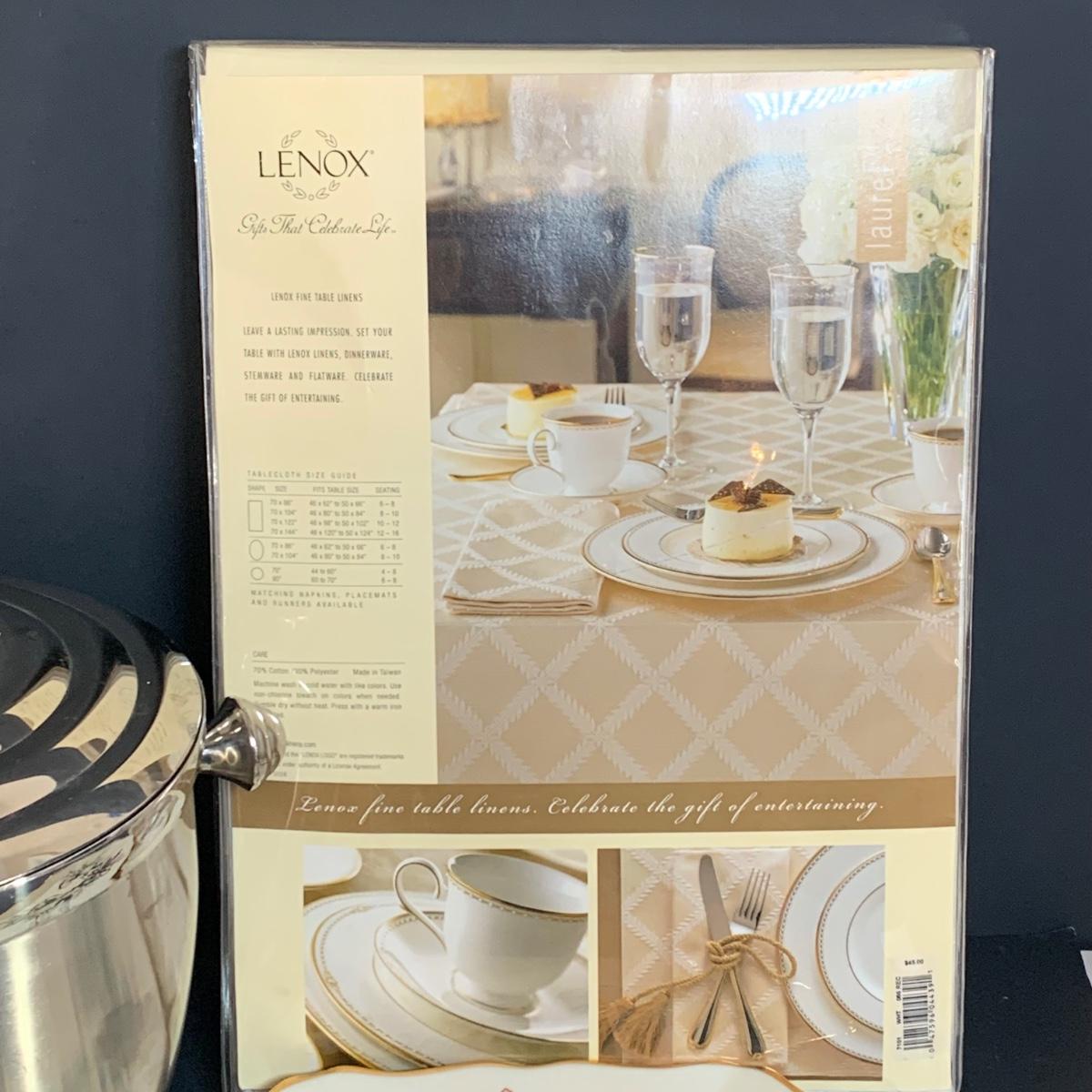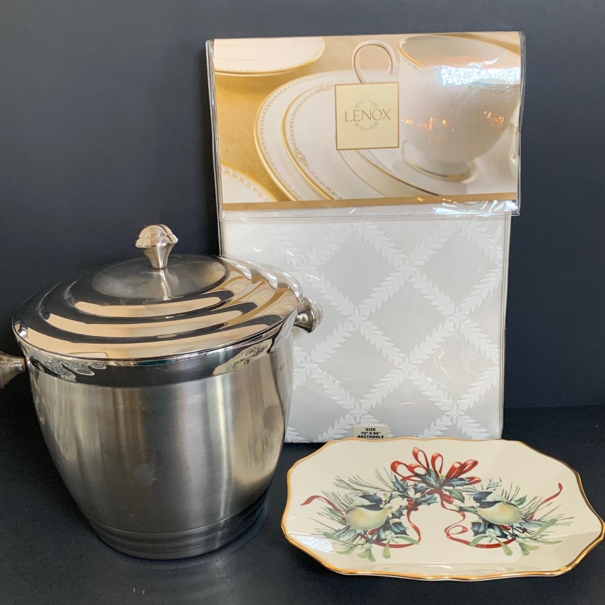 LOT 211: Lenox & More Collection: Stainless Steel Lenox Ice Bucket w/Lid, Lenox Tablecloth (NIP), Lenox Holly Chickadee Dish