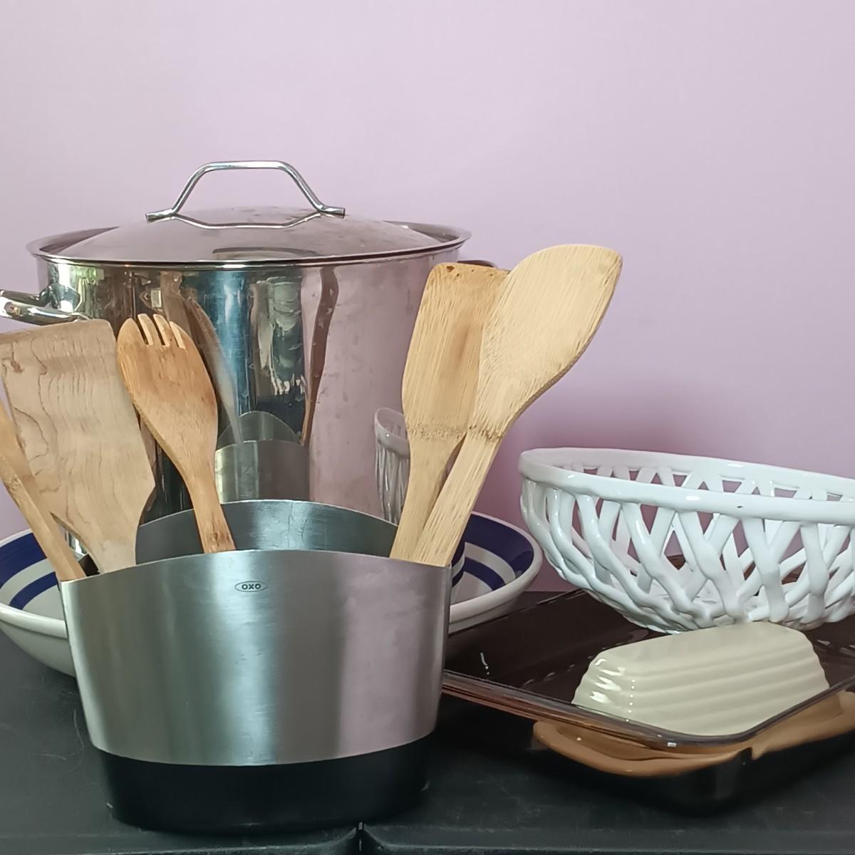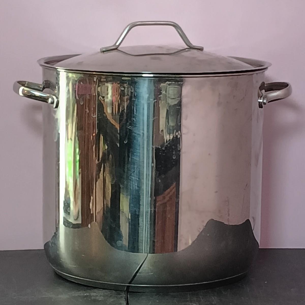 LOT 261: Kitchen Collection- Pfaltzgraff Butter Dish, Amber Pyrex Baking Dish, 16 Qt Stock Pot & More