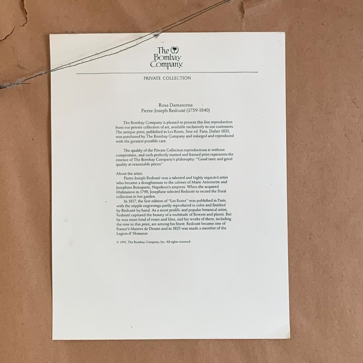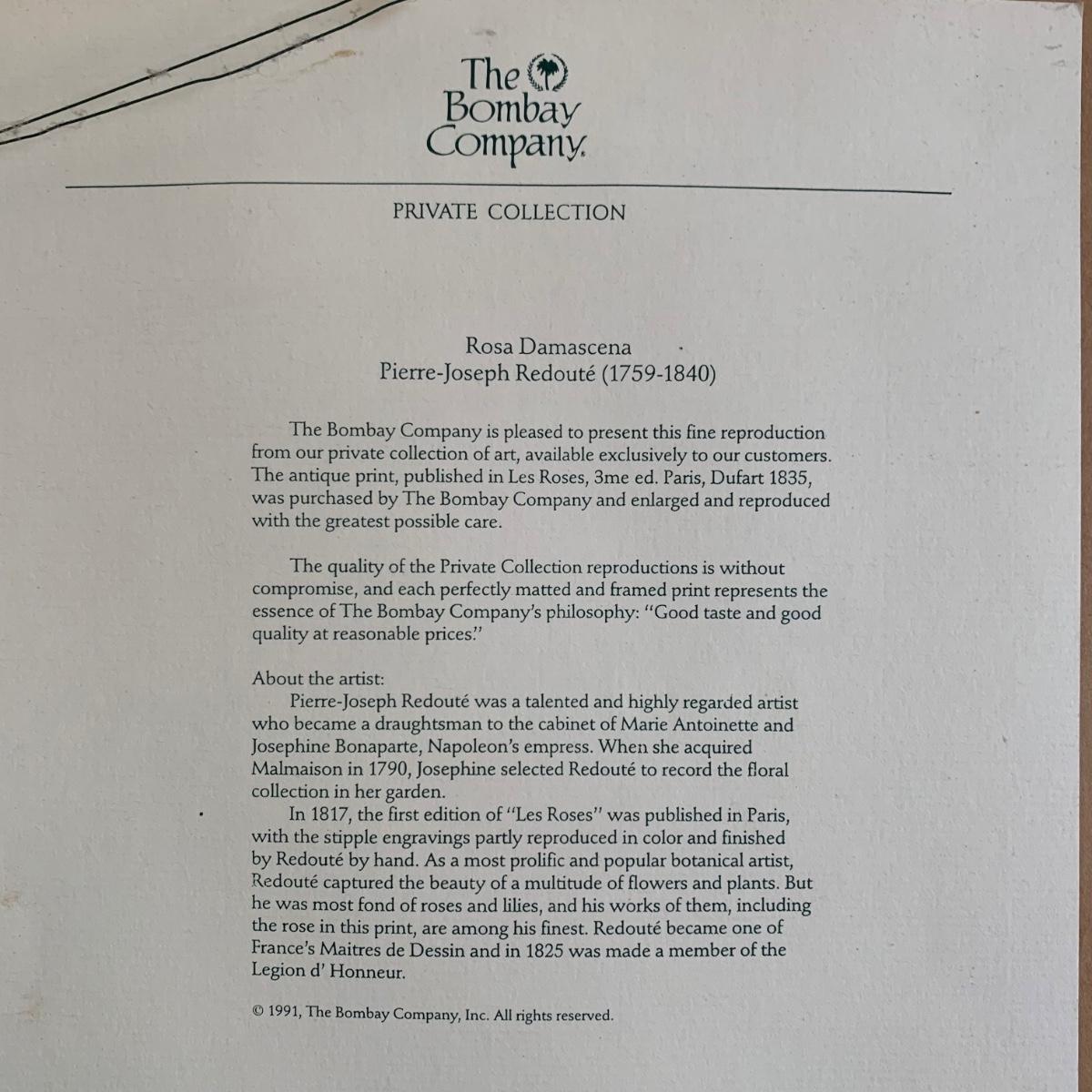 LOT 271: The Bombay Company Private Collection: Reproduction Print of "Les Roses" by Pierre-Joseph Redoute