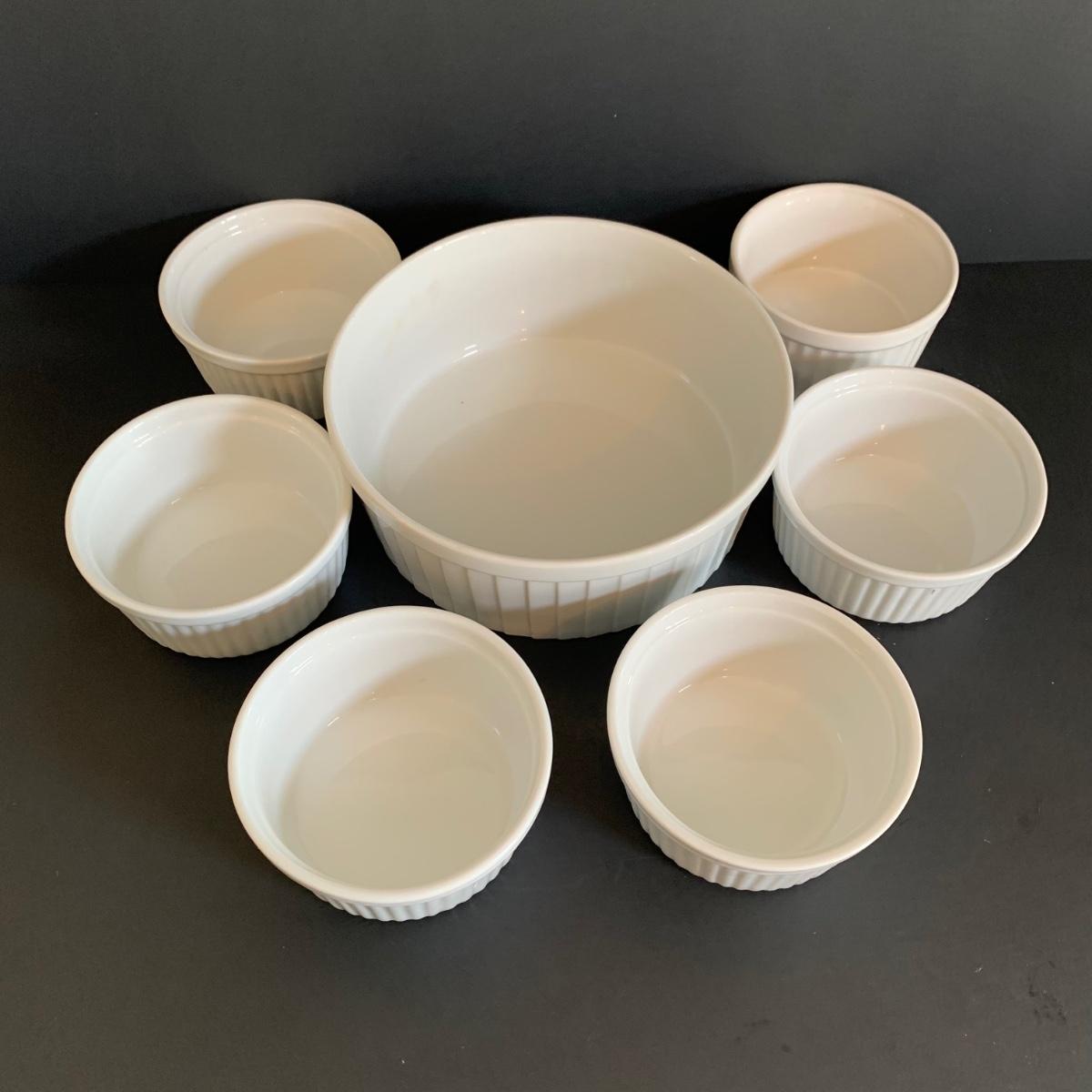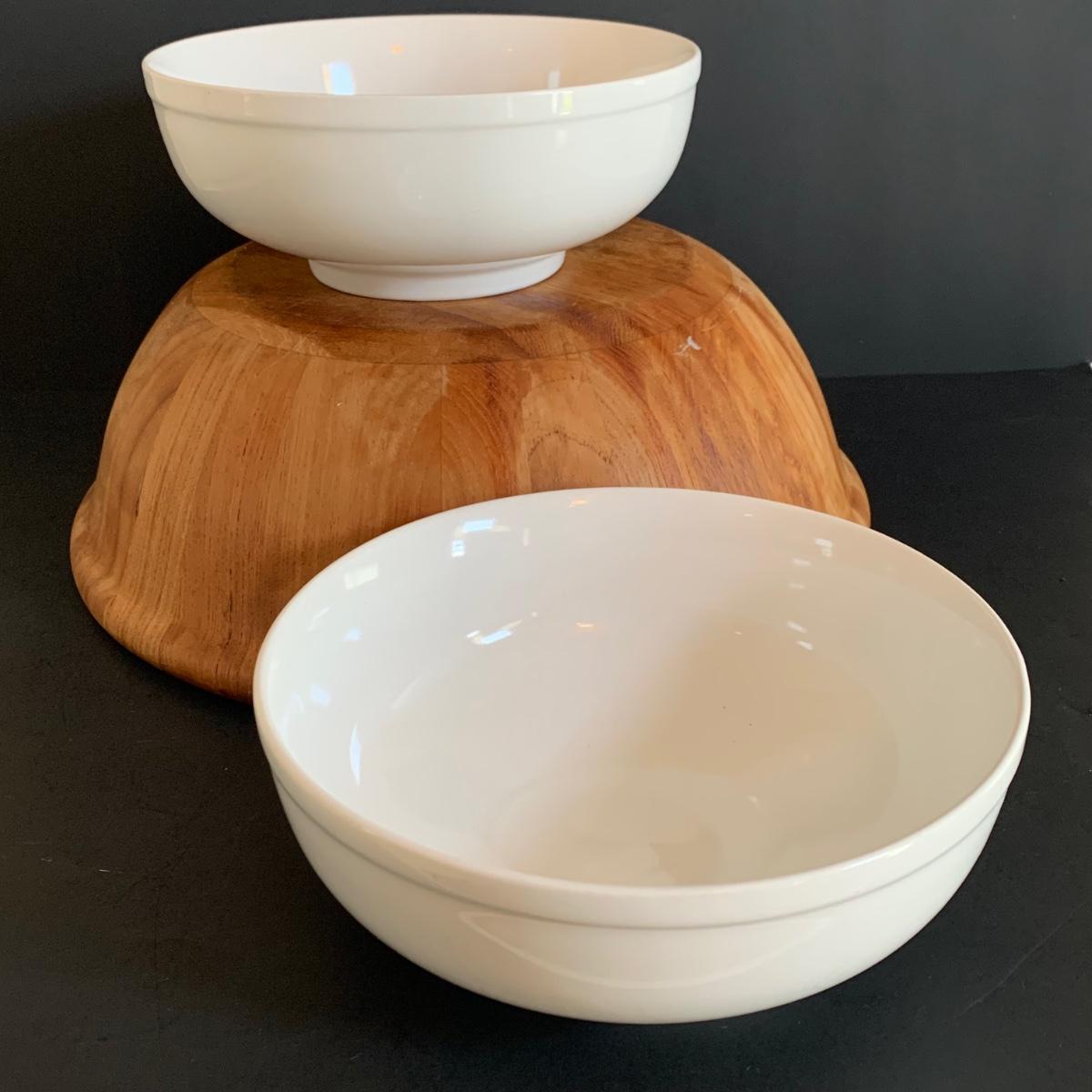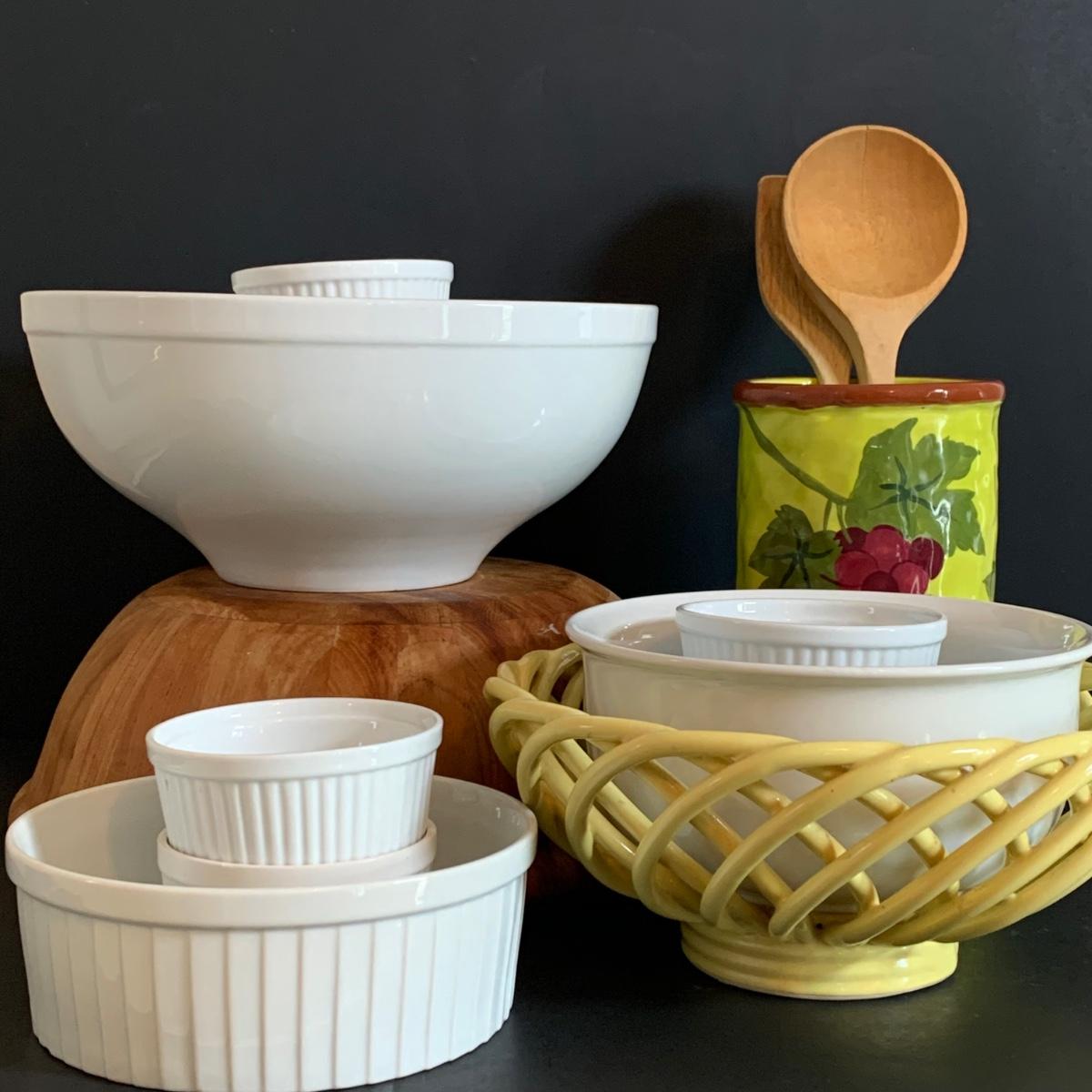 LOT 274: Kitchen Collection: Yellow Ceramic Woven Fruit /Bread Basket, The Cellar Wooden Salad Bowl, White Mixing Bowls, Ramekins & More
