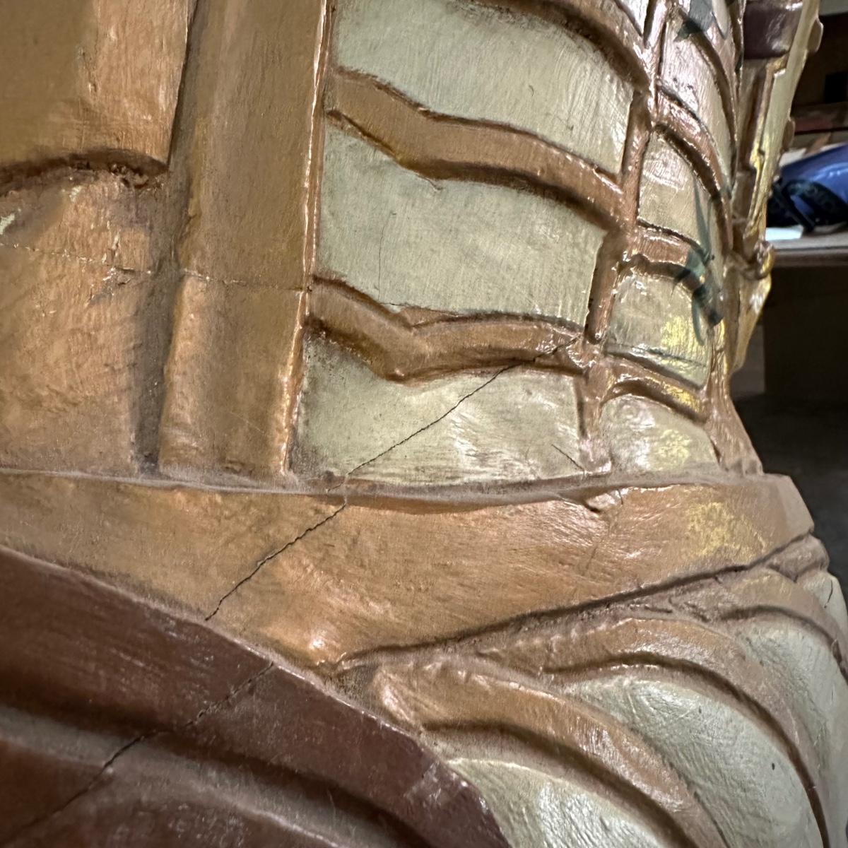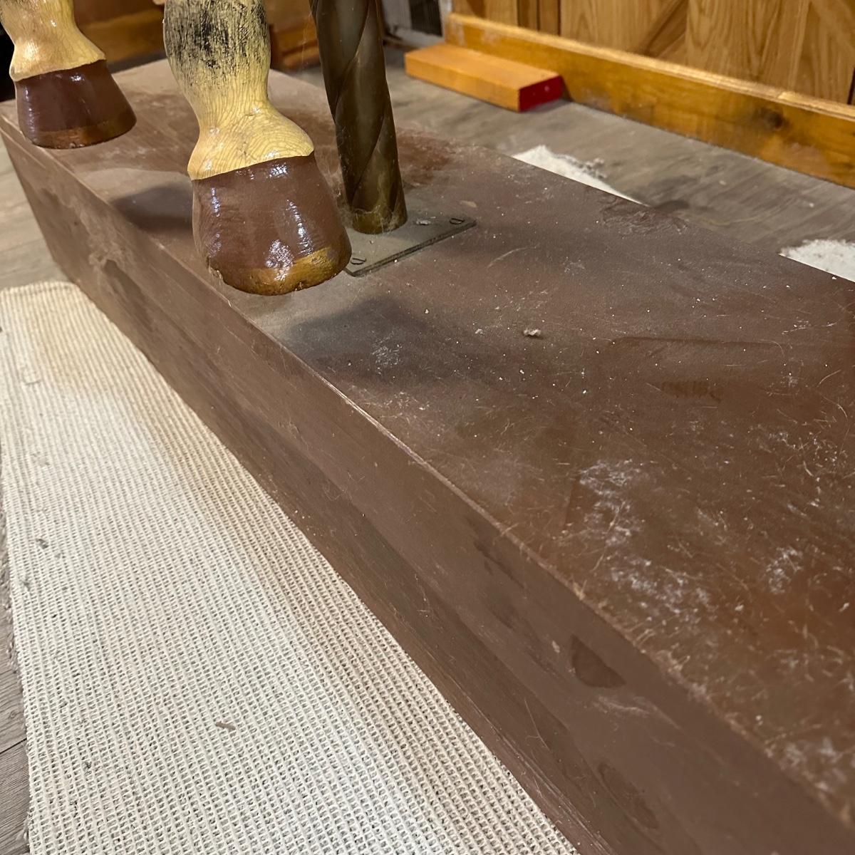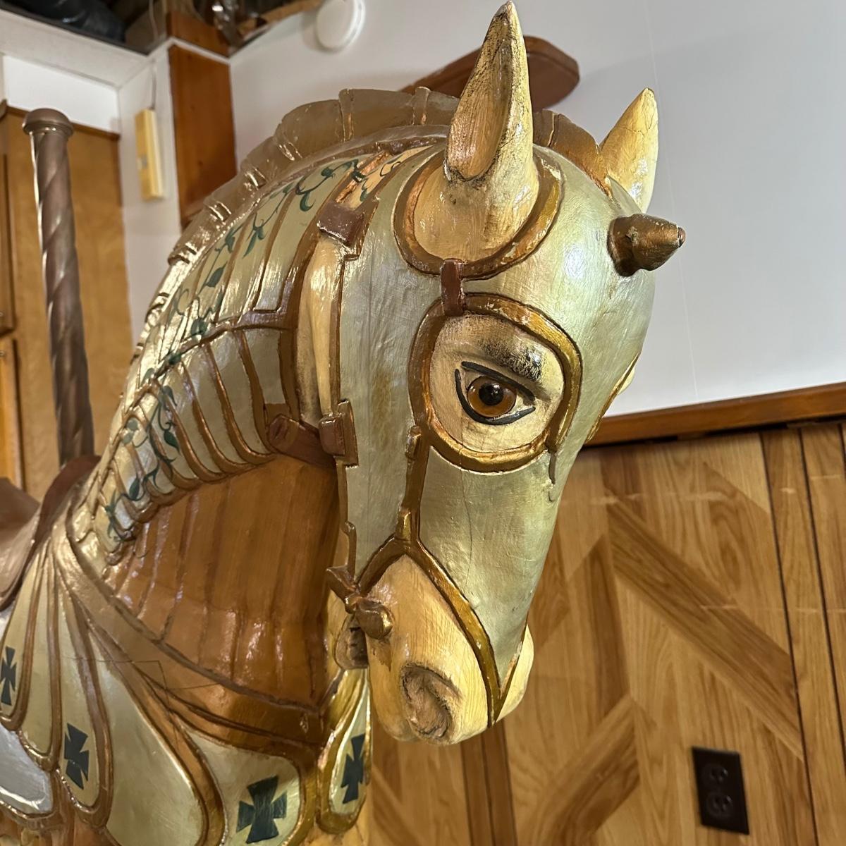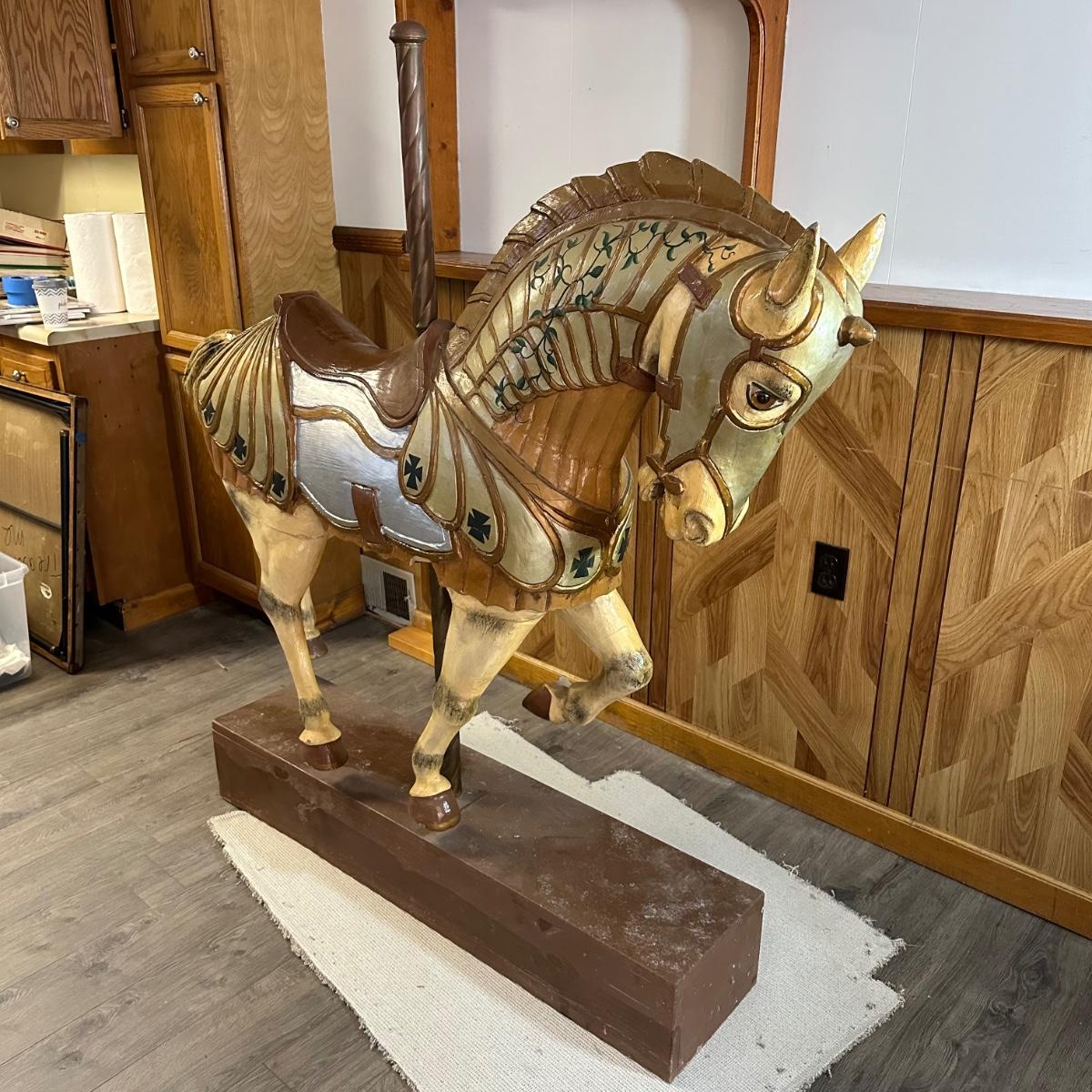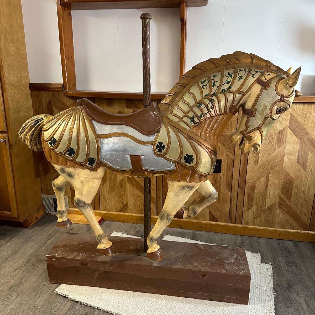 60.5 tall x 60 long, Some cracks and condition issues, Full Size Carousel Horse, very heavy please be prepared to move up stairs - Please see all pictures as they are the best representation of the items. The pictures show condition, measurements if taken, and what is included in the lot. Due to the large amount that we photograph and the time frame, we are not always able to take measurements. All items unless noted, are pre-owned and have been used. If you purchased furniture, you must bring help. We do not allow one person to carry large furniture out on their own. Bring help, tools and a truck for the safety of our client’s homes, and your personal safety. Any damages that result to the property including walls, and floors due to moving of the furniture will be charged to the buyer. Company policy. Thank you.