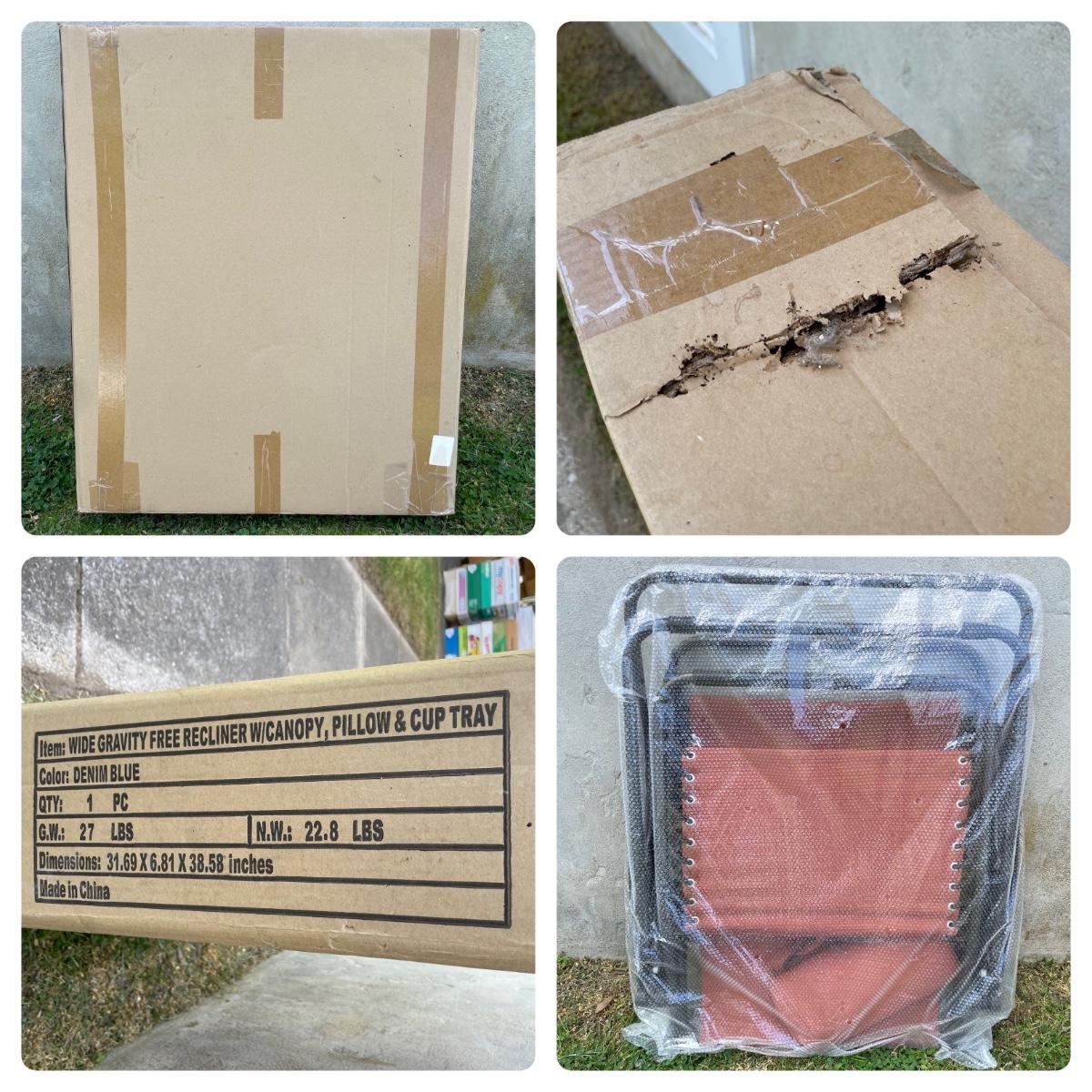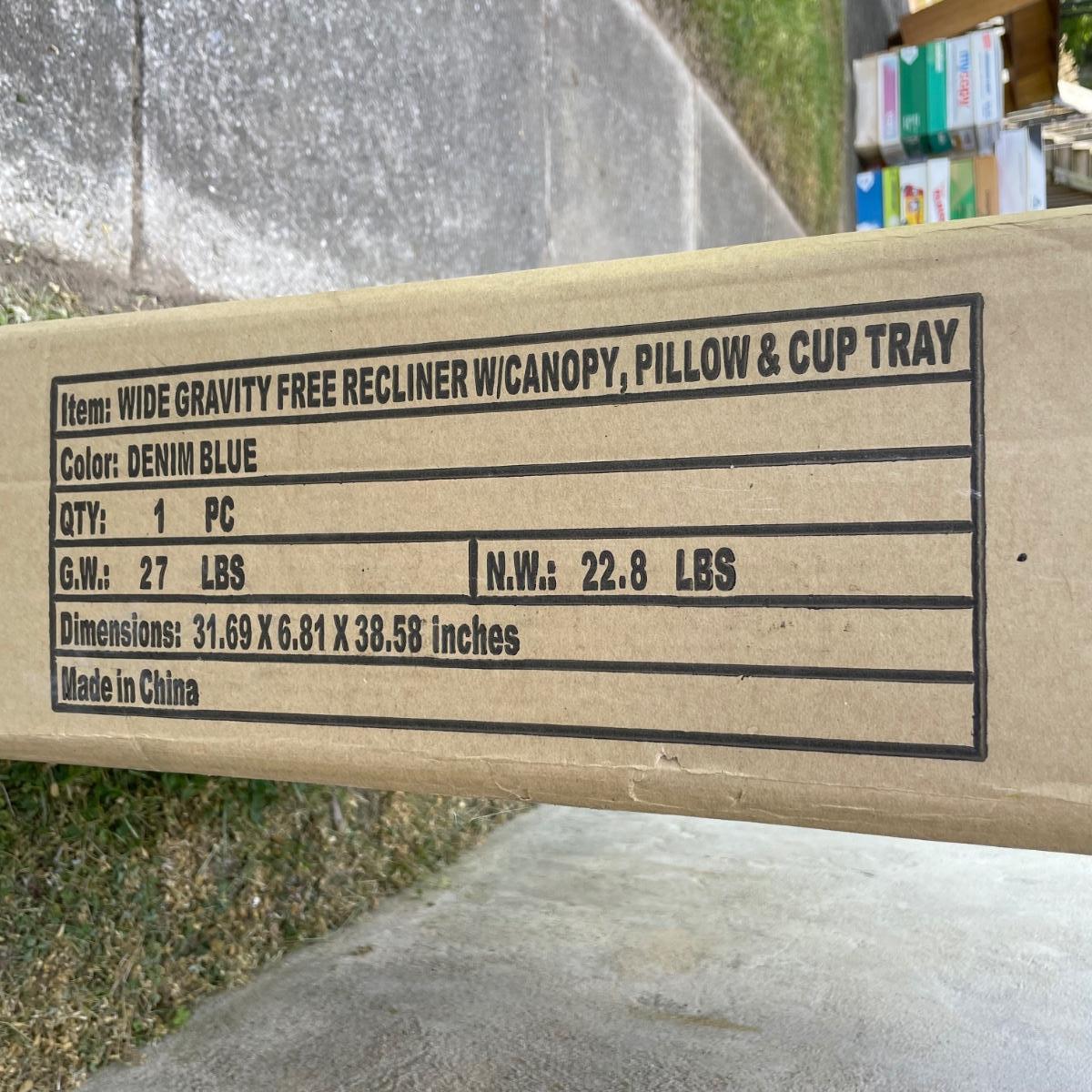 LOT 105: Wide Gravity Free Recliner, w/ Canopy, Pillow & Cup Tray (New in box)