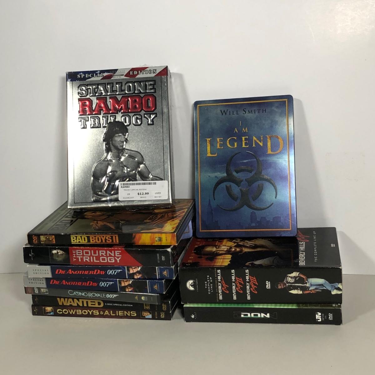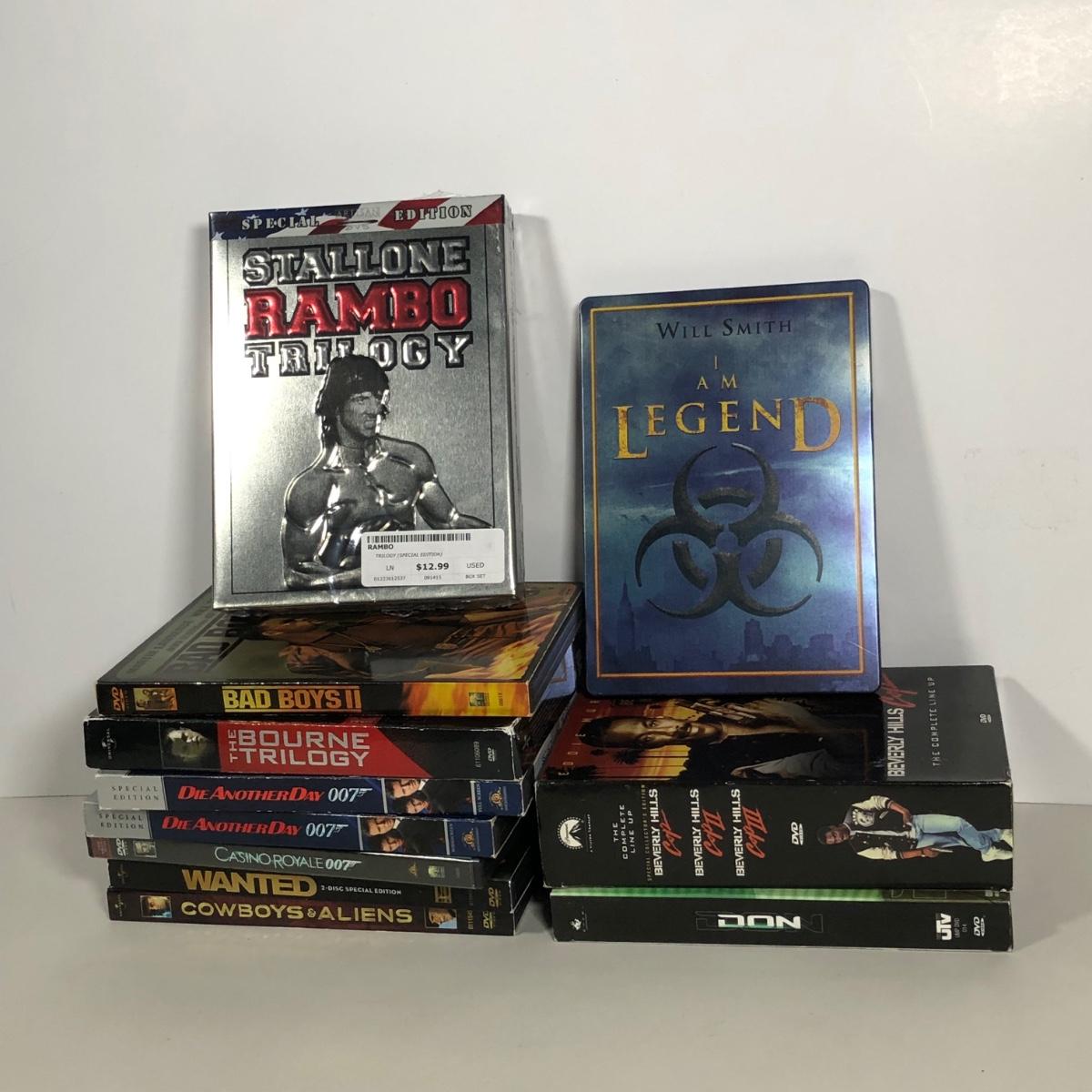 LOT 156: Action DVD Collection - I Am Legend Tin, Rambo Trilogy Special Edition, Beverly Hills Cop Trilogy, Bourne Trilogy, James Bond & More