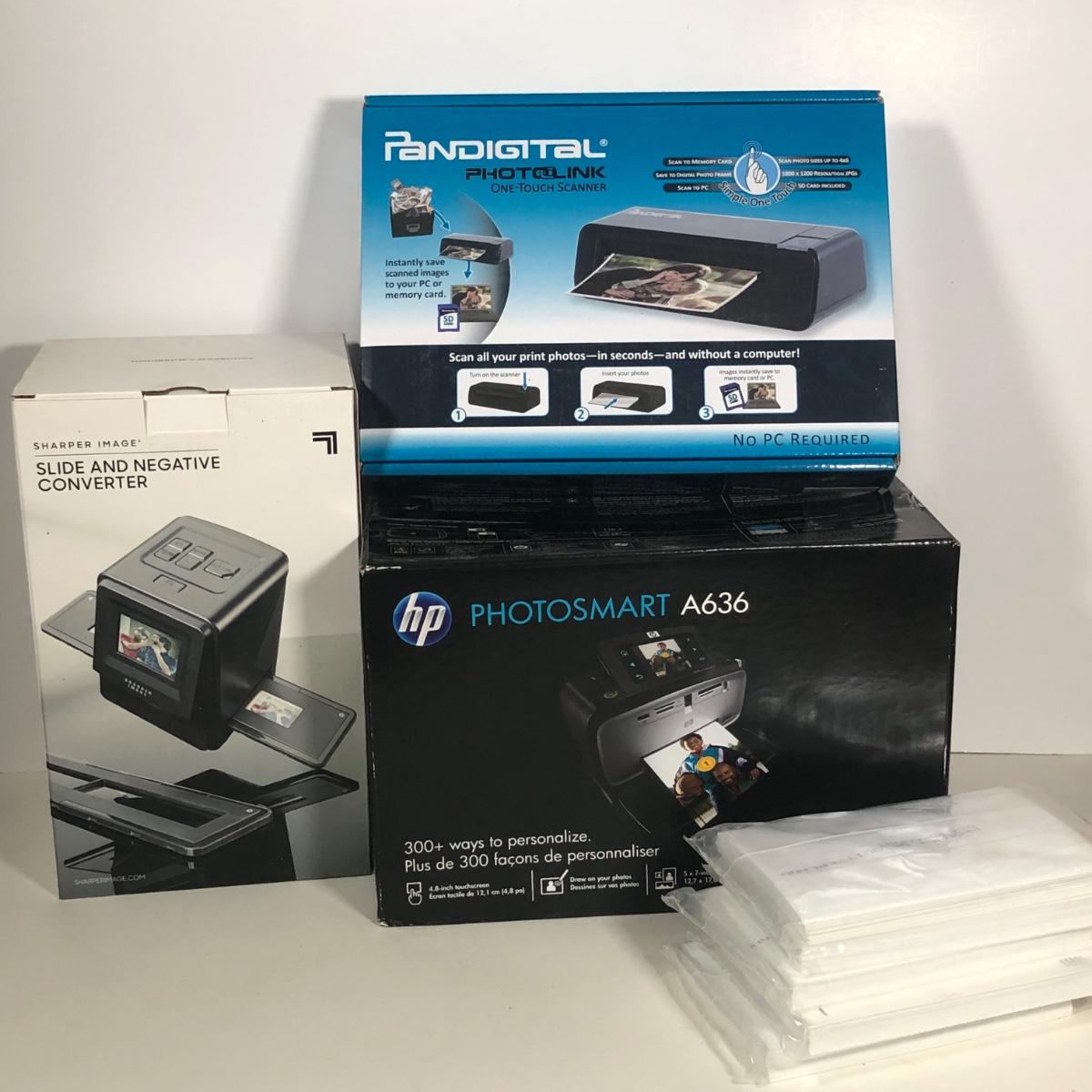 LOT 168: NIP - HP Photosmart A636 Photo Printer, Pandigital Photo Link One Touch Scanner & Sharper Image Slide and Negative Converter