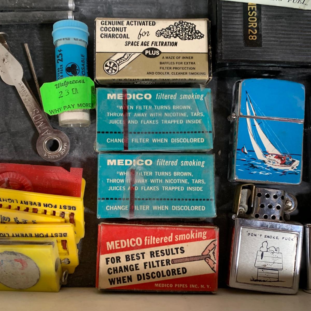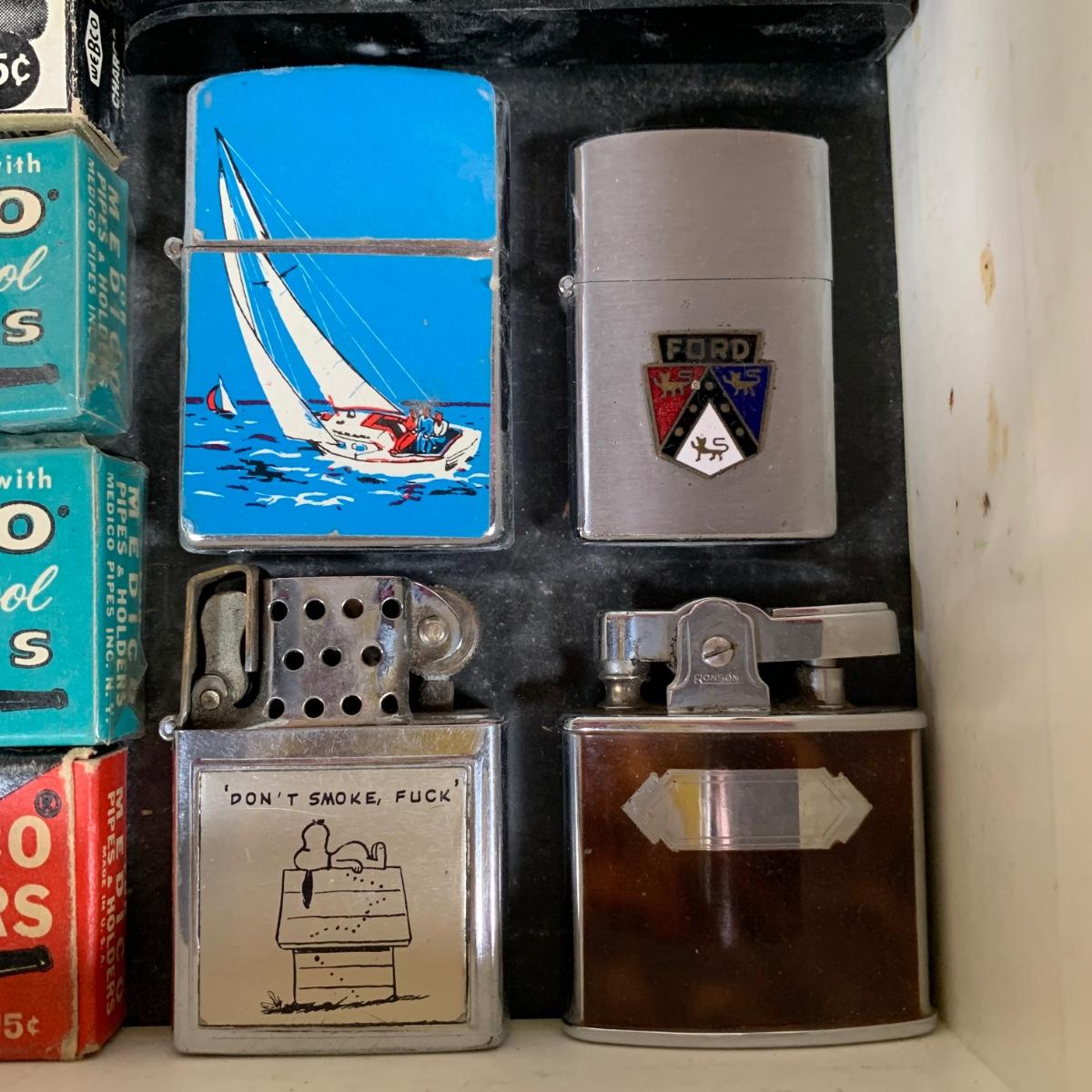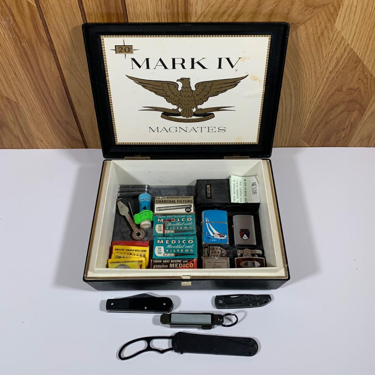 LOT 234: Vintage Sharp Smoke Collection: Pocket Knives, Lighters, Flint, Filters, & Pocket Sharpener