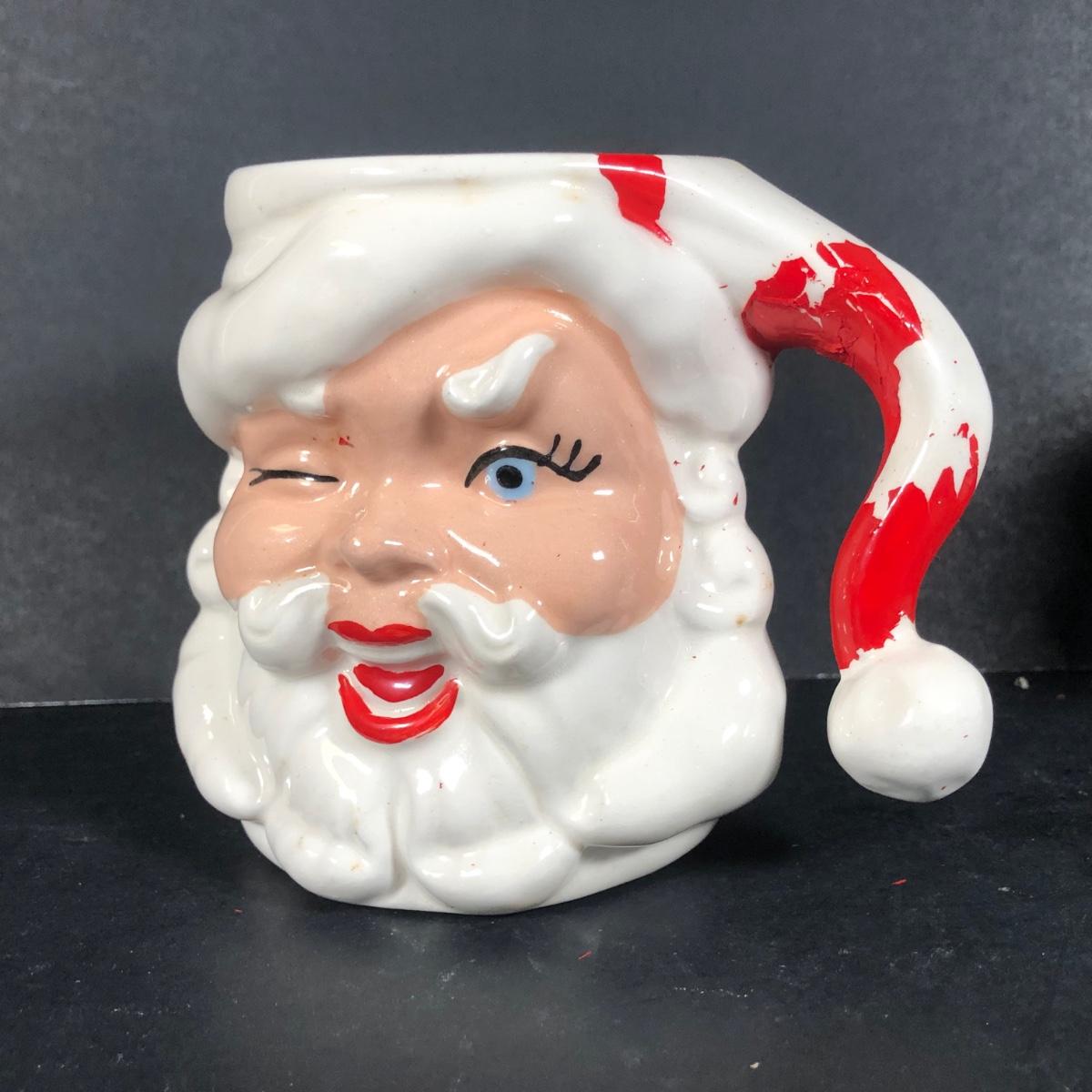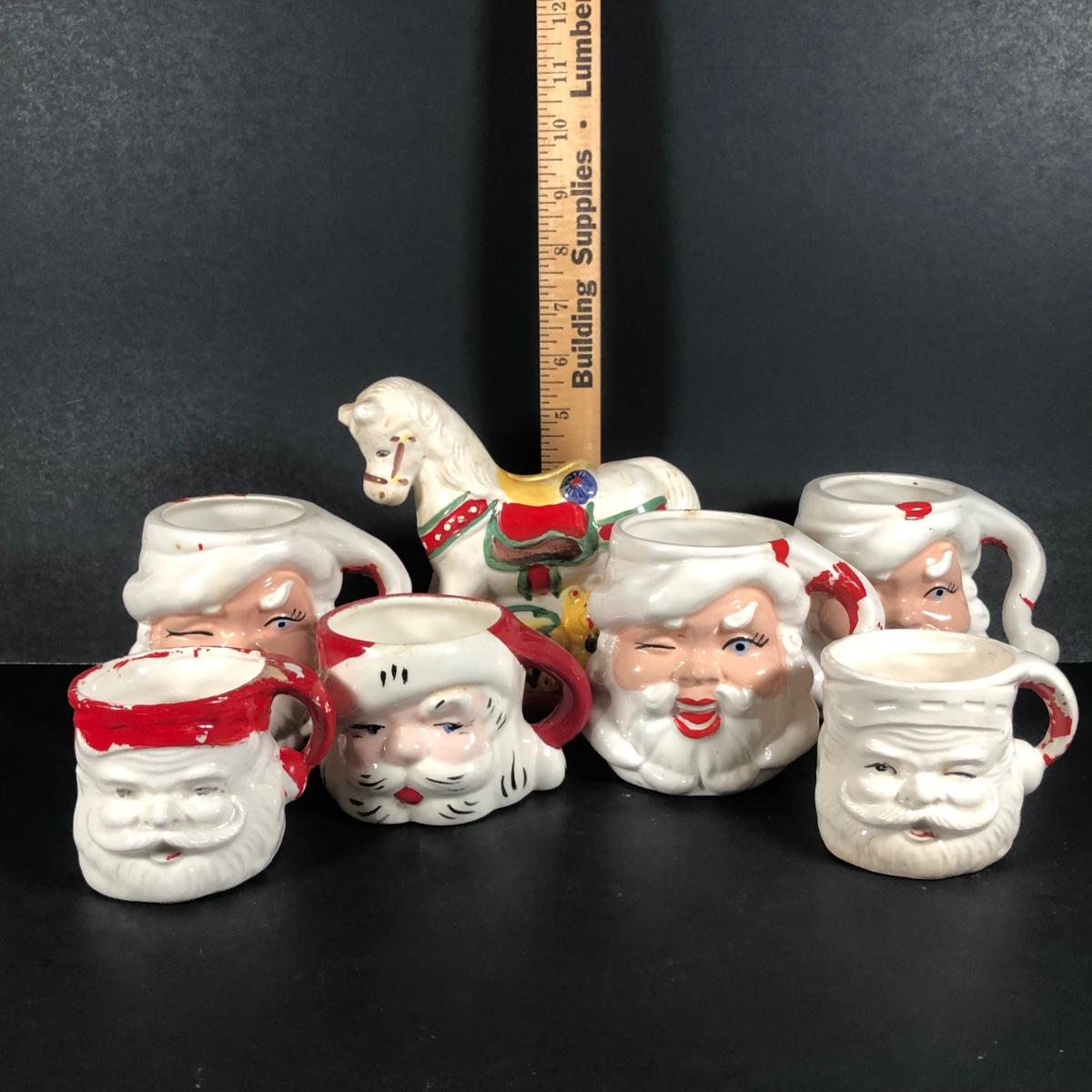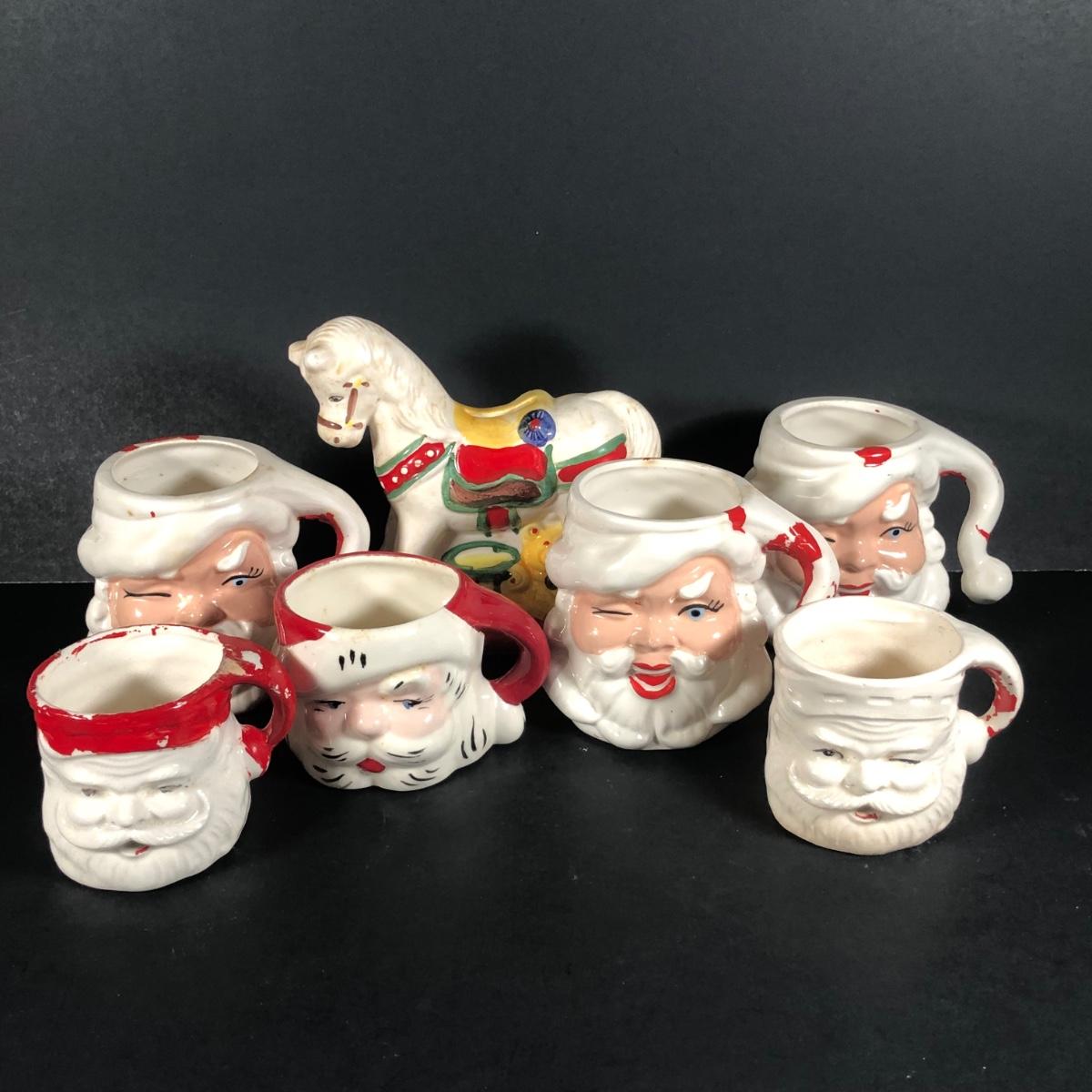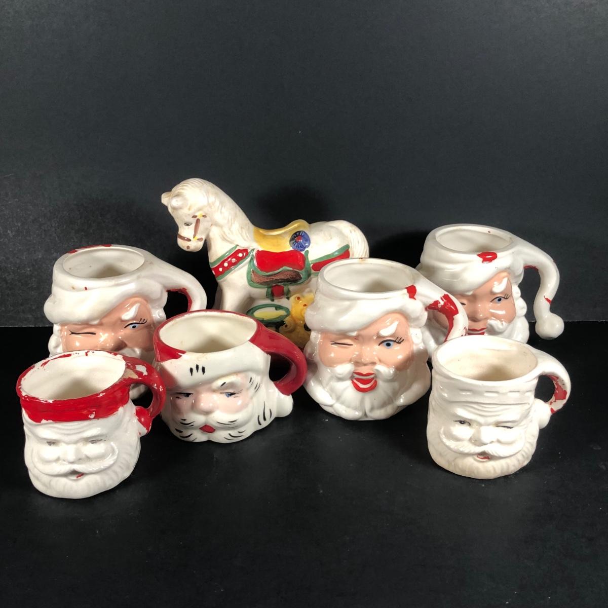 LOT 262: Vintage Santa Head Mugs & Christmas Rocking Horse Coin Bank