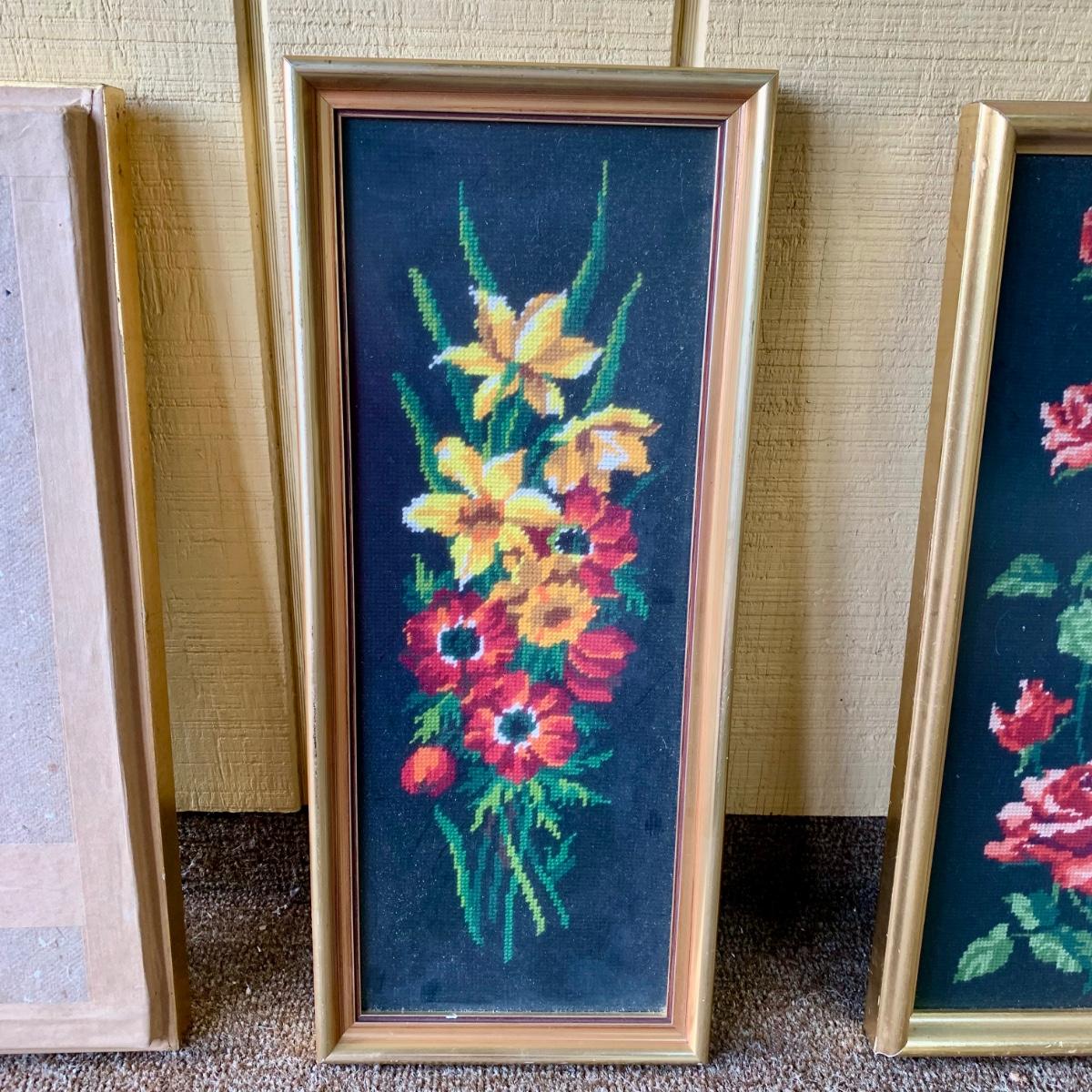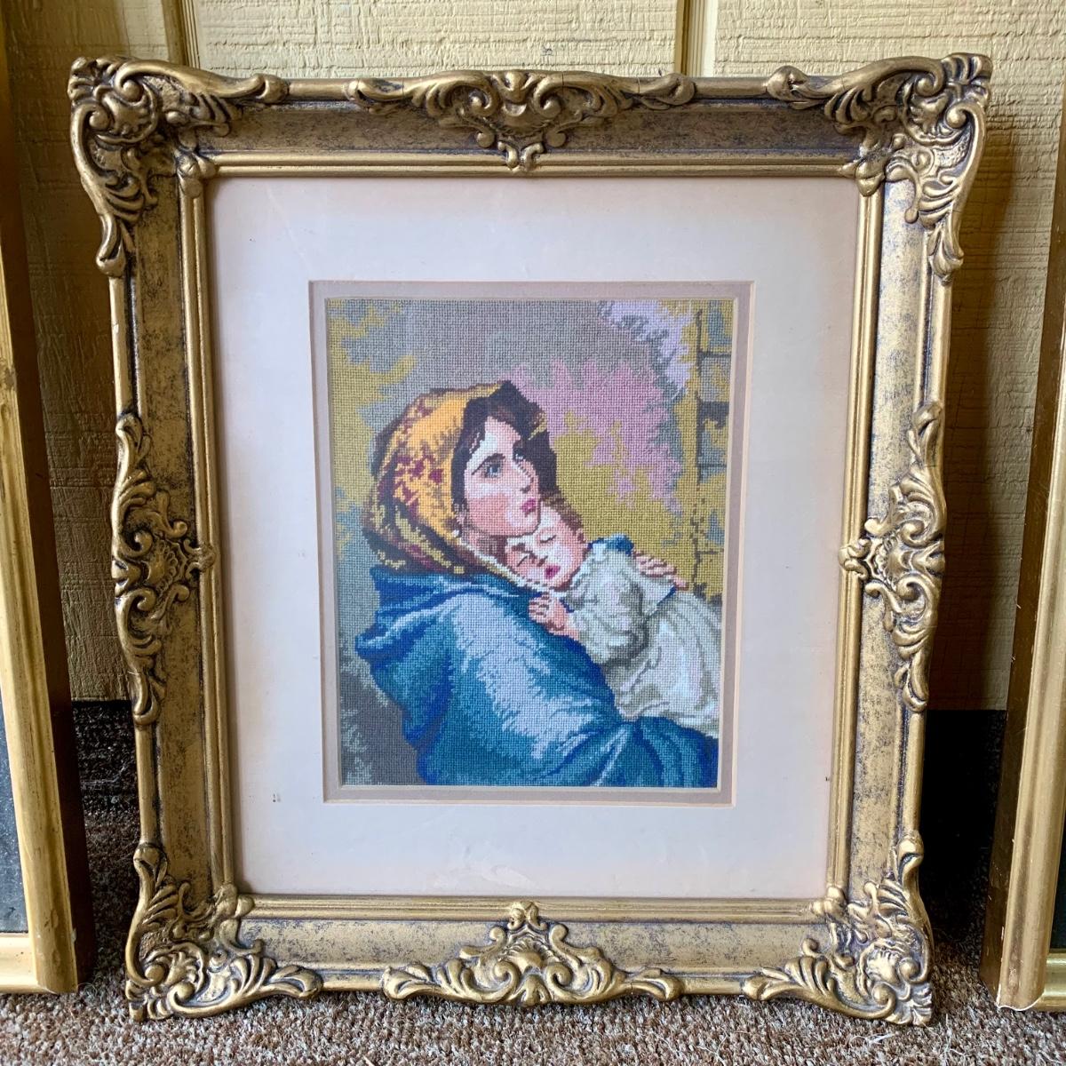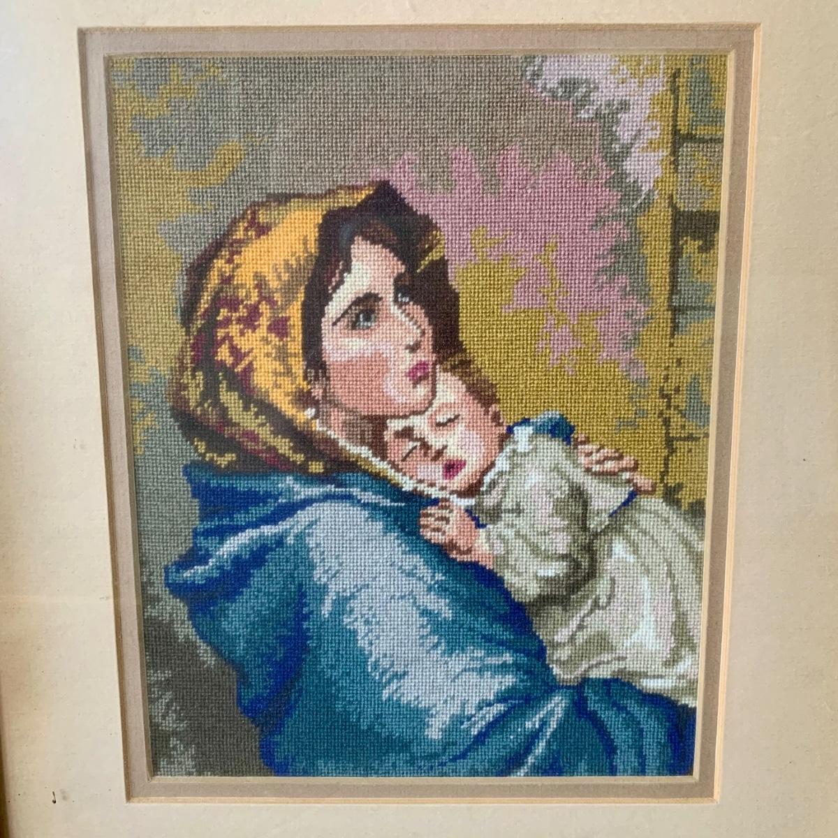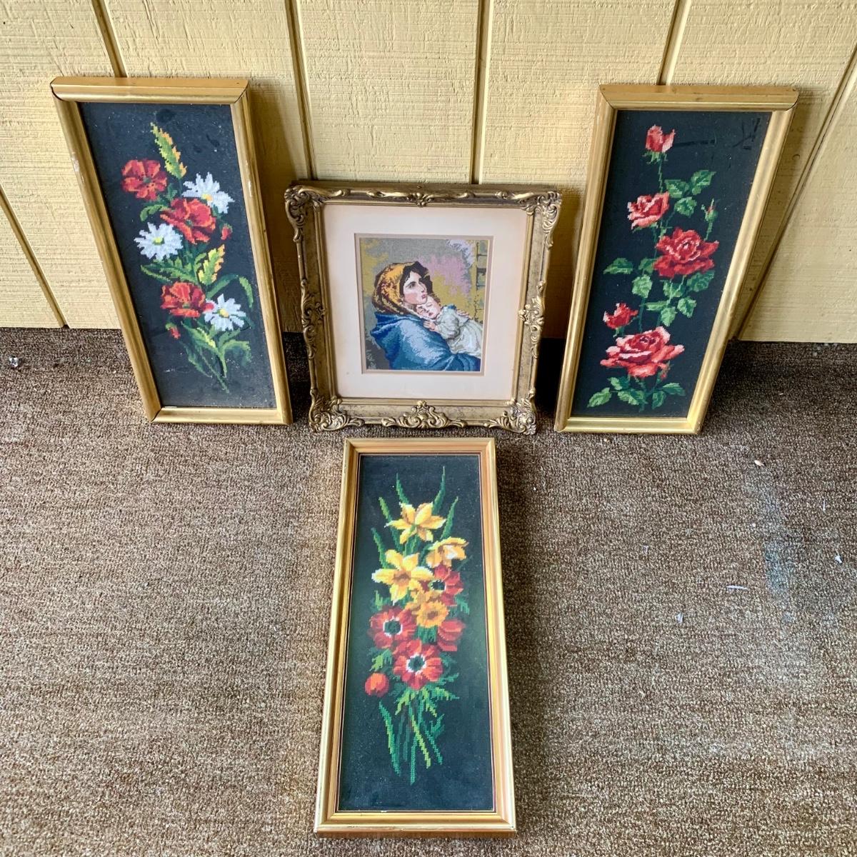 LOT 14 P: Vintage Framed Needlepoint Collection: Mother & Child (Madonna Of The Streets) & Floral Bouquets W/ Roses