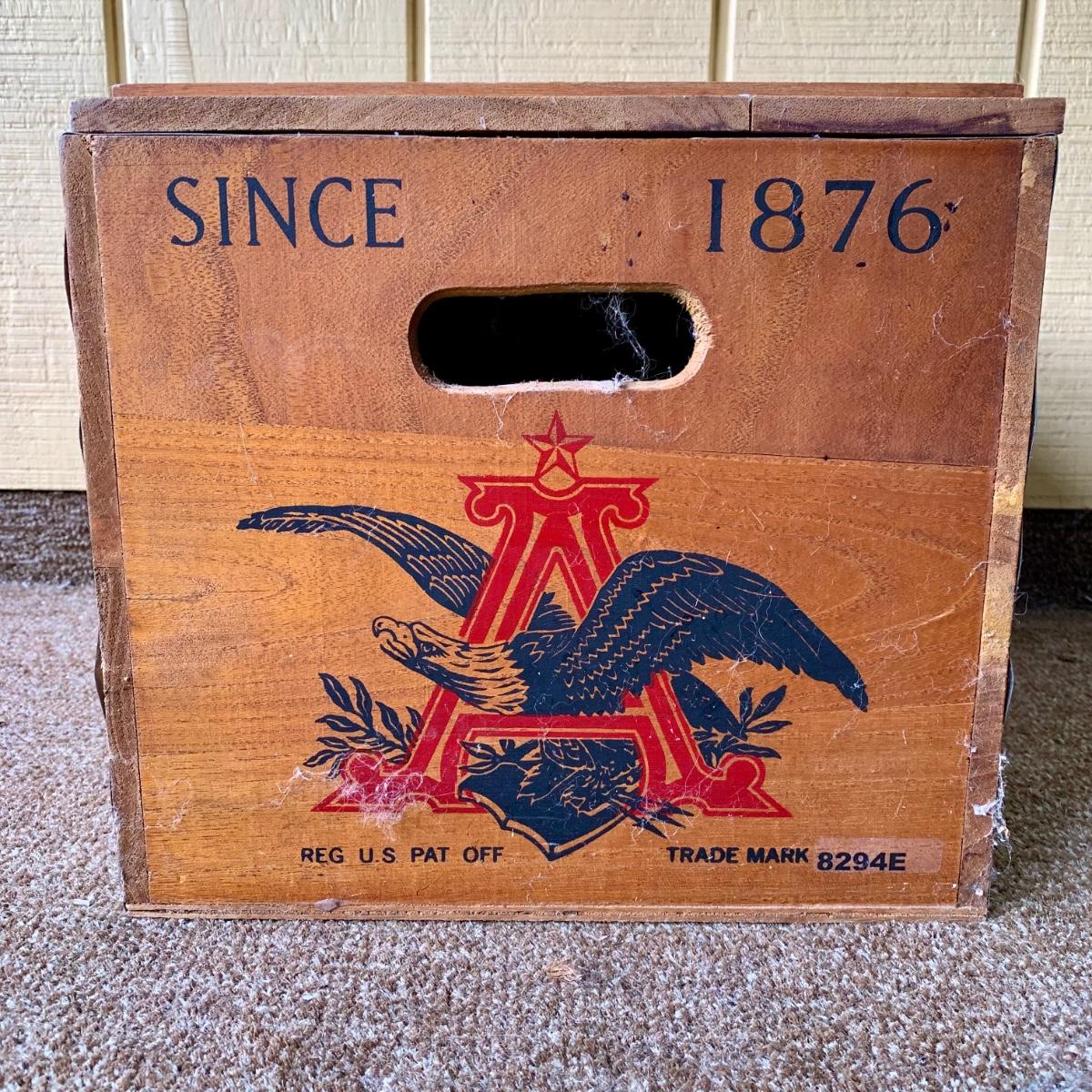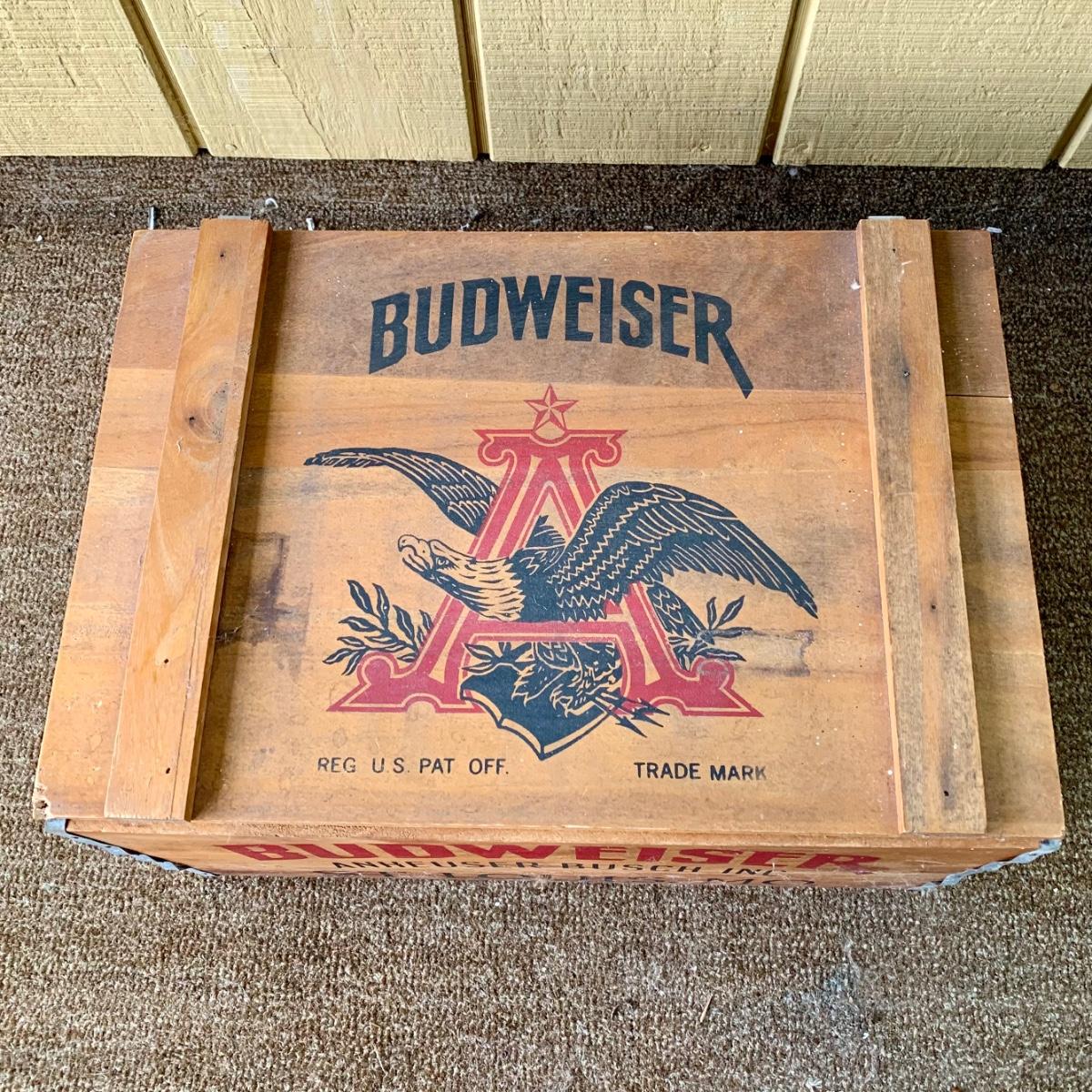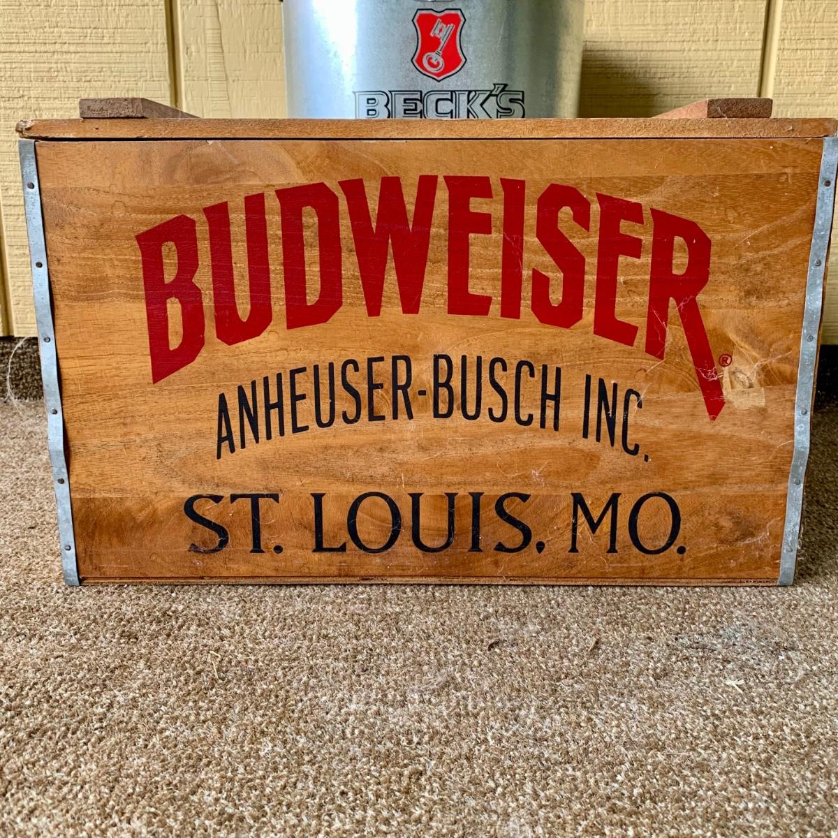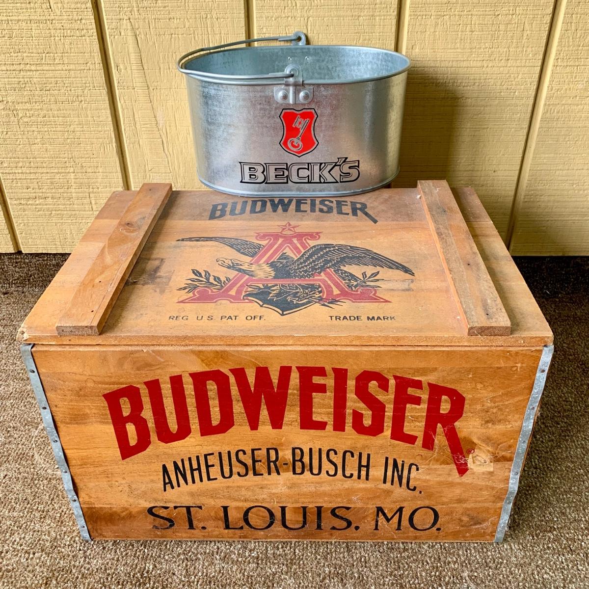 LOT 15 P: Vintage Anheuser Busch Budweiser Wooden Crate/Box W/Hinges & Beck's Beer Ice Bucket