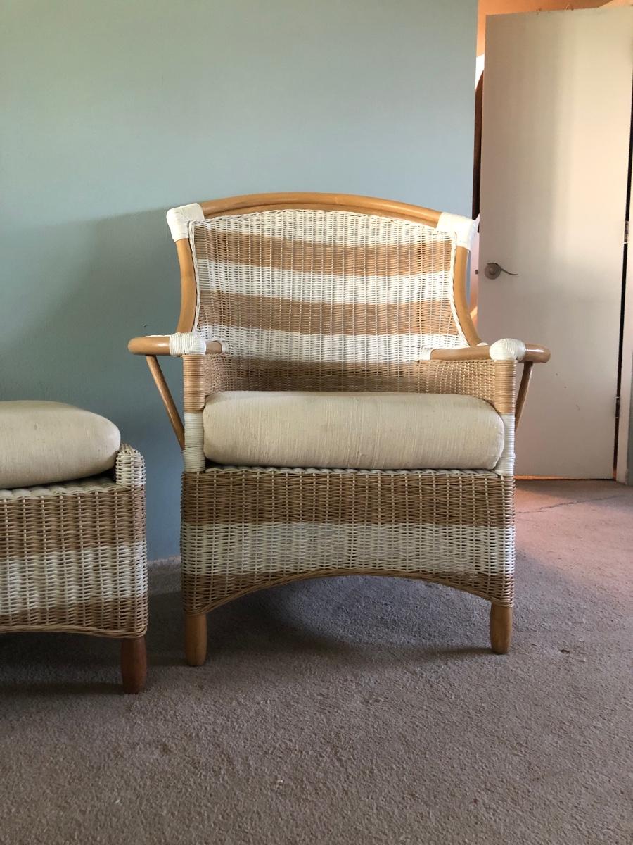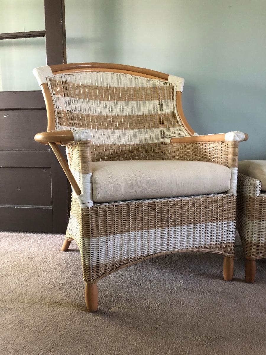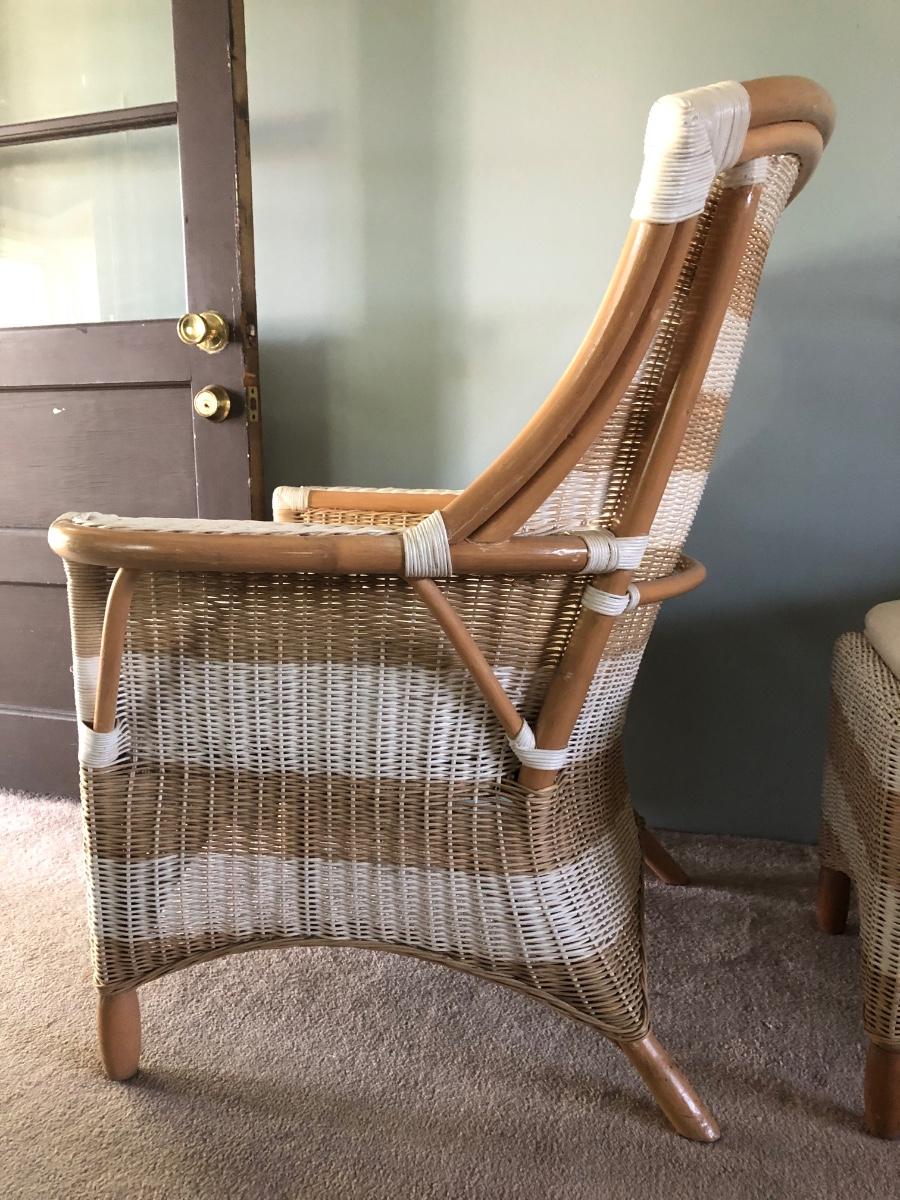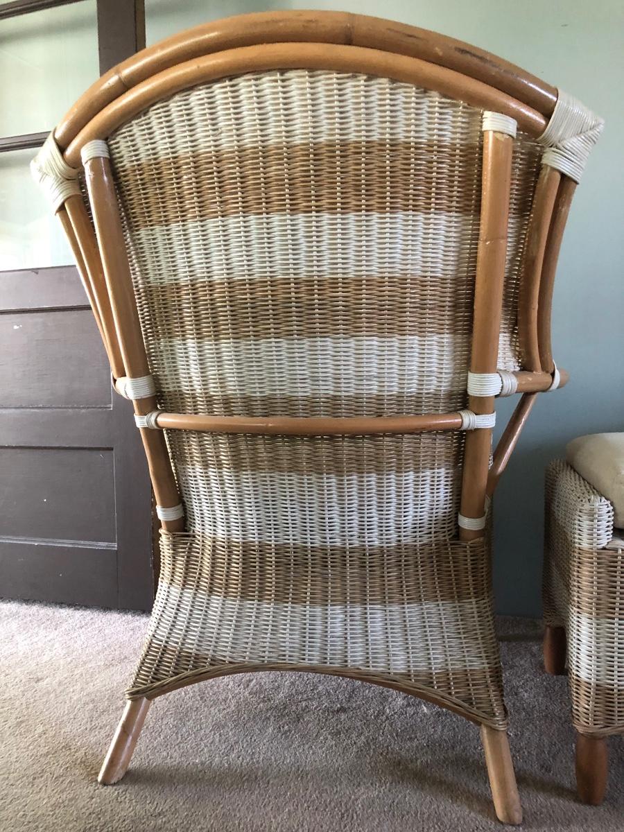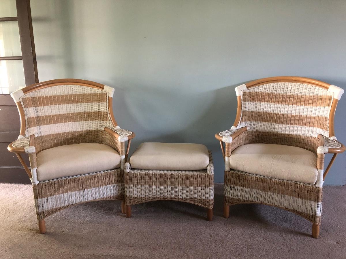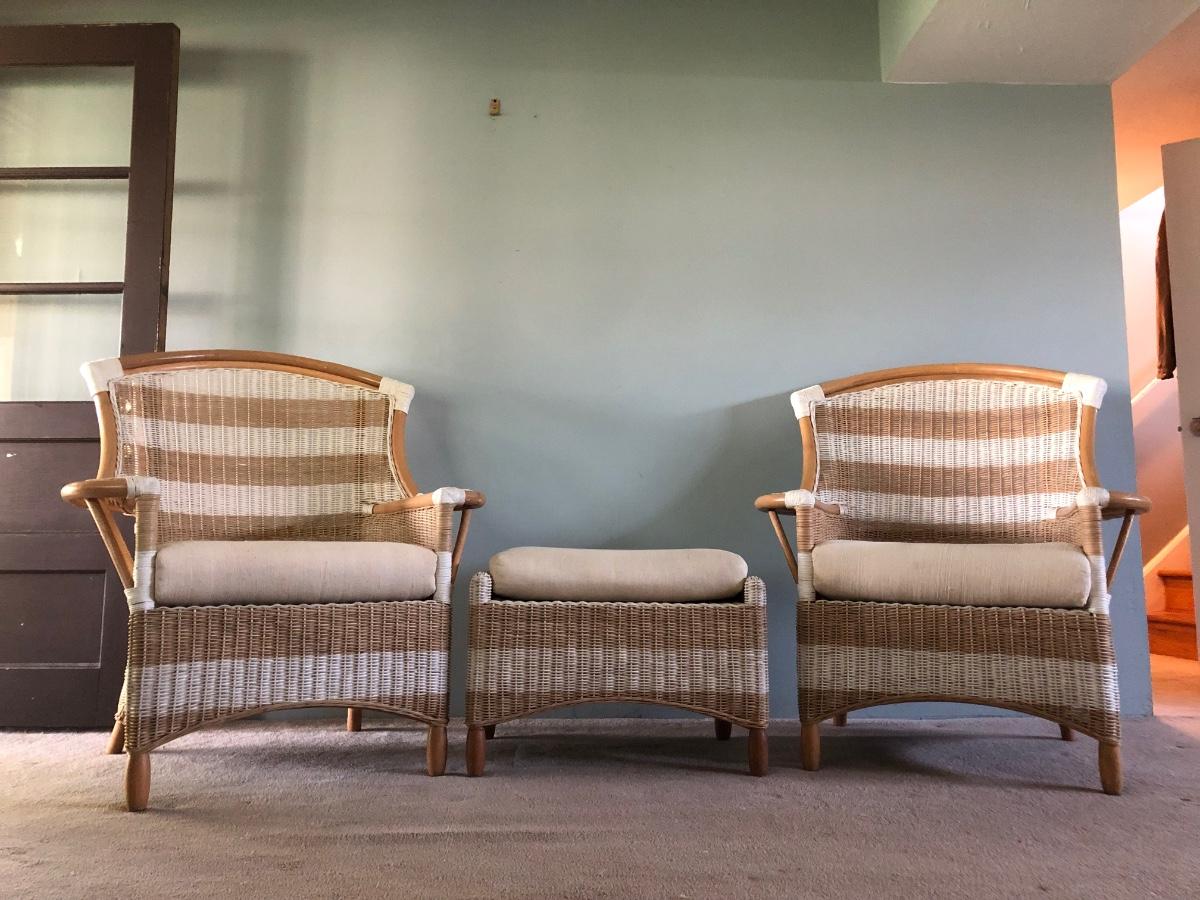 LOT 21B: Two Matching Striped Wicker Chairs w/ Footstool & Cushions