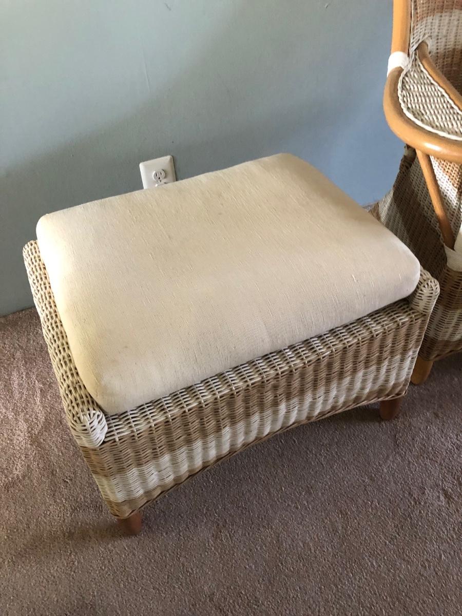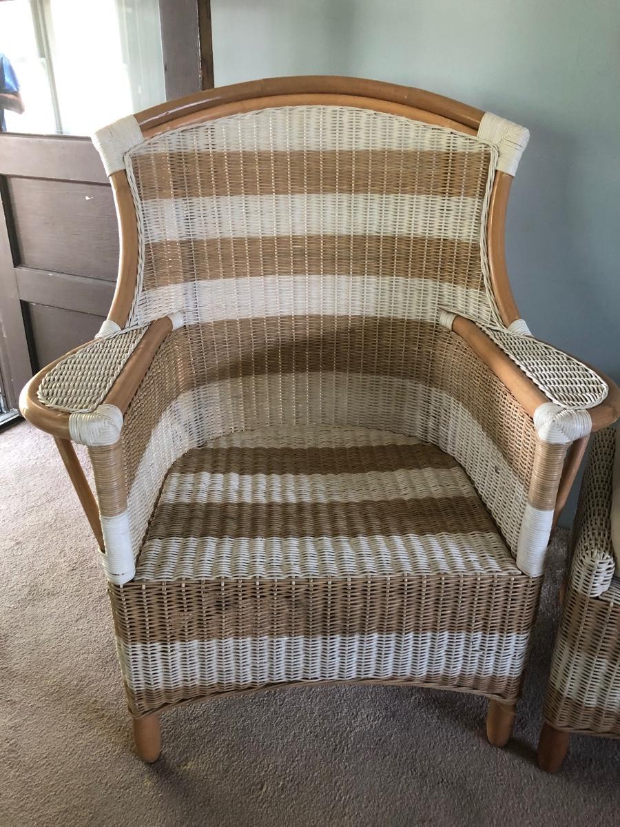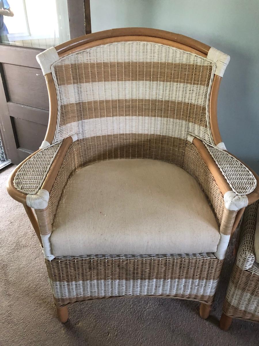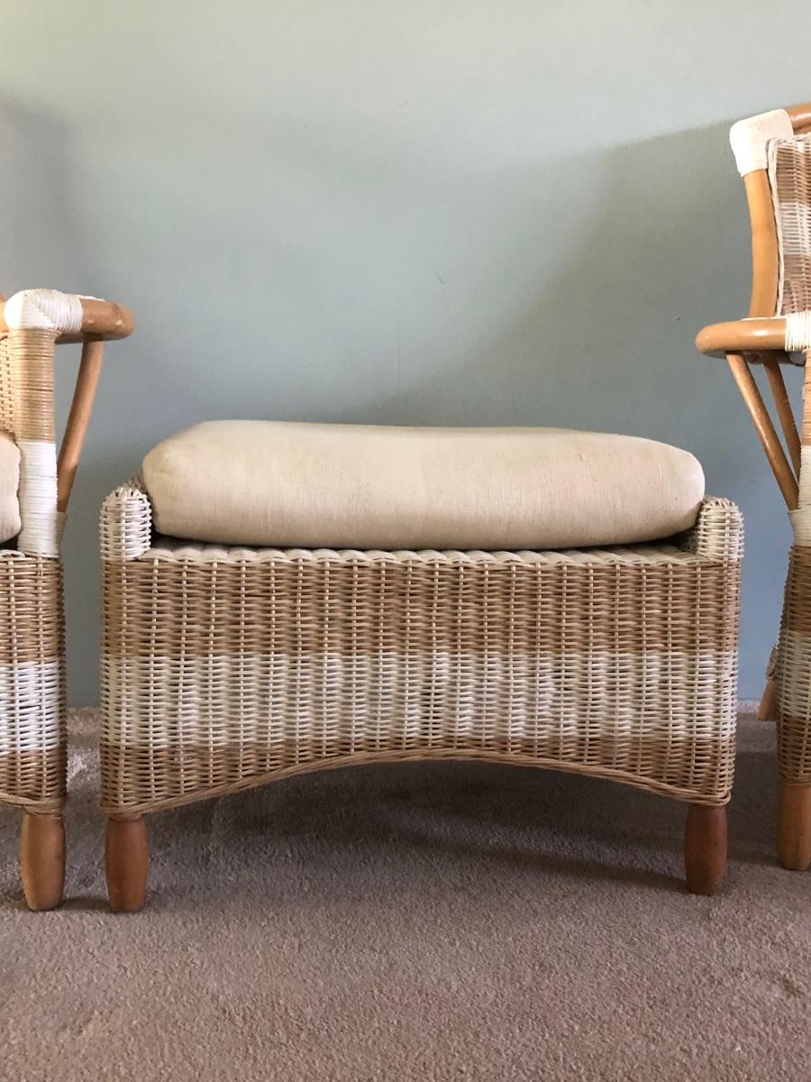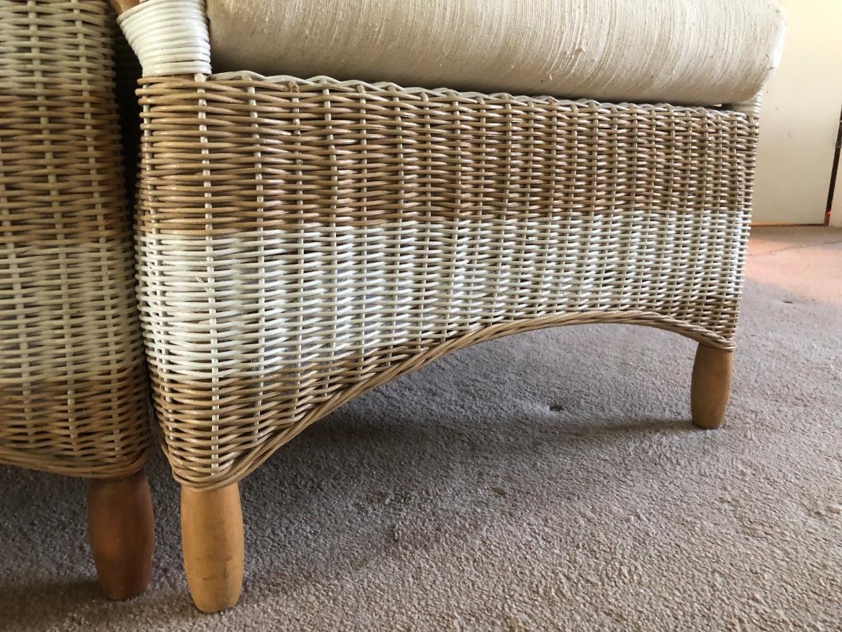 LOT 21B: Two Matching Striped Wicker Chairs w/ Footstool & Cushions