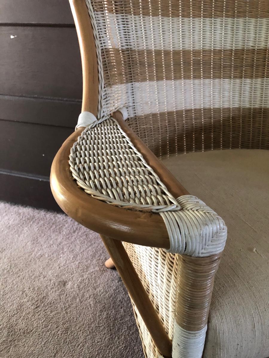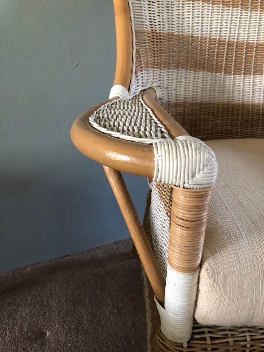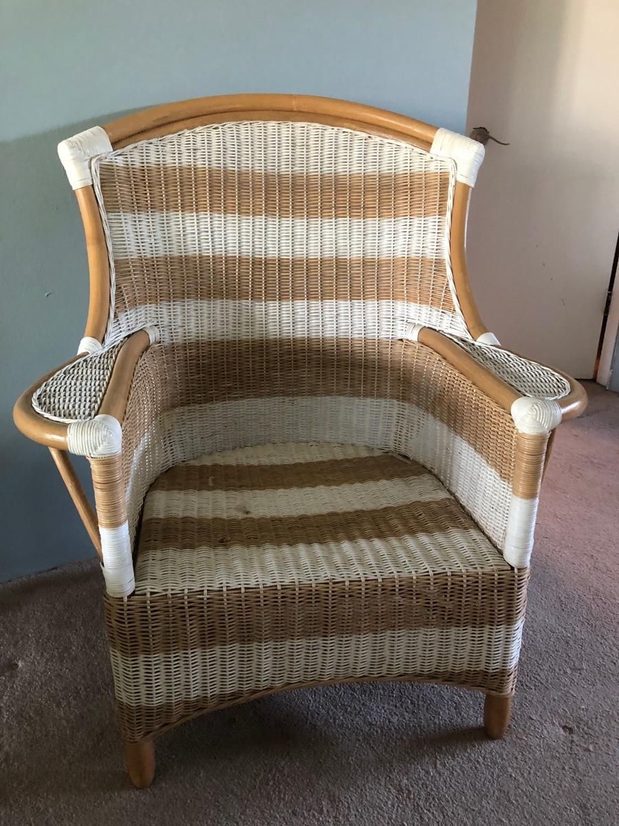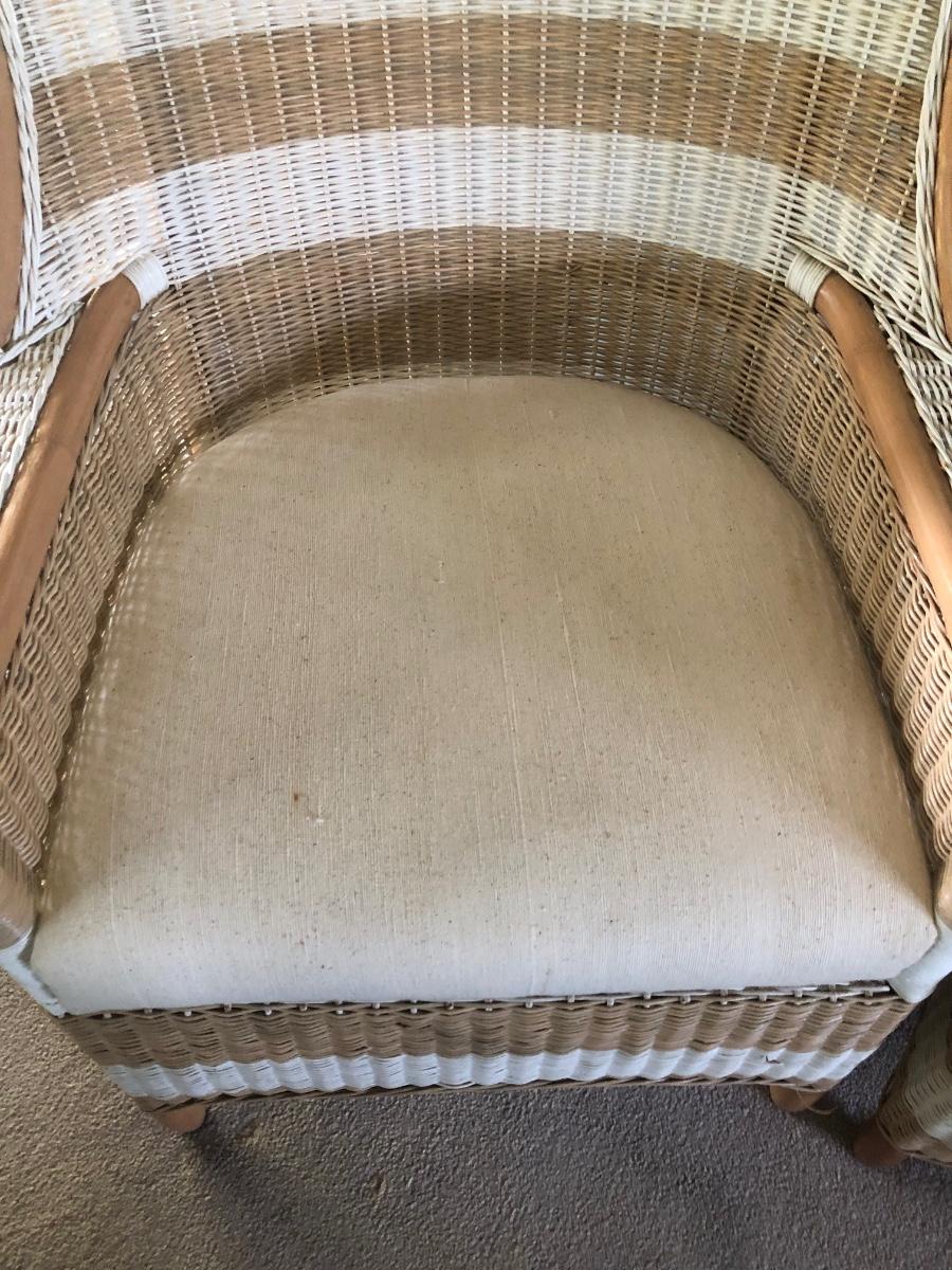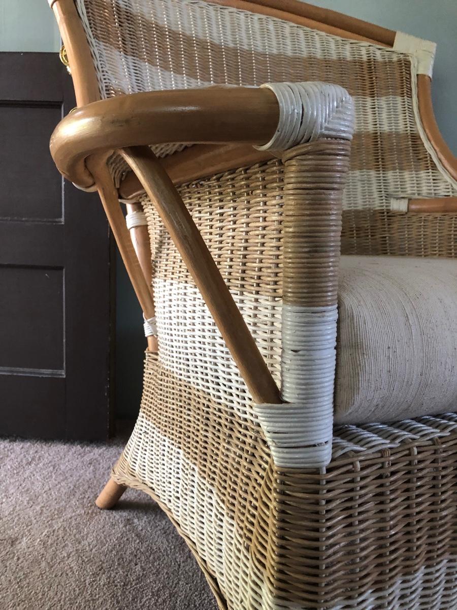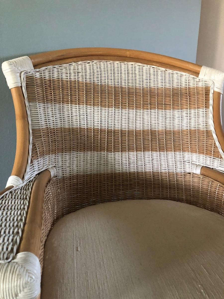 LOT 21B: Two Matching Striped Wicker Chairs w/ Footstool & Cushions