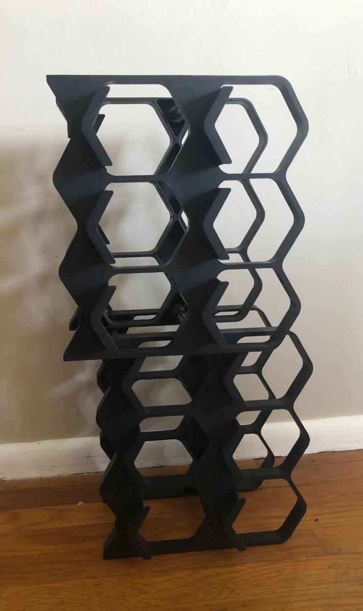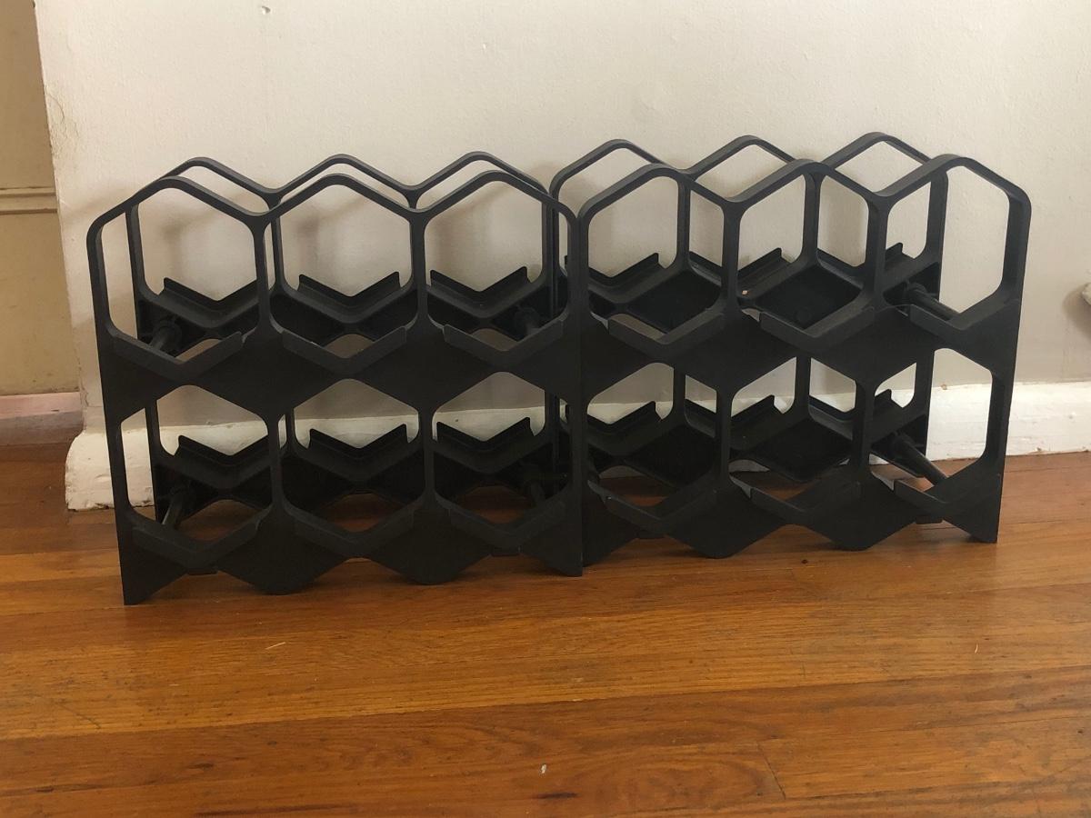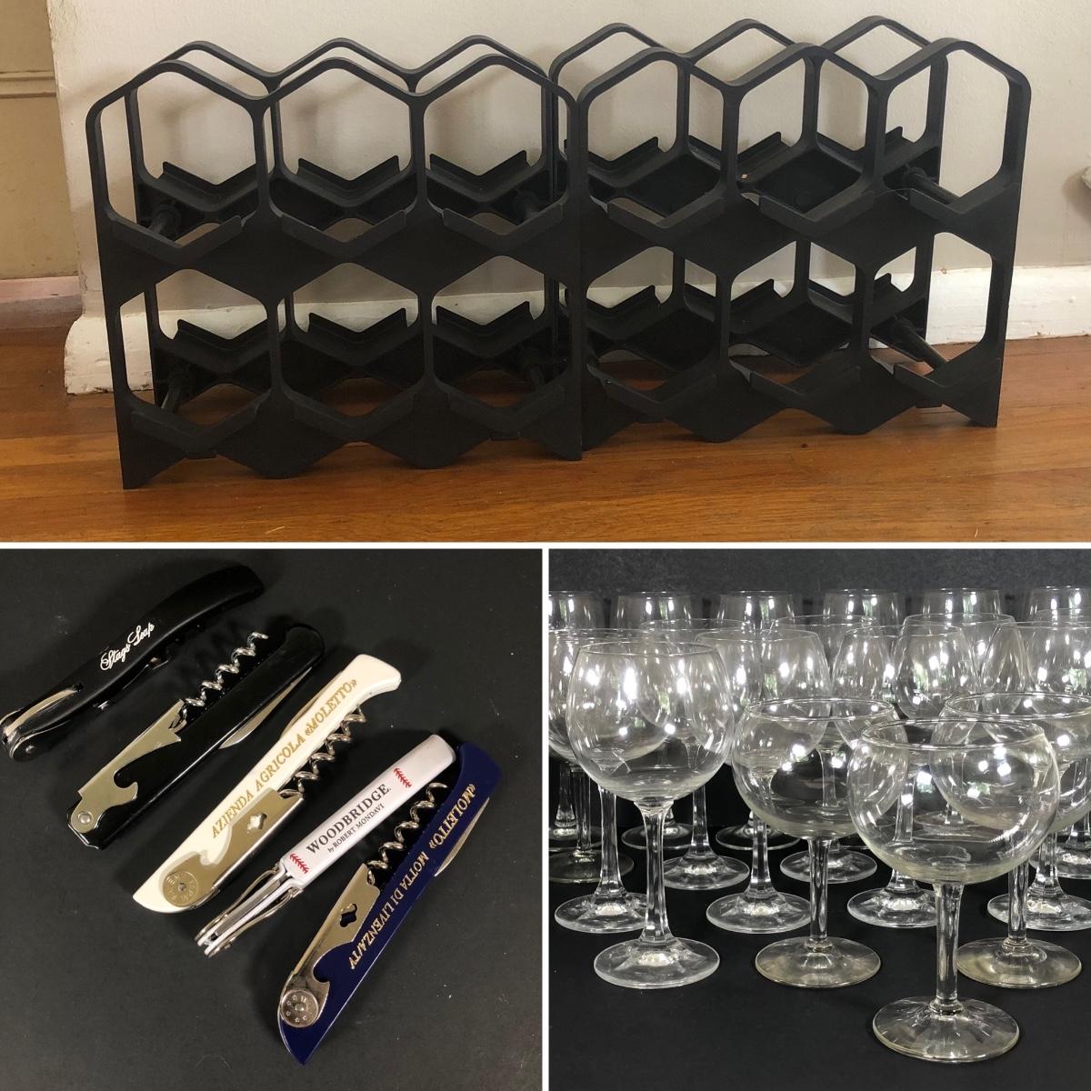 LOT 77K: Honeycomb Wine Rack w/ Wine Corks & Large Collection of Wine Glasses
