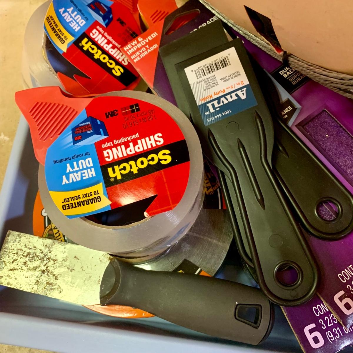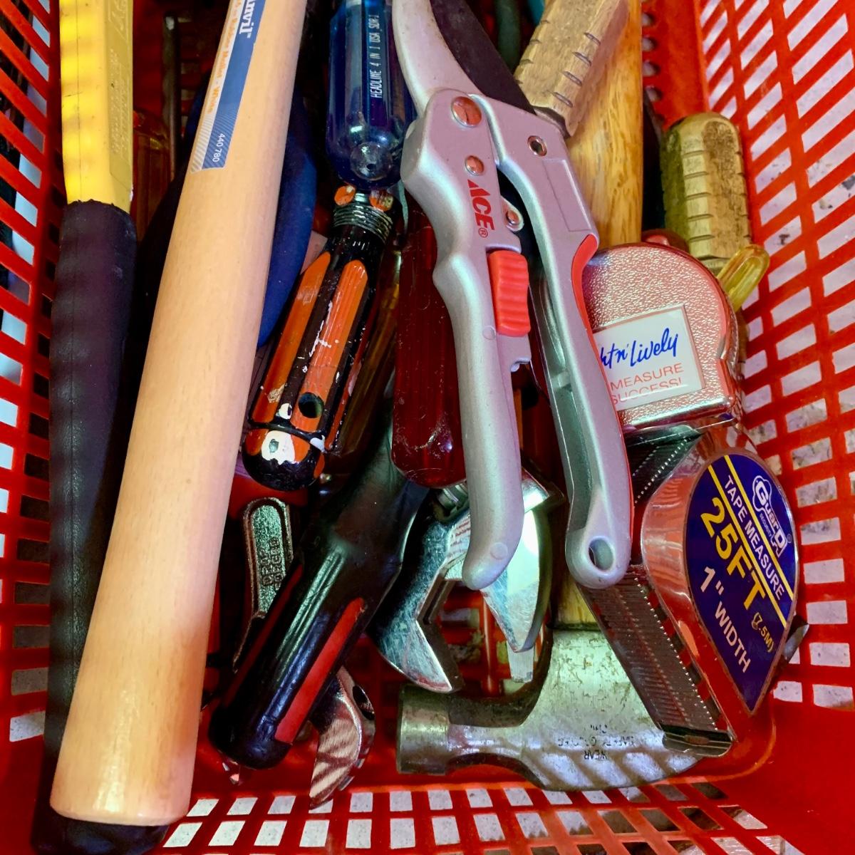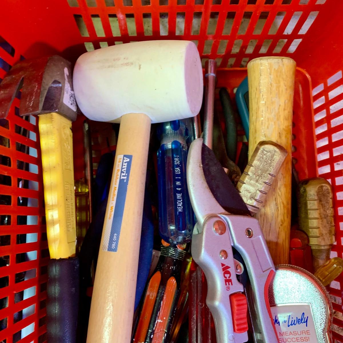 LOT 108 G: Misc. Tool Collection: Snips, Hammers, Screwdrivers, Scotch Packing Tape, & More